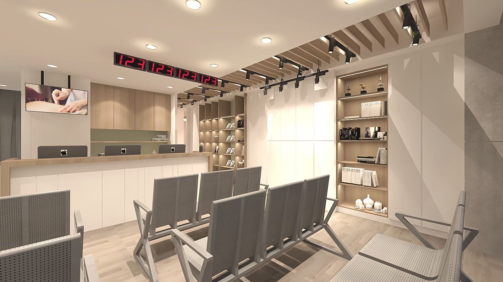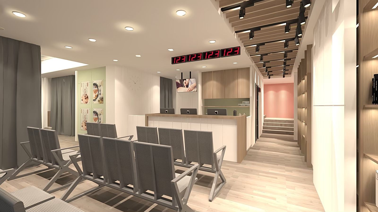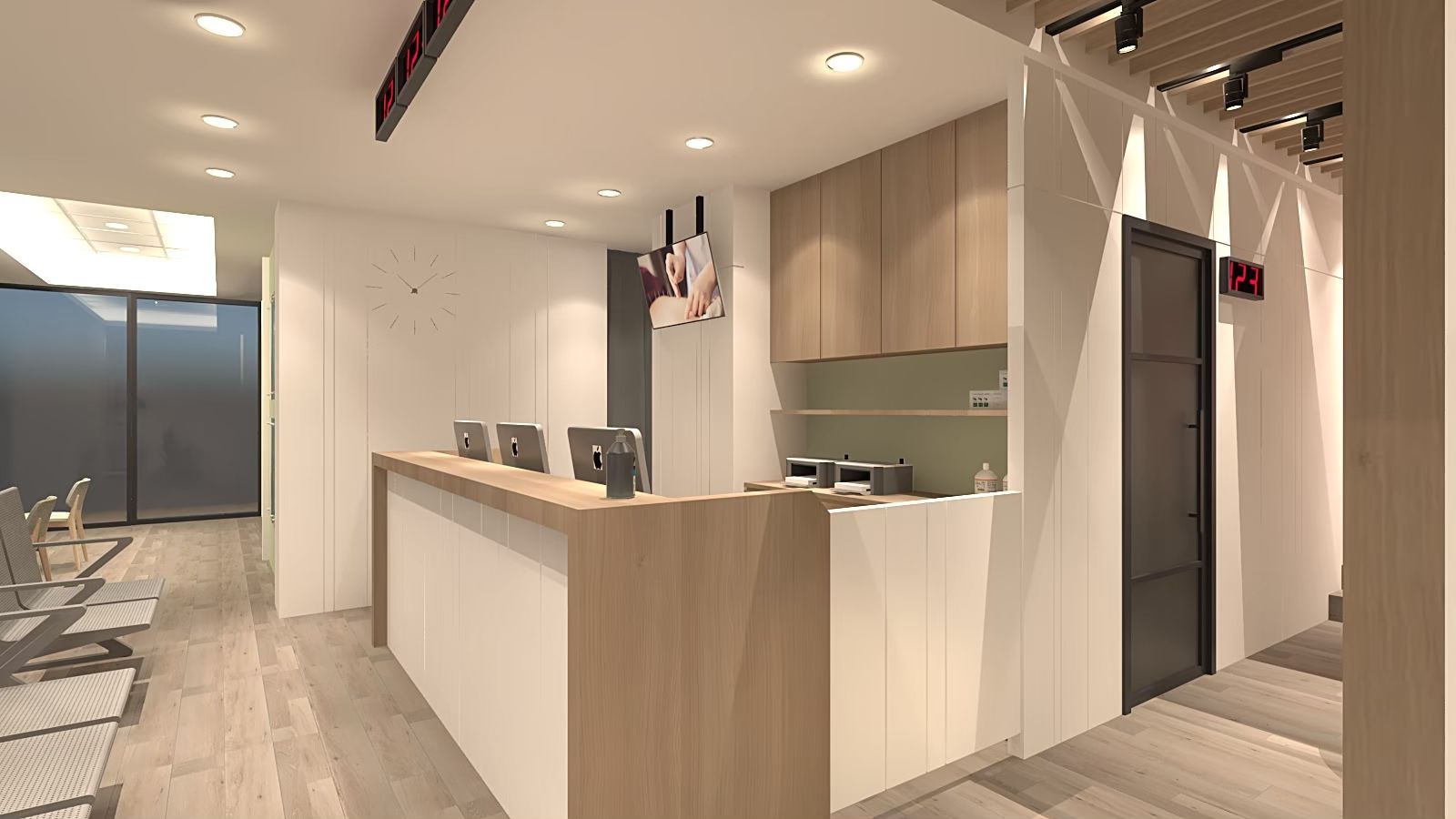 候診與接待區以乾淨俐落的風格呈現,牆面與地板以淺木色與白色為基調,搭配灰色座椅,營造出專業而舒適的氛圍。天花板的木格柵設計結合嵌燈與軌道燈,光線分布均勻,並增添層次感。