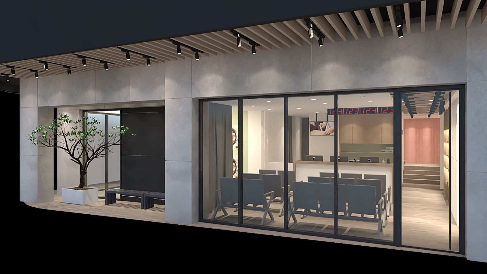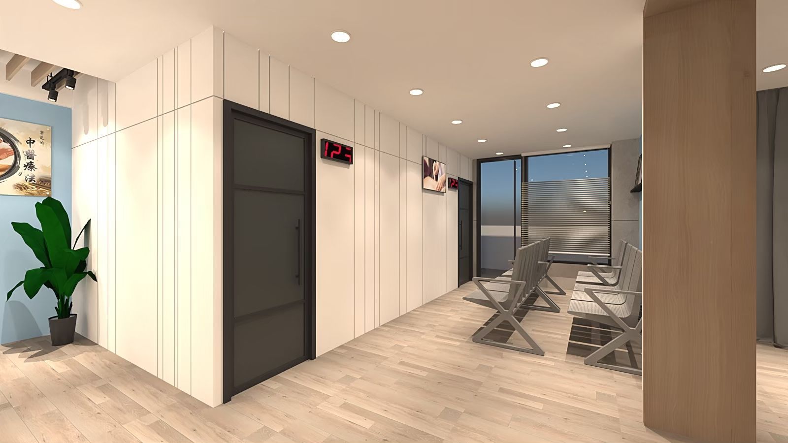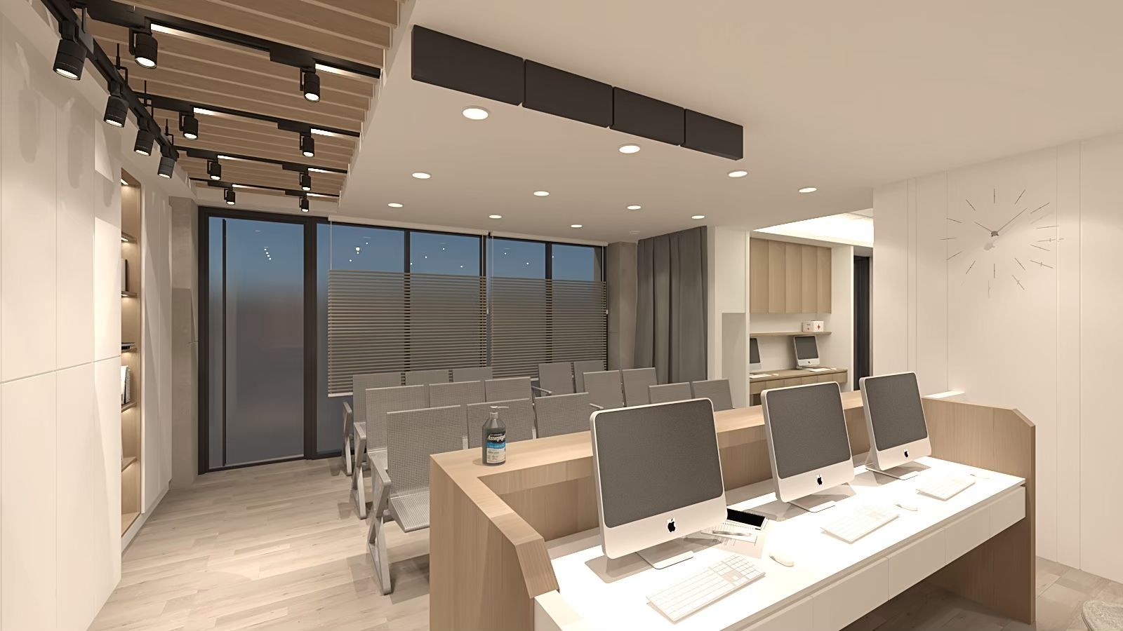 候診與接待區以乾淨俐落的風格呈現,牆面與地板以淺木色與白色為基調,搭配灰色座椅,營造出專業而舒適的氛圍。天花板的木格柵設計結合嵌燈與軌道燈,光線分布均勻,並增添層次感。
