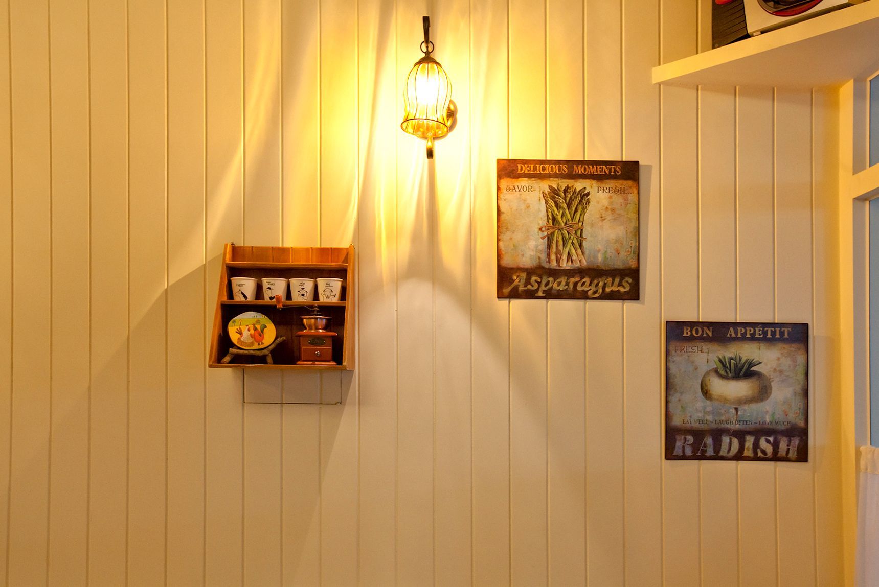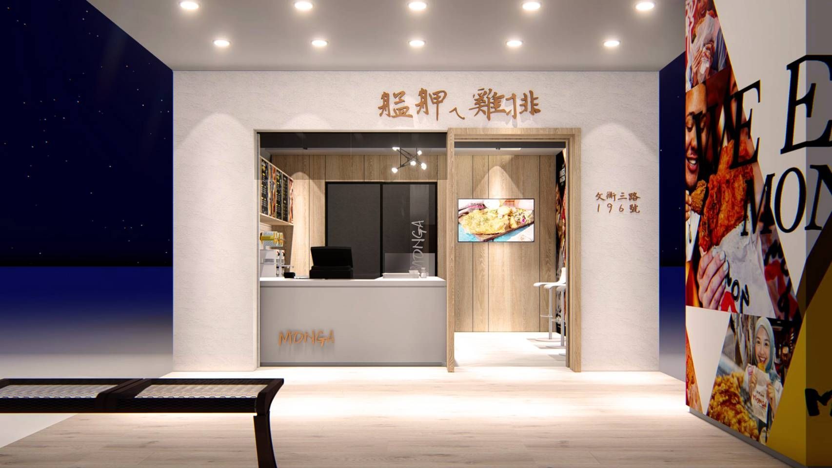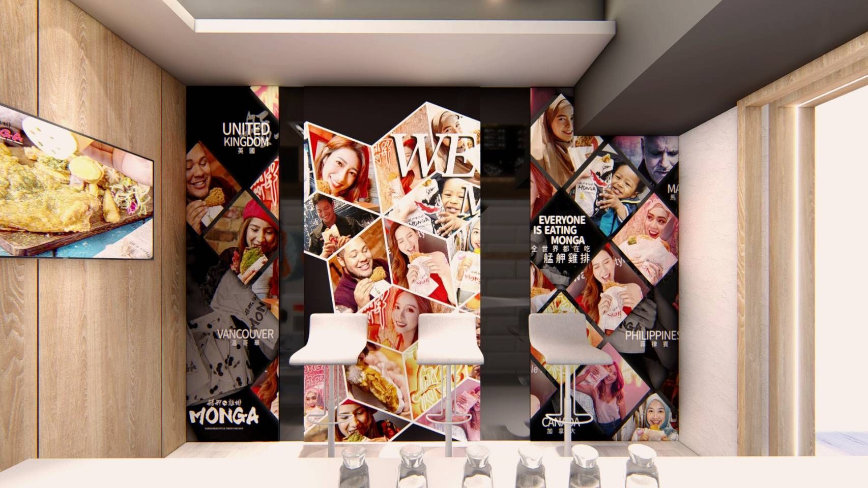 牆面以大面積的圖像與文字作為裝飾,結合文化符號與現代設計語言,增添活潑感與趣味性。後方的展示架整齊陳列商品與包裝,既具備功能性,也成為空間的一部分,讓整體視覺更顯完整。數位螢幕的設置則提供即時的餐點影像,強化互動性與現代感。
