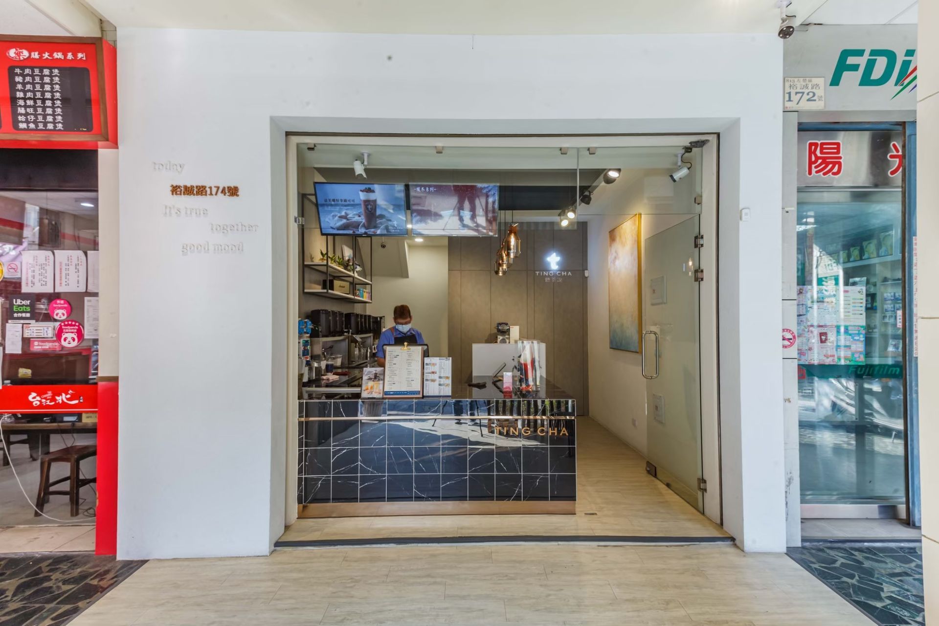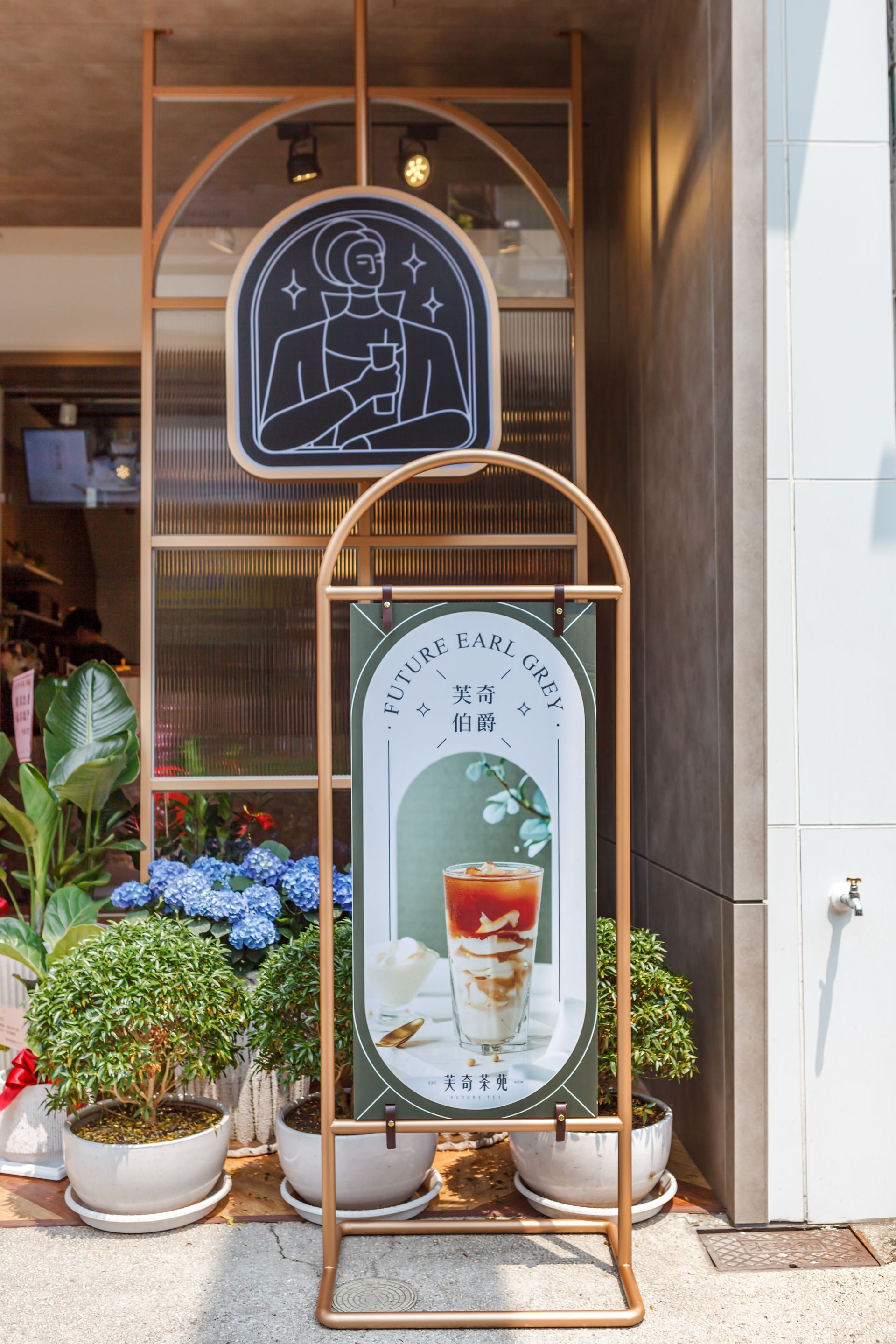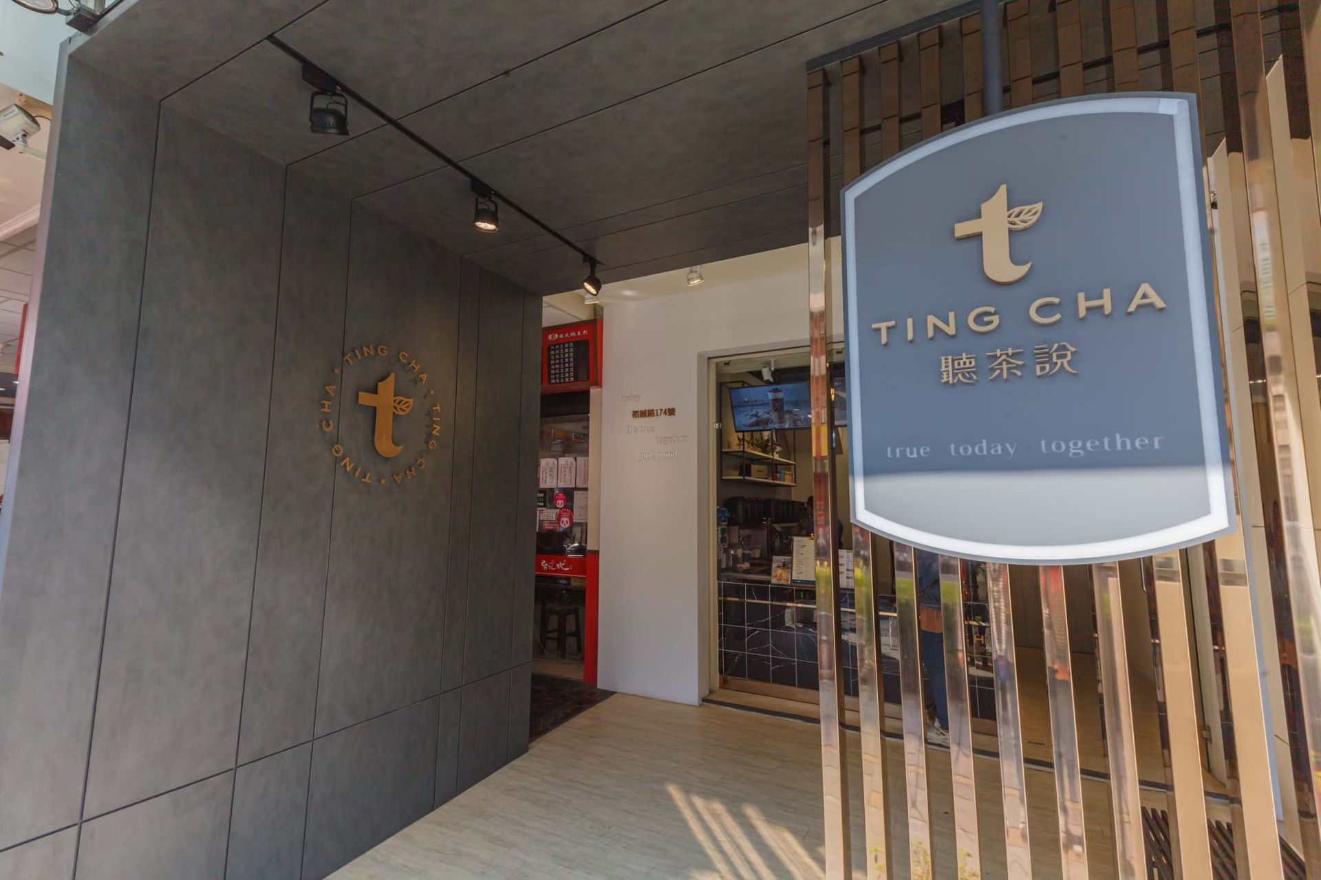 空間設計著重於材質的對比與細節的呼應,黑色大理石的穩重感與金色元素的亮度形成平衡,灰色牆面則提供中性背景,突顯品牌識別。這樣的設計不僅提升整體質感,也讓顧客在享用茶飲時能感受到舒適而具特色的環境。
