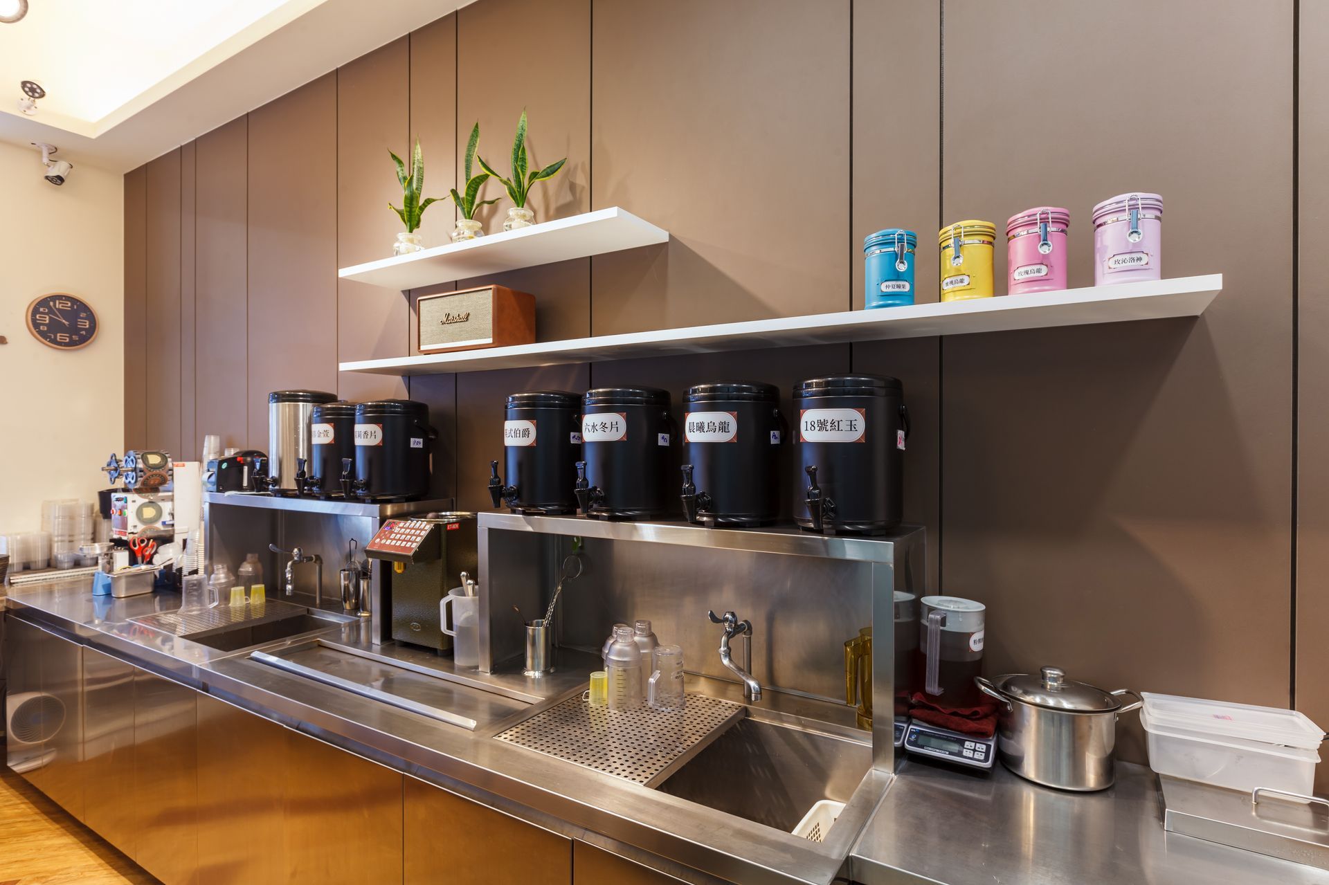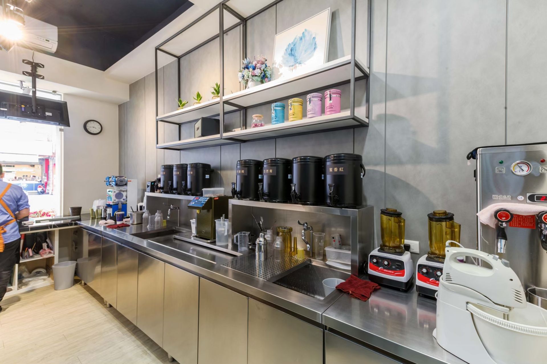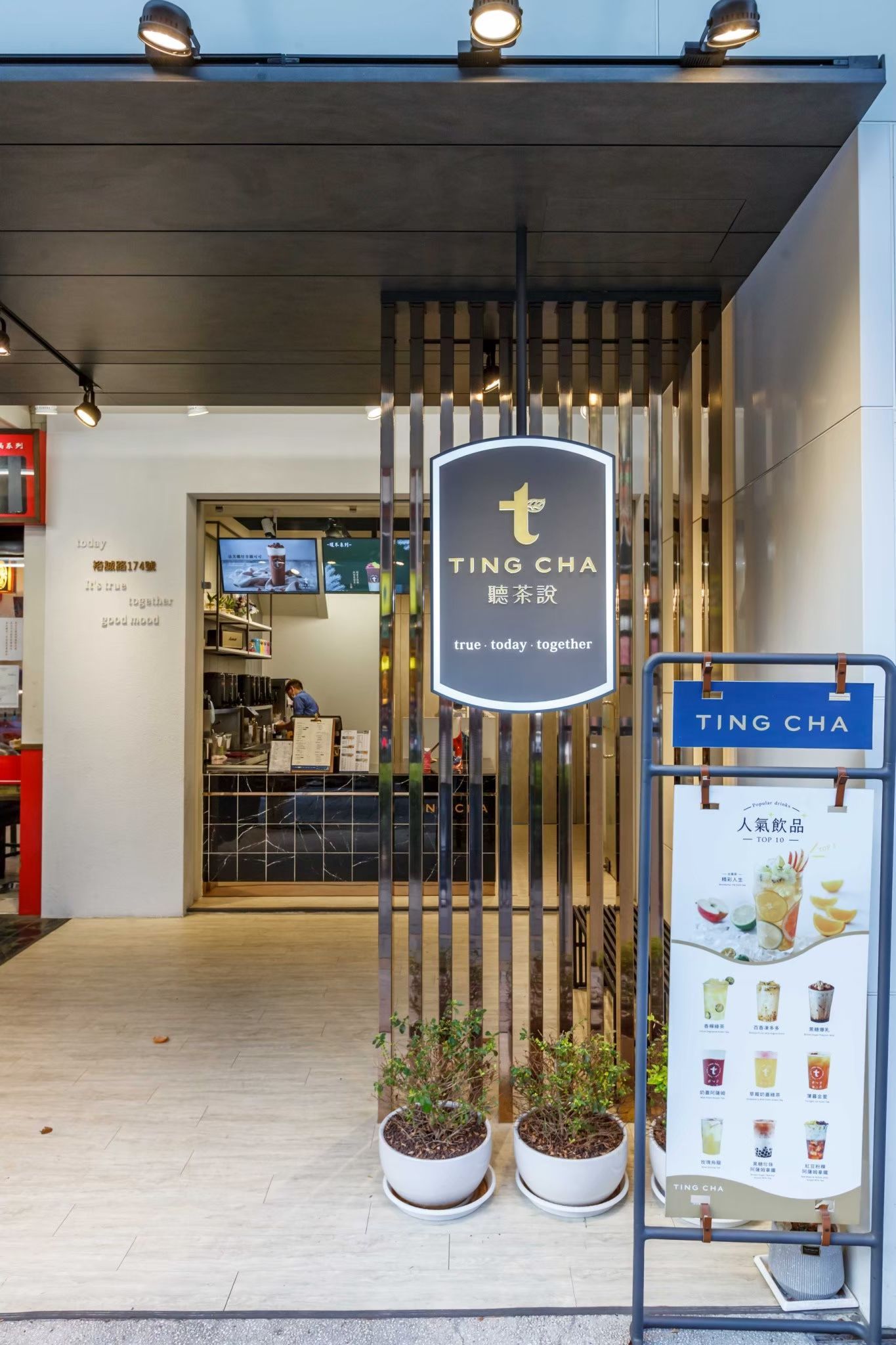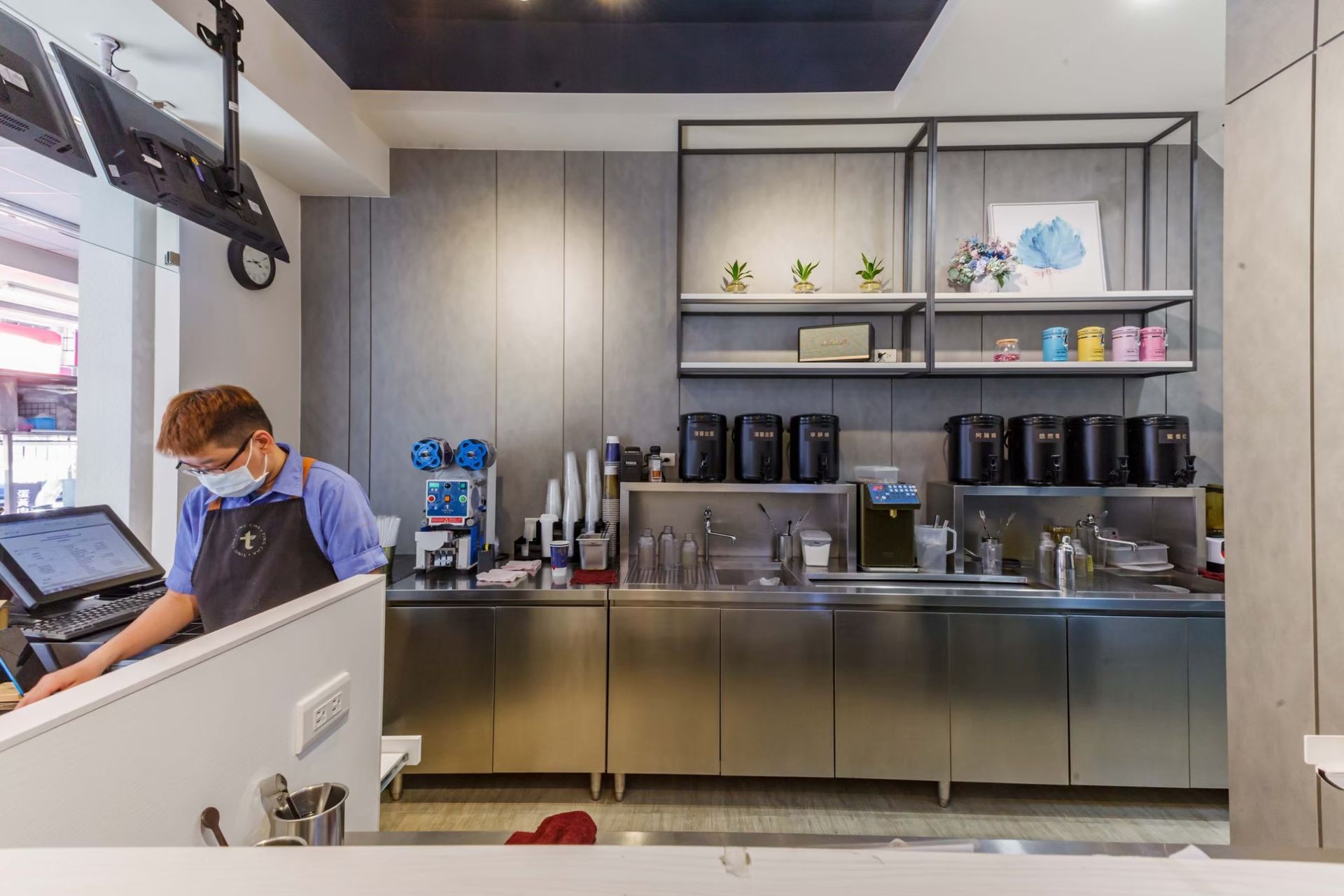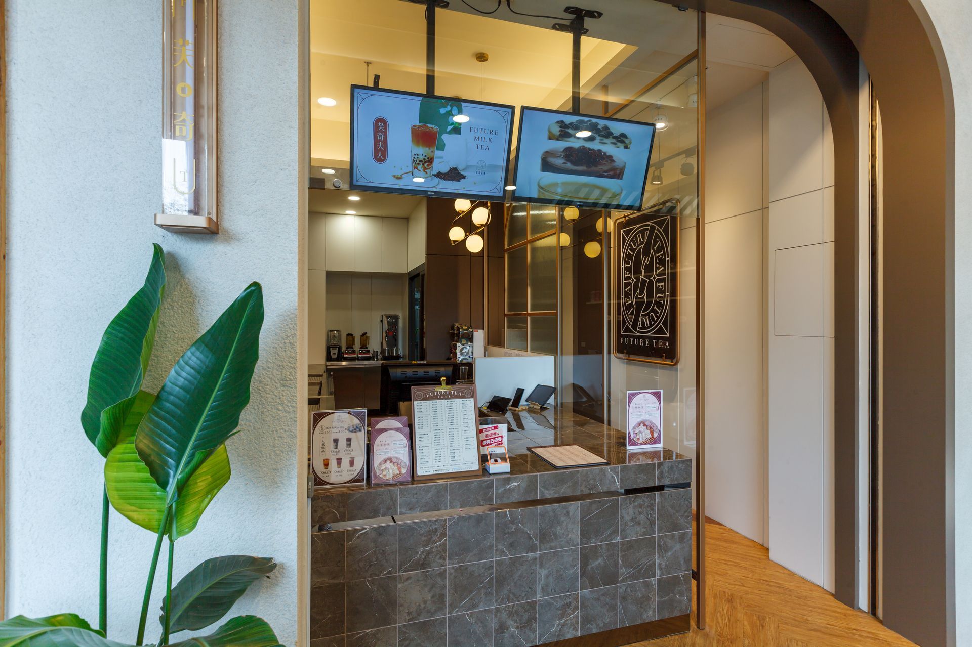 櫃檯後方的層架陳列植栽與色彩鮮明的杯具,為空間增添活力與層次感。數位化的菜單螢幕則成為視覺焦點,結合影像與文字,讓顧客能清楚快速地瀏覽飲品選項。整體配置兼顧功能性與美感,展現出俐落的現代茶飲氛圍。