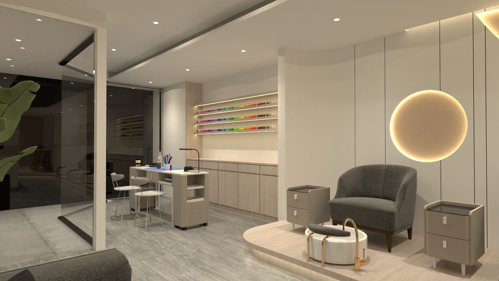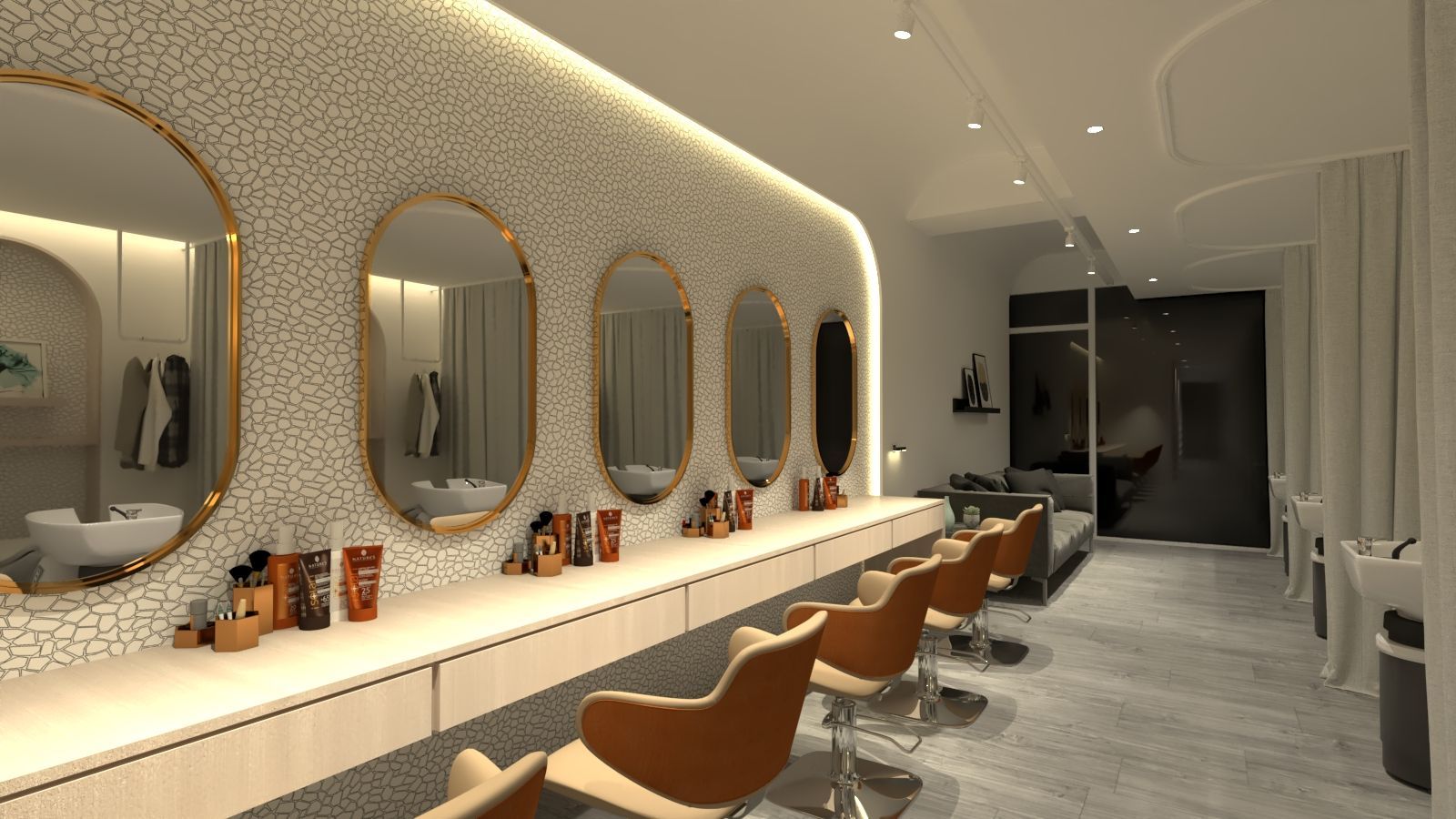 本案整體氛圍乾淨柔和,前區以美髮座椅與金色圓鏡搭配馬賽克質感牆面,形成鮮明的視覺焦點。櫃檯整齊陳列各式美髮用品,座椅以暖色皮革呈現,營造舒適而專業的服務氛圍。燈光設計以嵌燈與光帶為主,柔和卻具層次,突顯鏡面與材質細節。