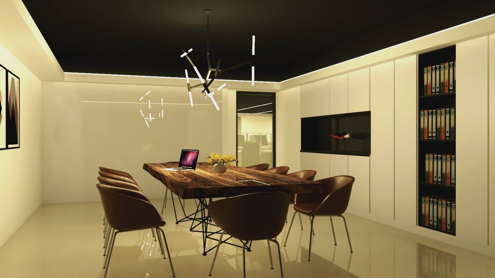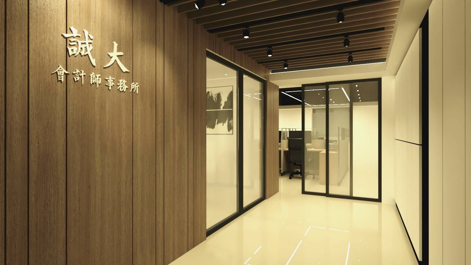 地板則以光滑材質呈現,反射燈光使整個空間顯得更加明亮整潔,給人一種開闊寬敞的感受。整體設計在功能性與美感之間取得了良好的平衡,不但營造出高效、專業且舒適的辦公環境,還讓每位進入此空間的人都能感受到現代化辦公的魅力與舒適。
