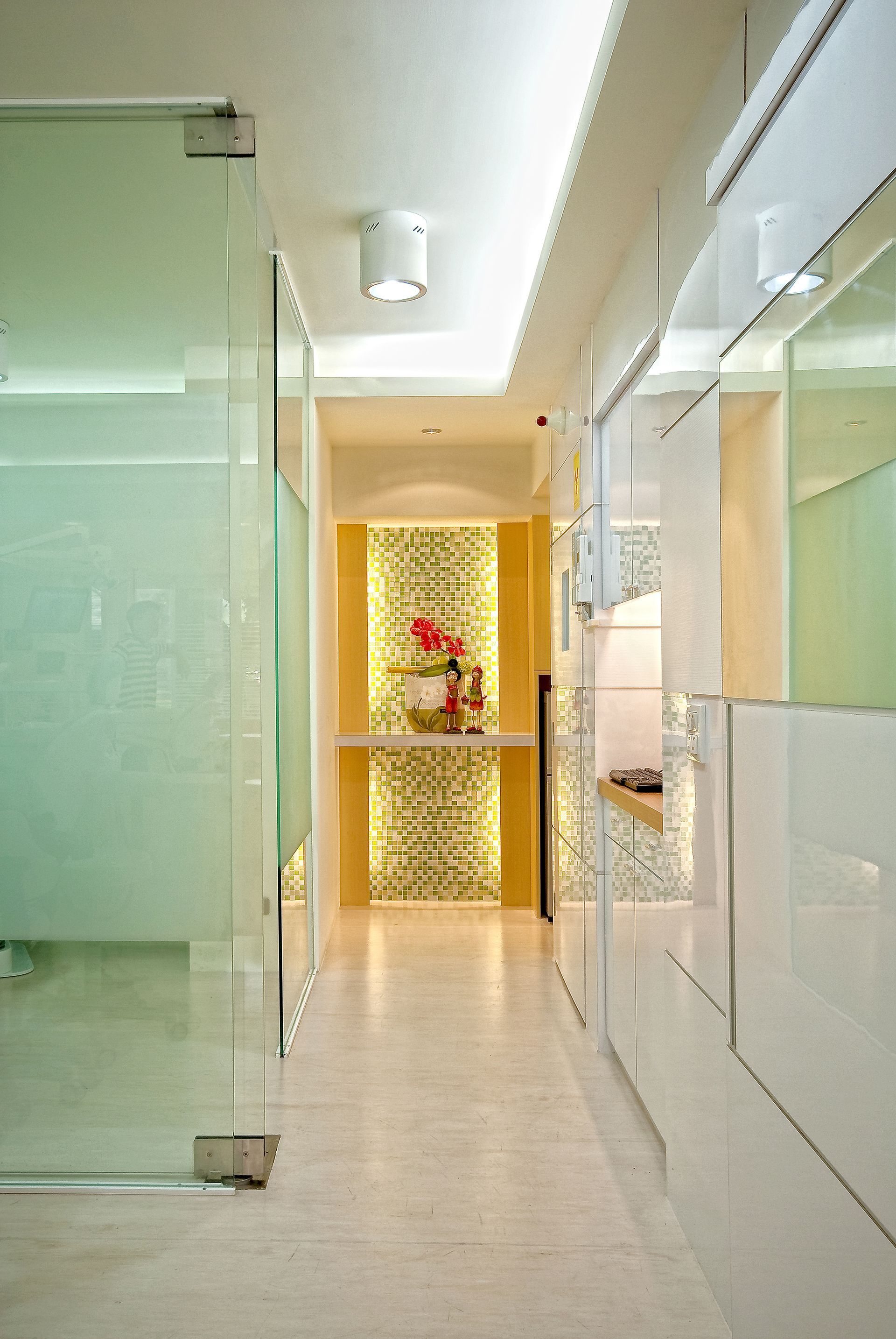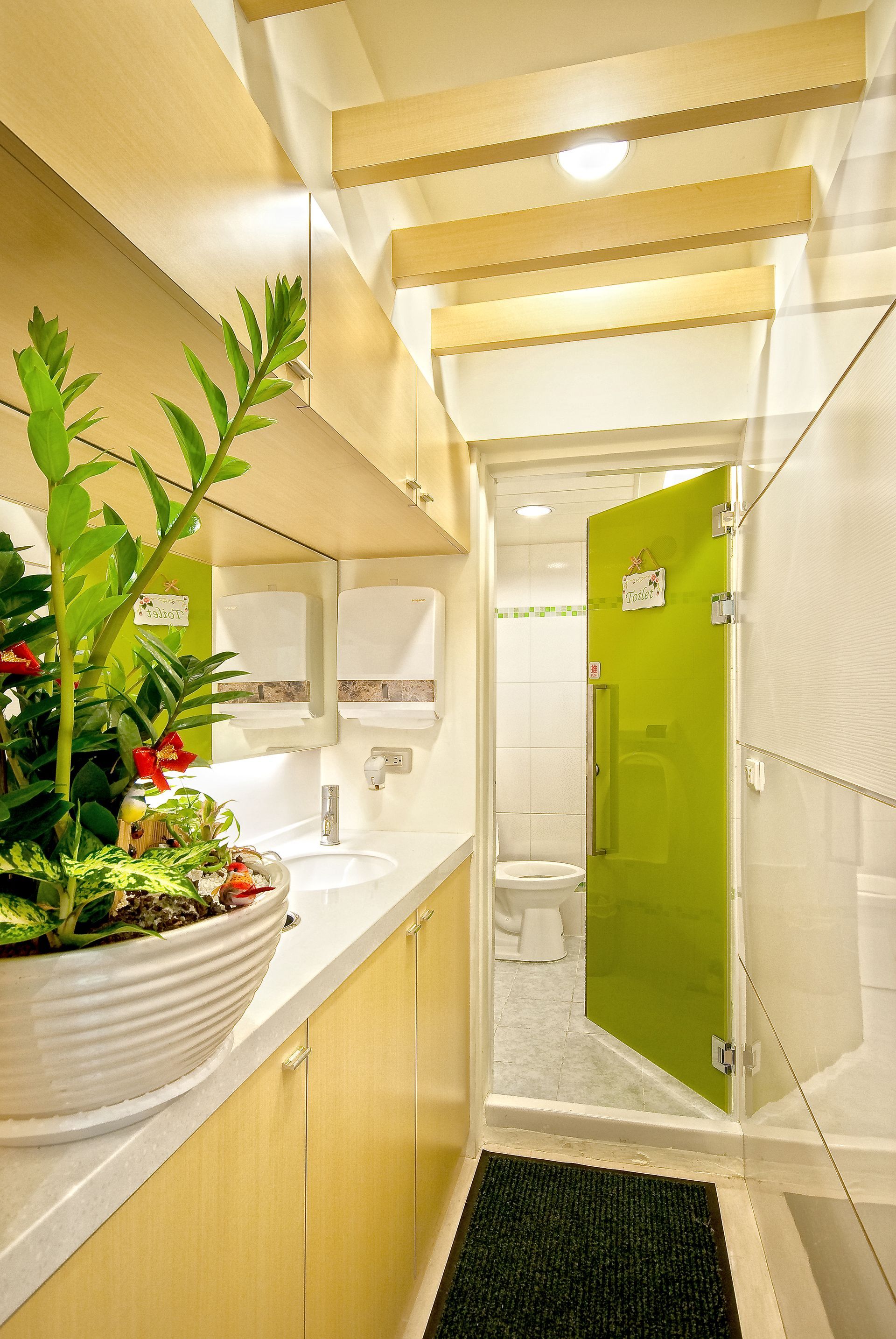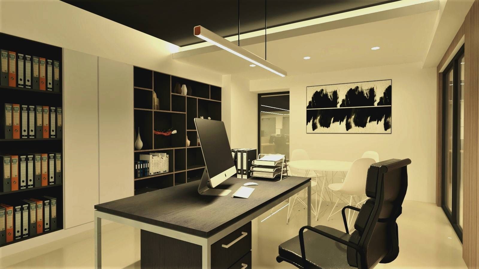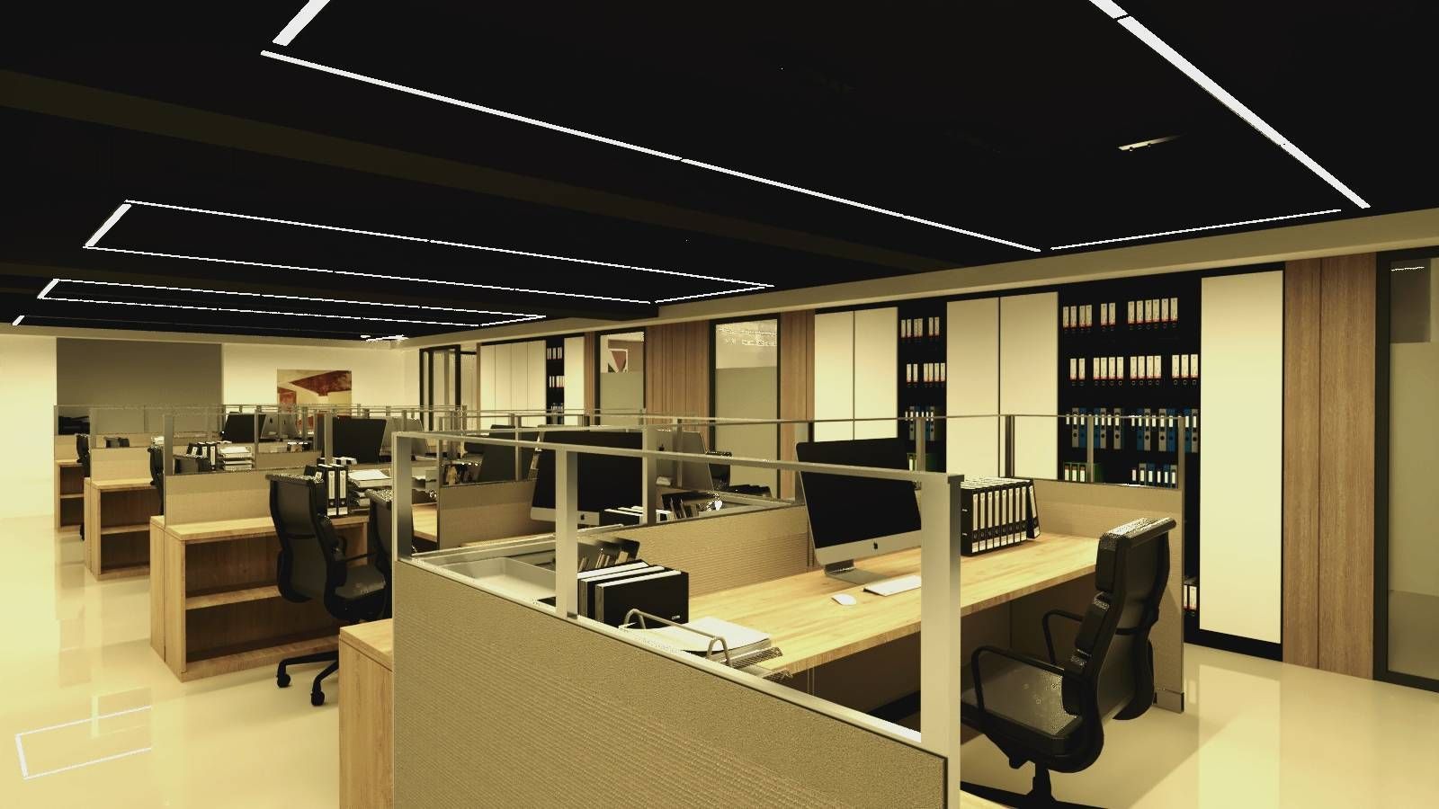 天花板的線性燈具巧妙地嵌入深色面材中,讓光線分布更加均勻,營造出舒適的工作氛圍,同時增添了俐落的視覺效果,給人一種清新而精緻的感覺。後方的收納櫃搭配整齊排列的資料夾,不僅提升了空間的整潔度,還強化了秩序感與專業氛圍,使得員工能在有條不紊的環境中高效工作。