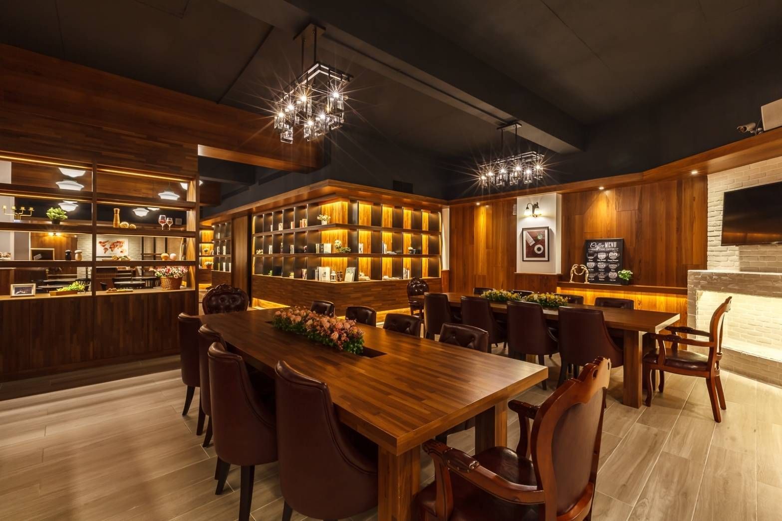 本案以甜點店的氛圍為核心,透過柔和燈光與木質元素,營造出溫暖而親切的空間感。吊燈的光線均勻灑落,搭配牆面與櫃體的自然材質,讓整體氛圍既舒適又具質感,呈現出輕鬆愉悅的用餐場景。入口處的花卉擺設與自然光線引入,更增添一份清新感受。
