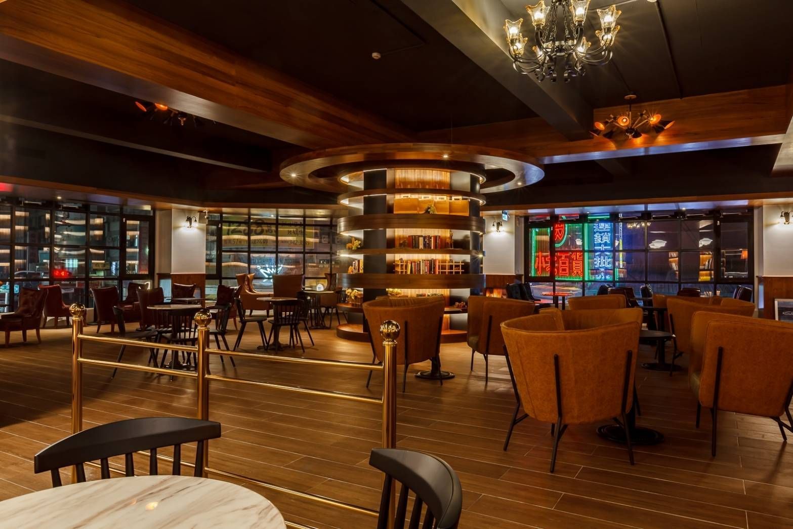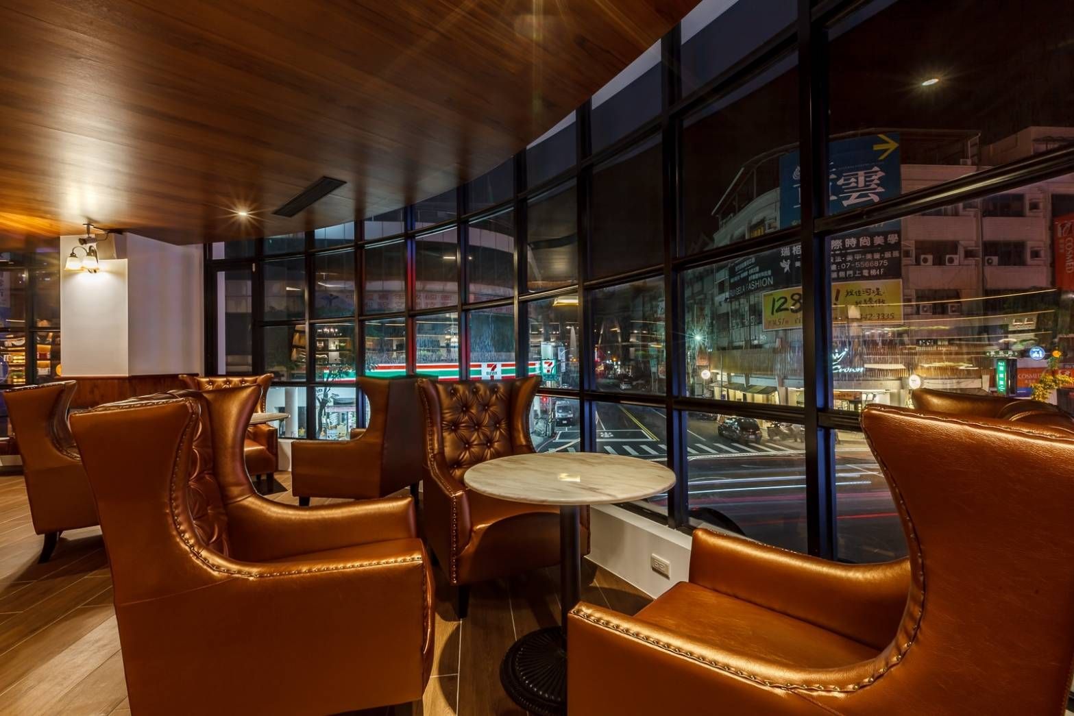 座位區以皮革椅與木質桌面為主,排列整齊而不失靈活,讓顧客能自在地享受咖啡與交流。牆面與窗邊的書架延伸了整體設計的連續性,搭配街景的自然光線,使室內氛圍更顯開放與舒適。木材與皮革的材質運用,帶來溫暖而細膩的觸感,提升整體空間的質感。