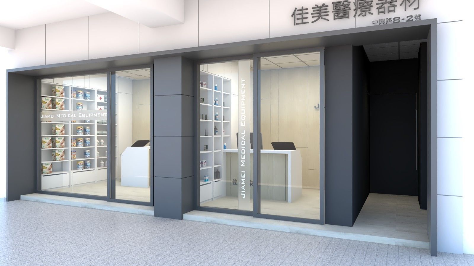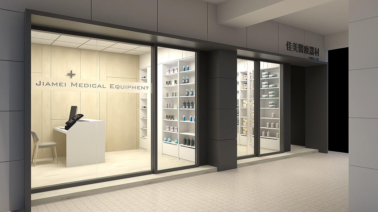 整體設計著重於功能性與舒適度的平衡,透過材質與色彩的搭配,營造出安心、專業且高效的購物環境,使顧客在選購醫材或健康用品時能感受到清晰、便利與信任感。