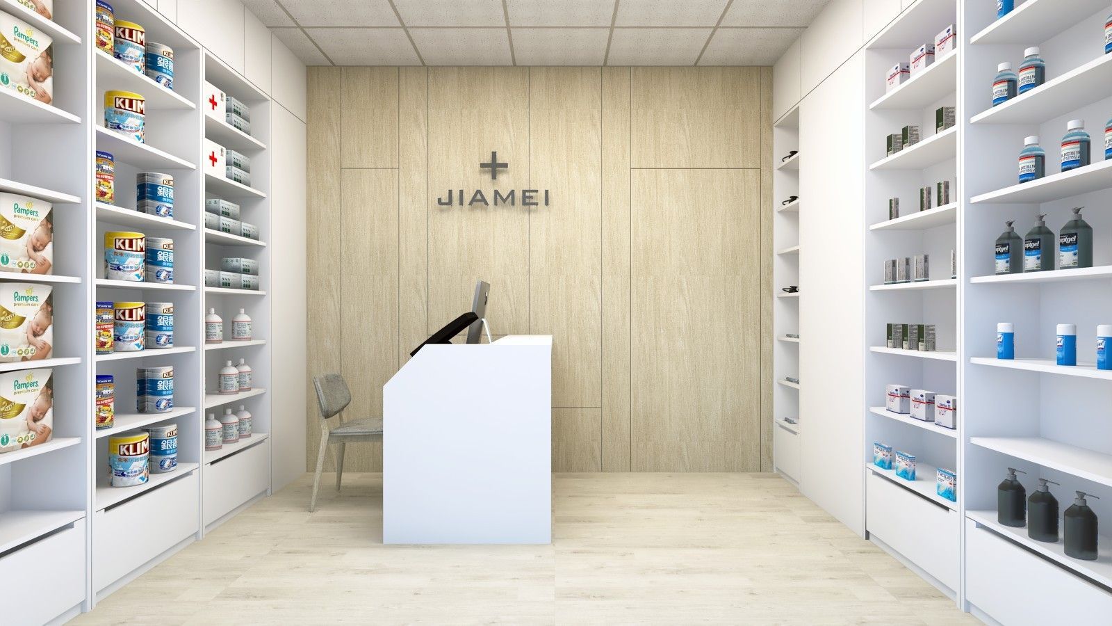 這個空間以藥局與醫材店的功能需求為基礎,整體設計乾淨明快,牆面與櫃體以白色與淺木色為主,營造出整潔而專業的氛圍。中央的櫃檯線條簡潔,搭配品牌識別,成為視覺焦點,同時也維持服務流程的順暢。