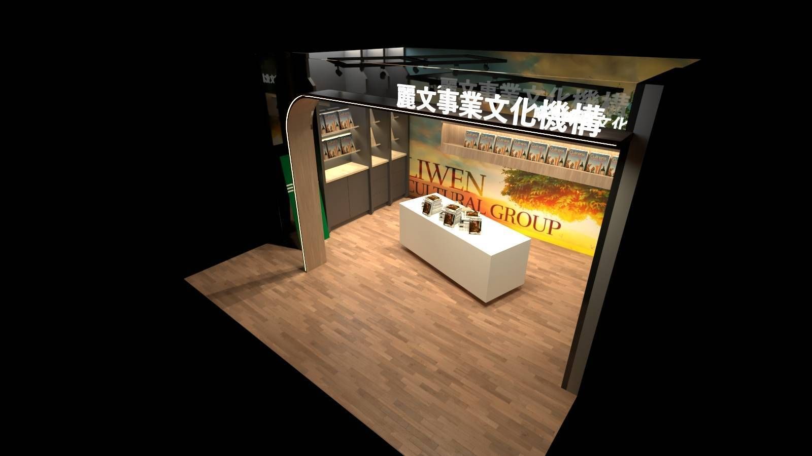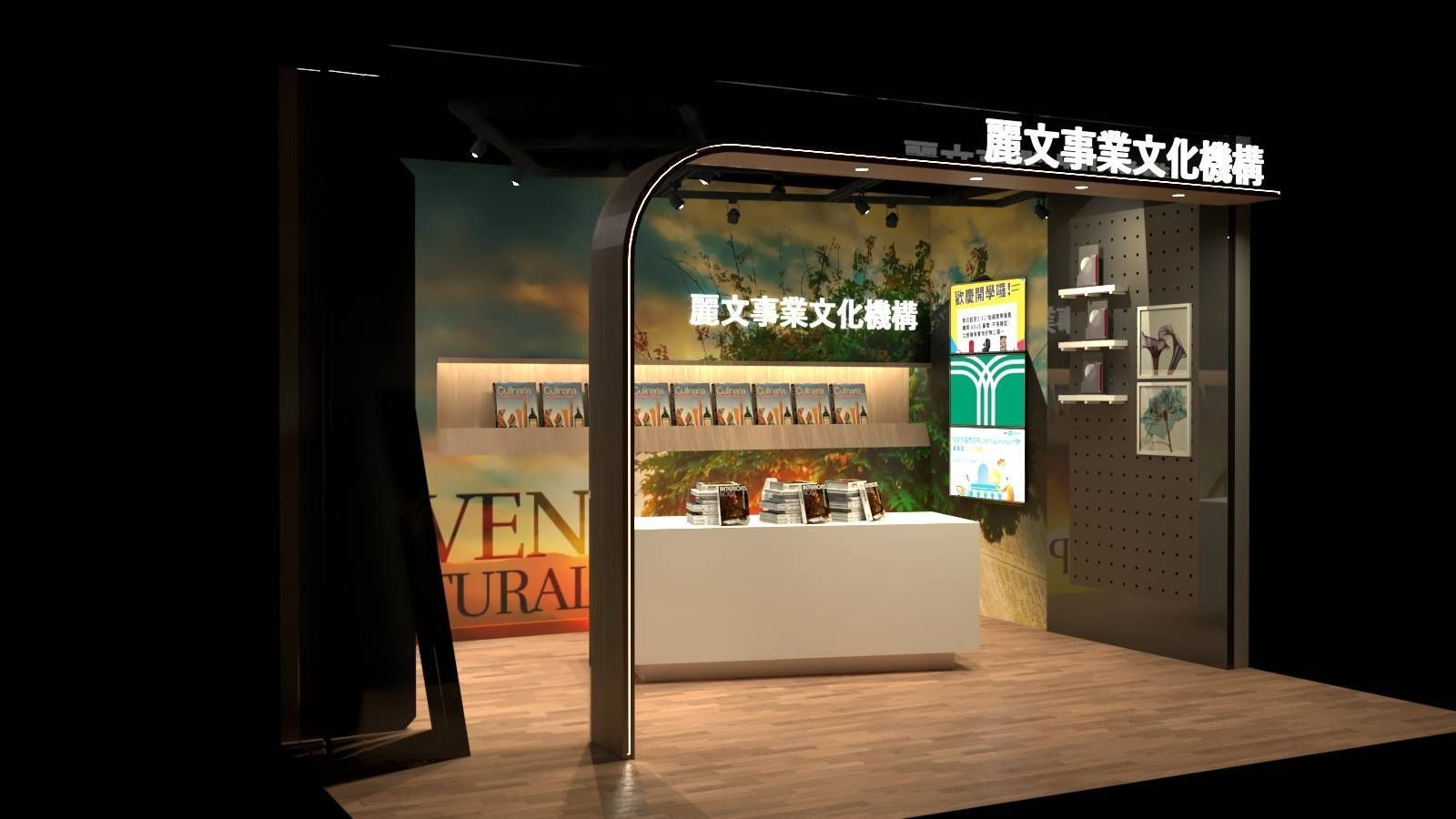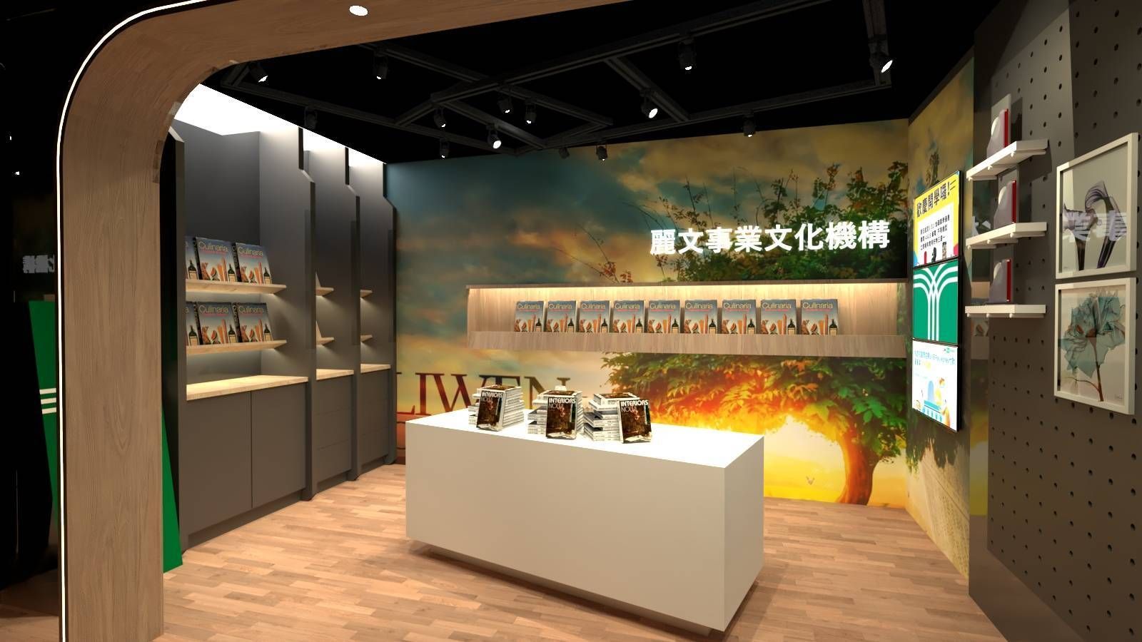 牆面大圖以自然景色作為背景,搭配燈光設計,營造出溫暖而具文化氛圍的空間。右側區域結合框畫與資訊展示,延伸展櫃的多元性,讓顧客在瀏覽書籍的同時也能感受到文化品牌的完整呈現。