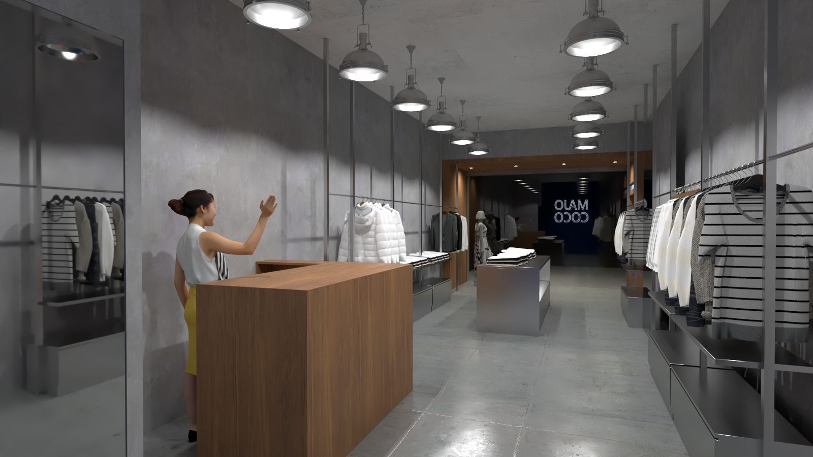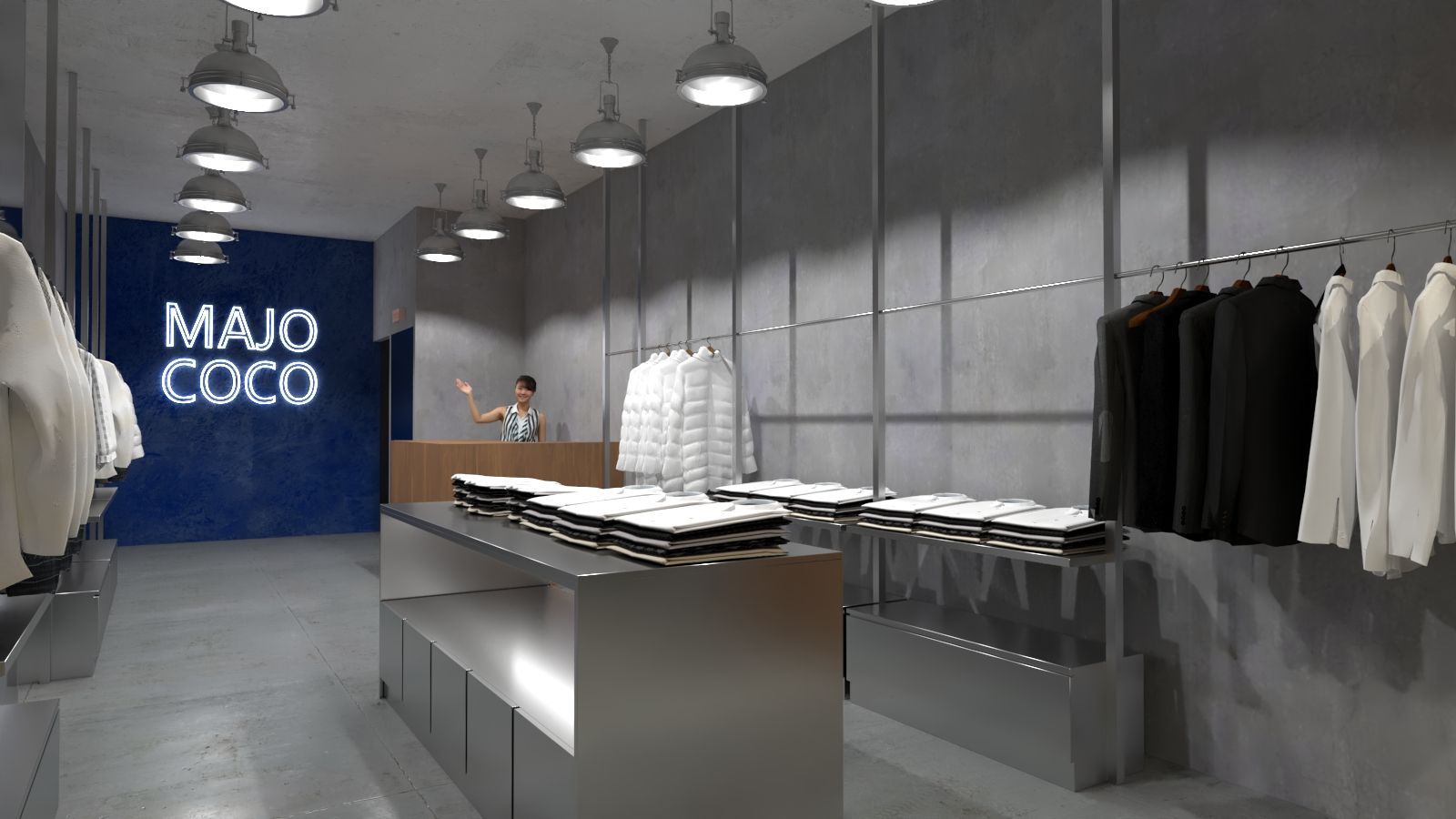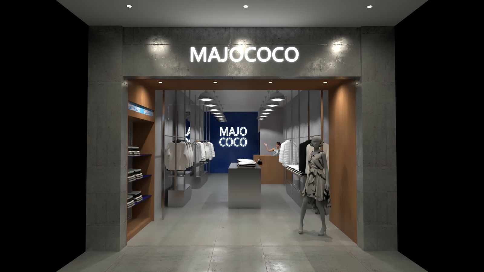 本案以服飾店的空間設計為核心,整體風格簡約俐落,入口以清水模牆面搭配明亮燈光,營造出現代而乾淨的氛圍。店名以發光字呈現,成為視覺焦點,強化品牌識別。