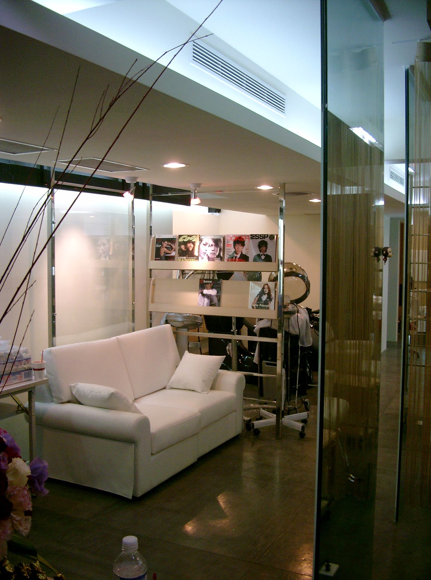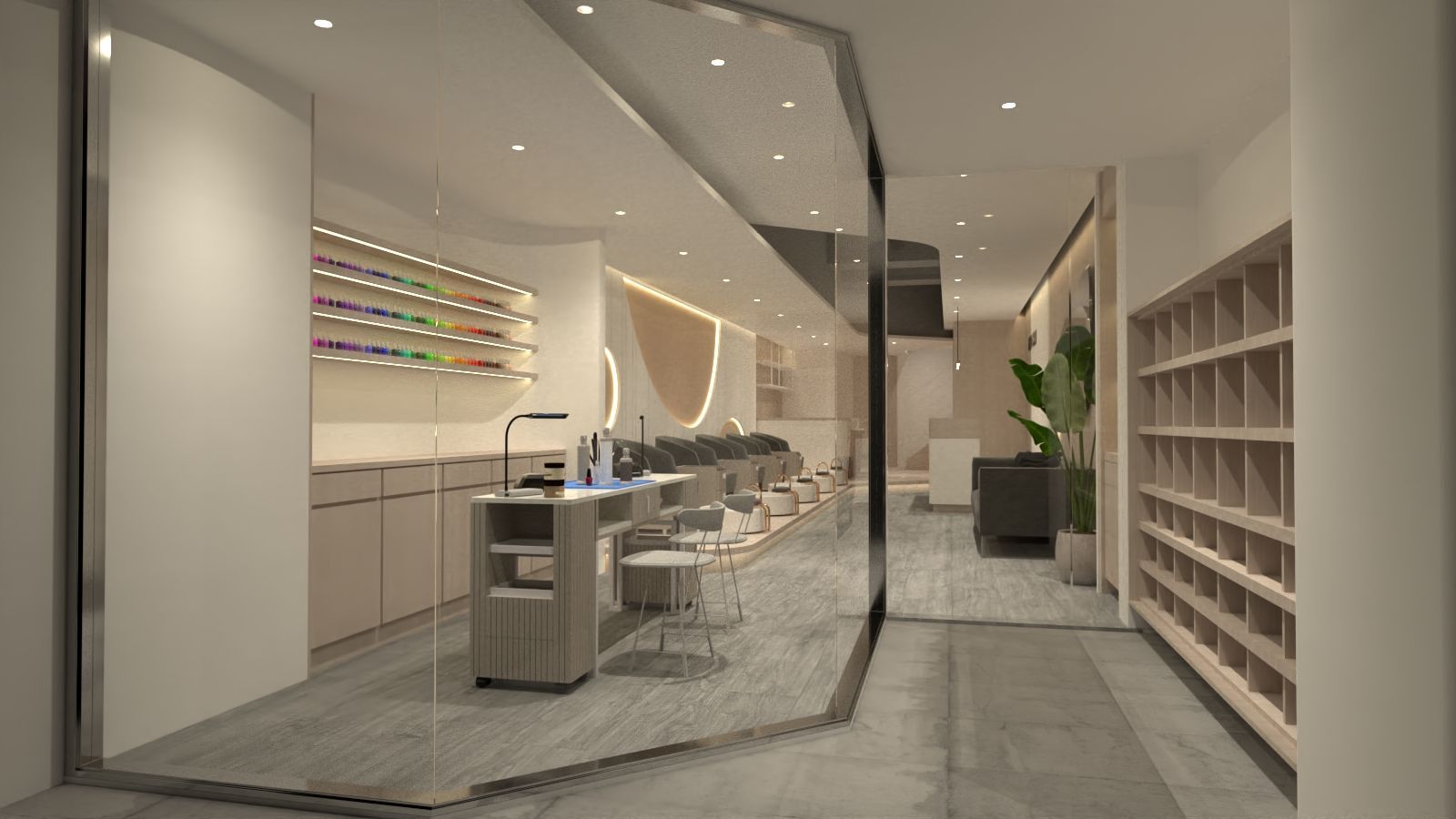 本案以美髮沙龍的空間設計為核心,整體風格俐落現代,地坪採用拋光水泥,搭配玻璃隔間與米色布簾,營造出明亮而具層次的氛圍。