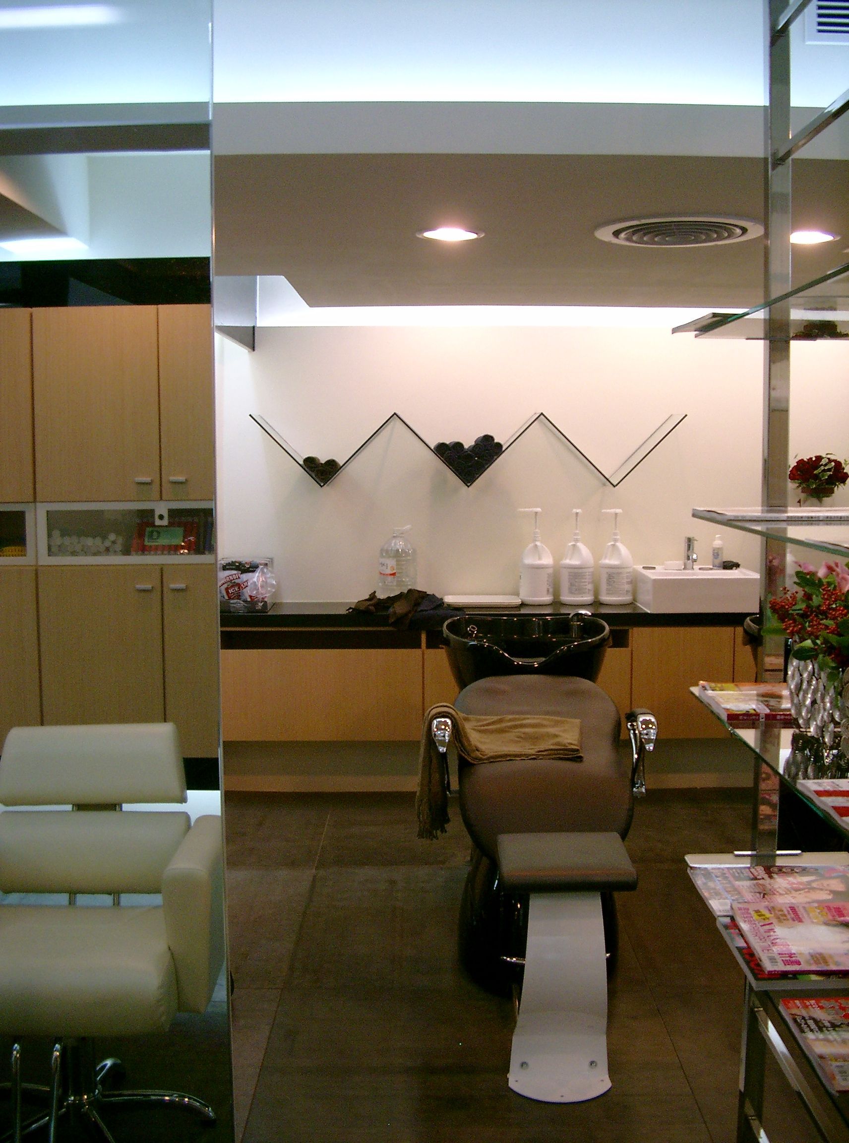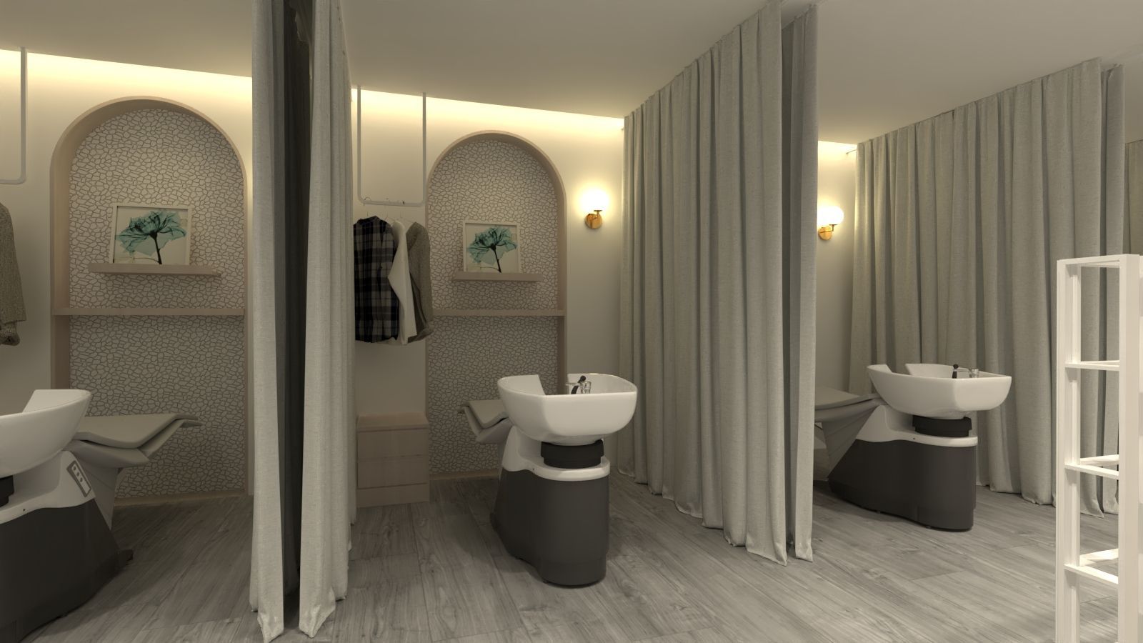 後區配置越式洗頭專用的洗髮椅與白色洗髮盆,並以布簾分隔,兼顧隱私與開放性。牆面結合壁龕與層架,搭配暖色燈光,營造出放鬆而具療癒感的氛圍。地坪以淺木紋材質呈現,呼應整體的自然與溫潤感。