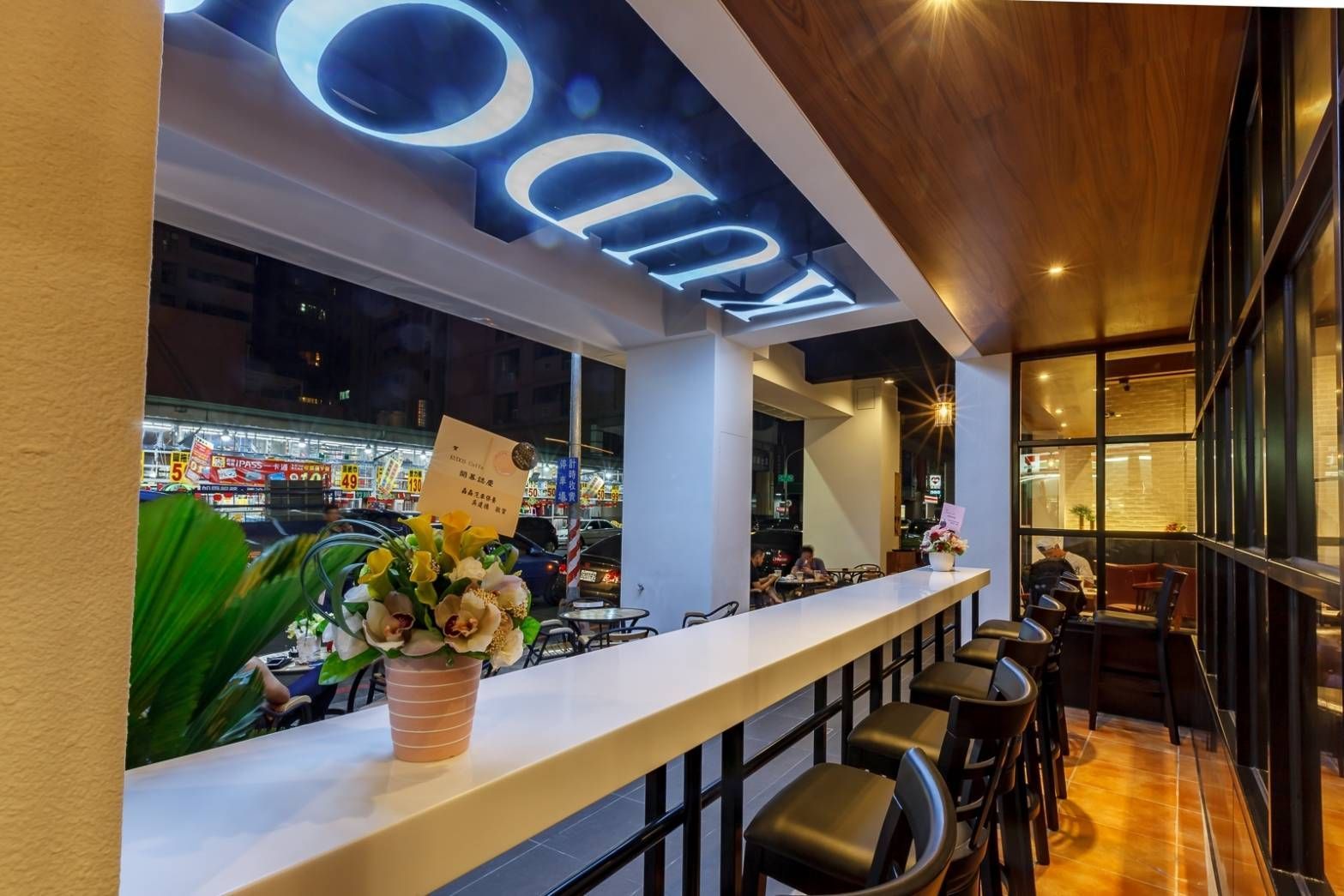 牆面以簡約線條圖像作為視覺焦點,結合品牌識別,形成鮮明的記憶點。櫃檯後方配置飲品設備與收納架,動線流暢,兼顧功能性與整潔感。外部的展示立牌以色彩鮮明的飲品影像吸引目光,呼應店內的設計語言。