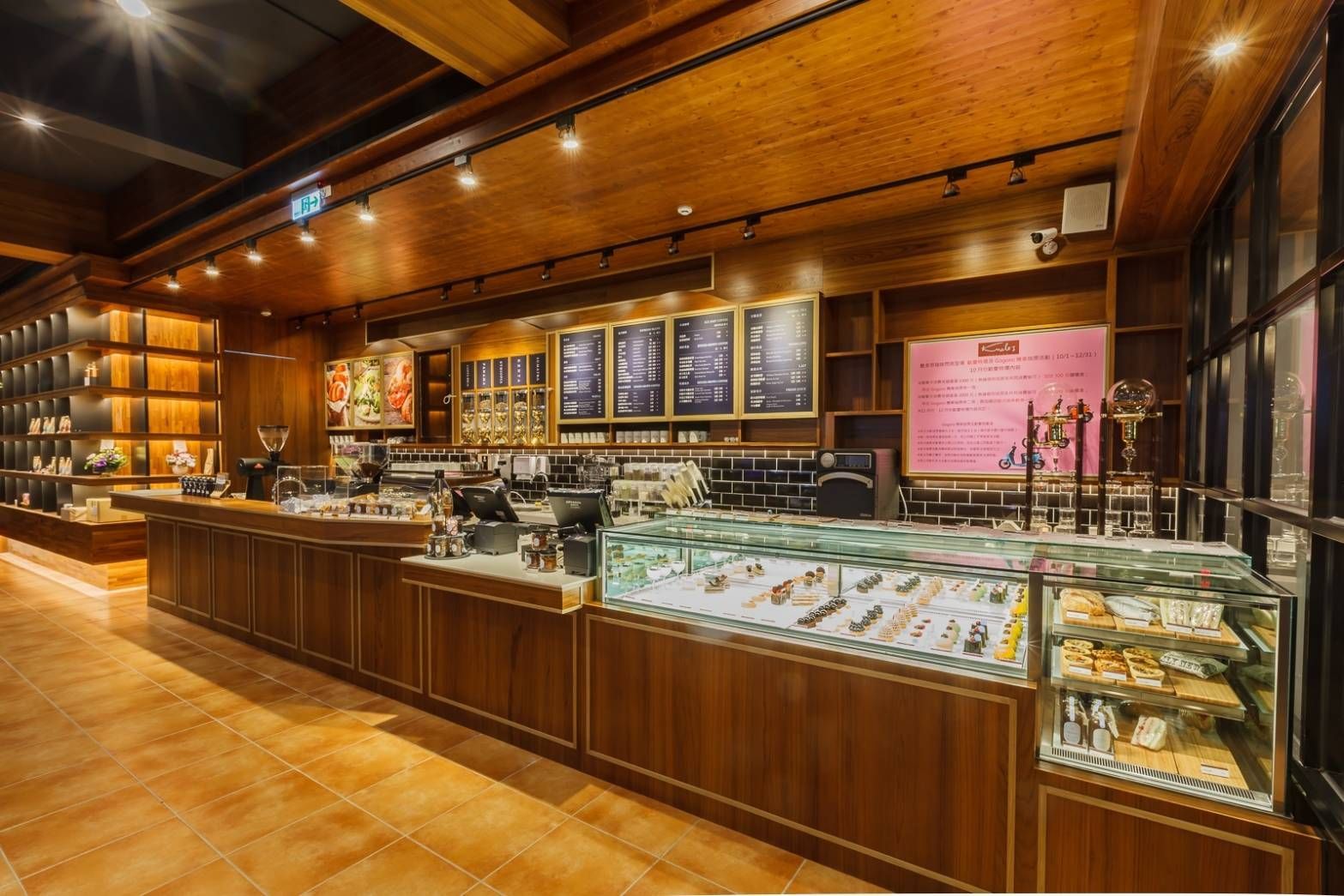 在空間配置上,本案以吧檯與展示櫃為核心,結合專業咖啡設備與甜點陳列,兼顧功能性與美感。層架上的器皿與容器整齊排列,既是收納的巧思,也是視覺上的裝飾。