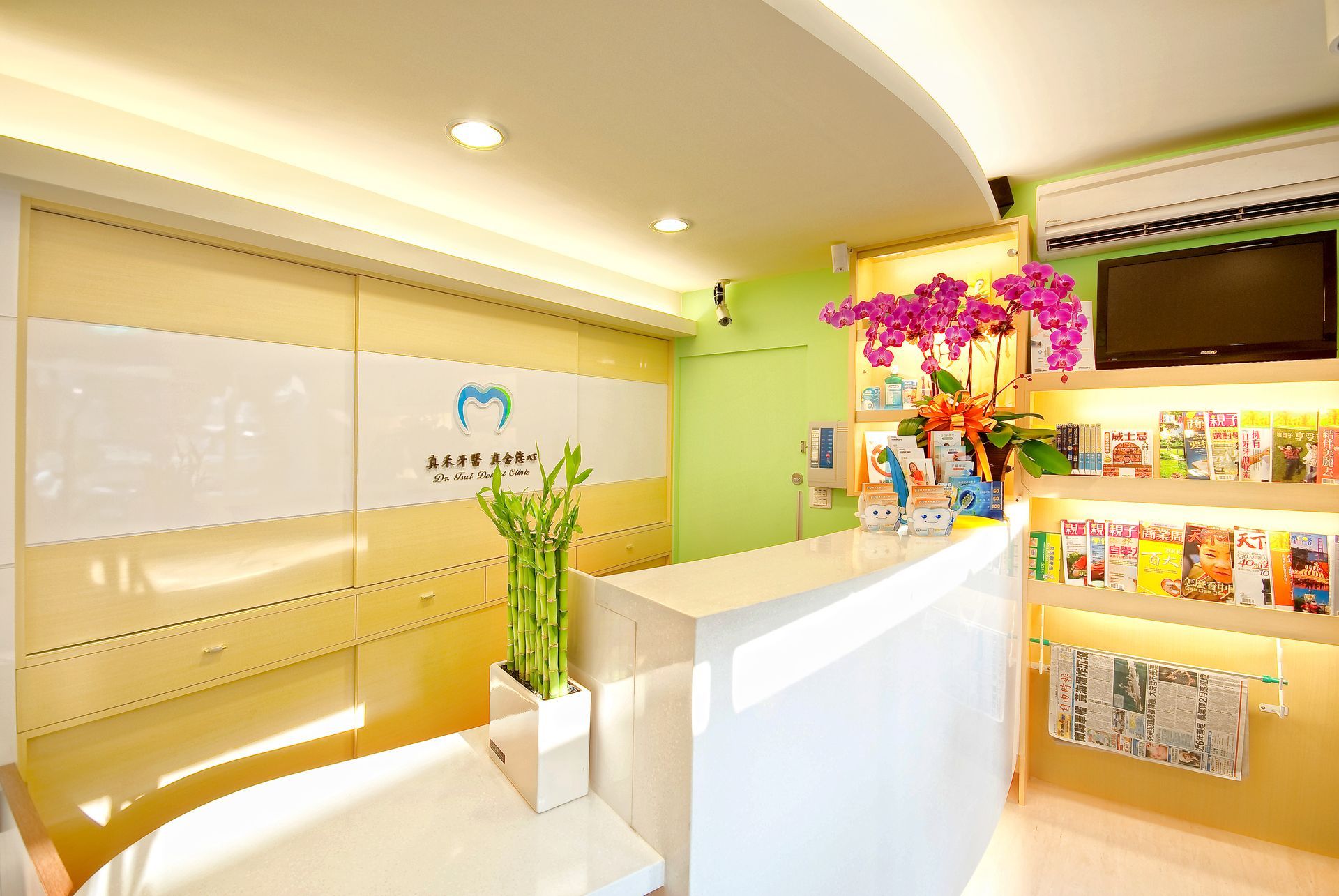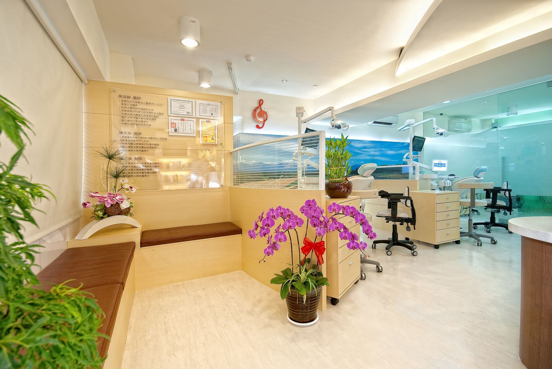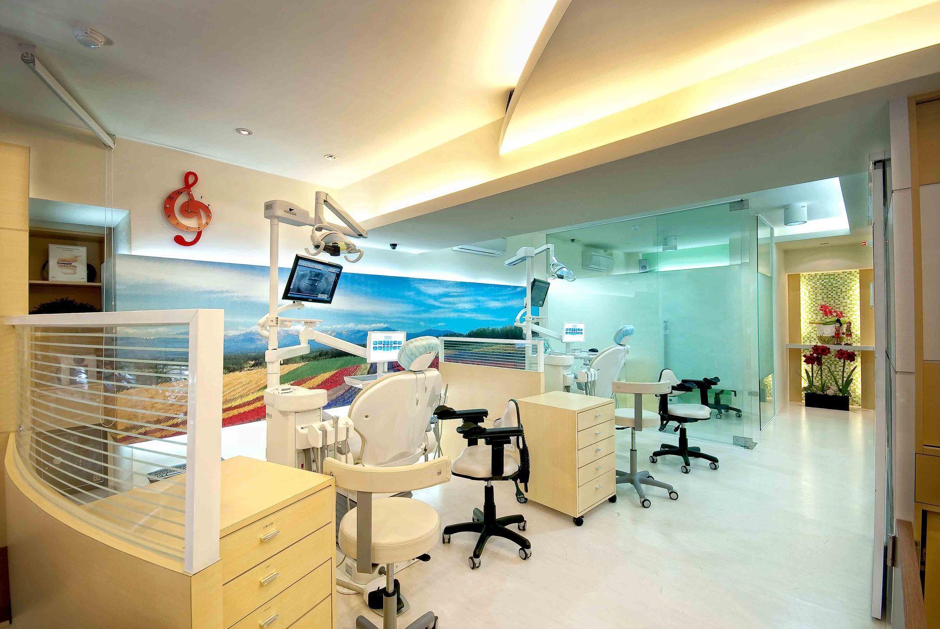 牆面上的大型風景壁畫成為空間的視覺亮點,柔化了醫療場域的緊張感,為患者帶來放鬆的感受。整體設計在功能性與氛圍之間取得平衡,打造出專業、舒適且具親和力的牙科診療環境。
