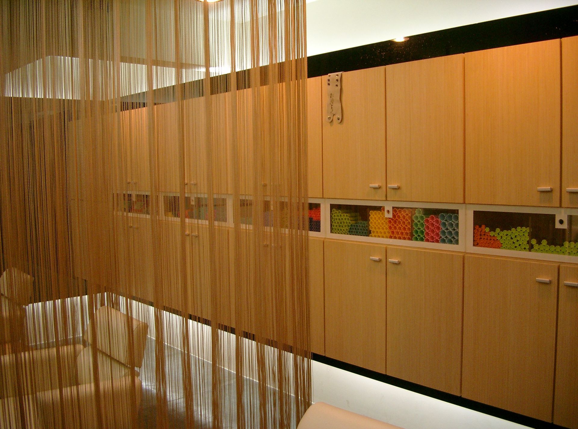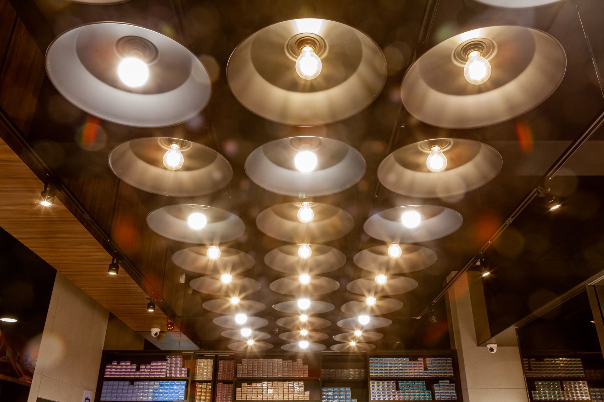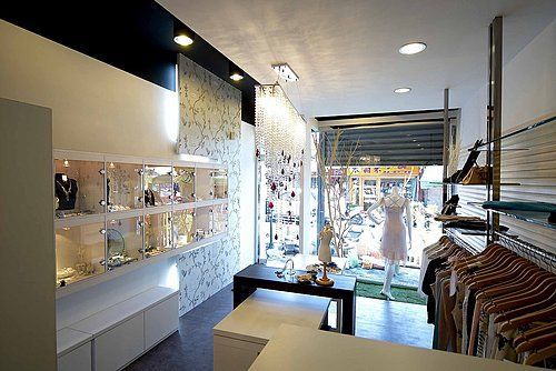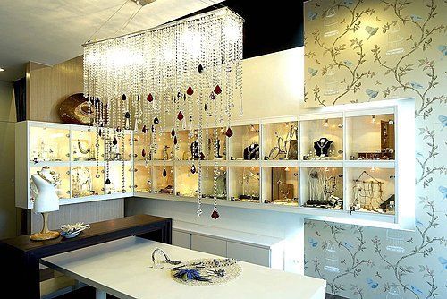 天花板懸掛的水晶簾幕成為空間亮點,透過光影折射增添華麗感,並與自然光線相互呼應。整體設計在材質、色彩與光線之間取得平衡,營造出時尚、舒適且具美感的購物環境。