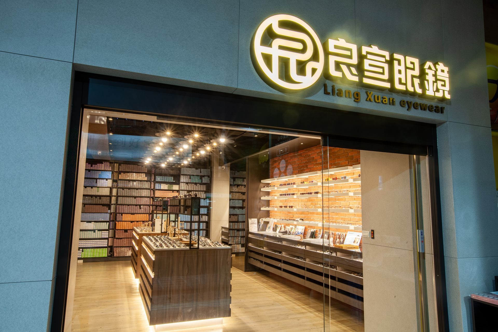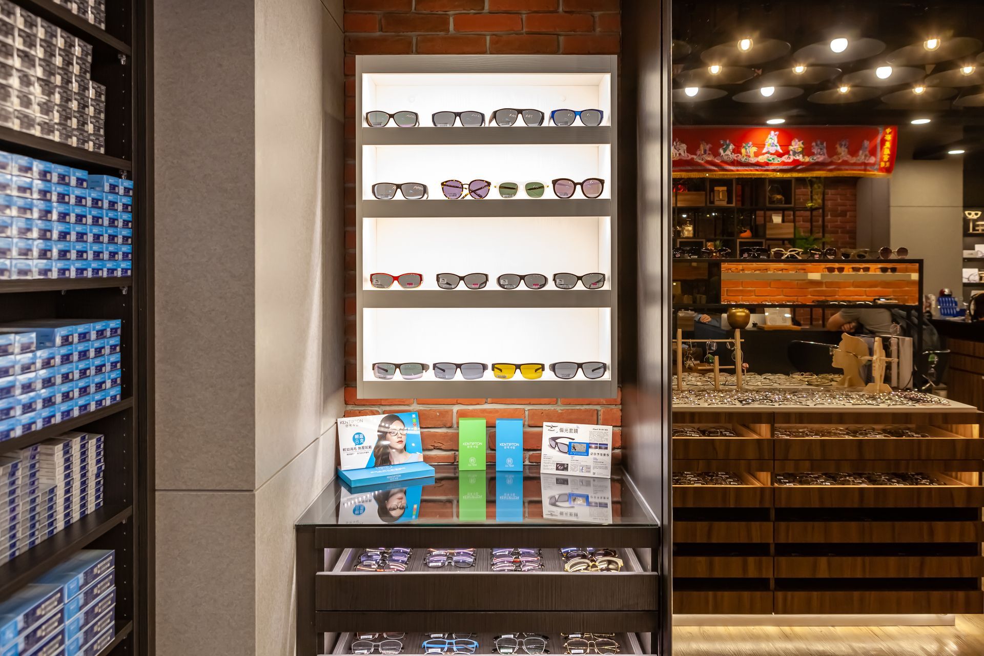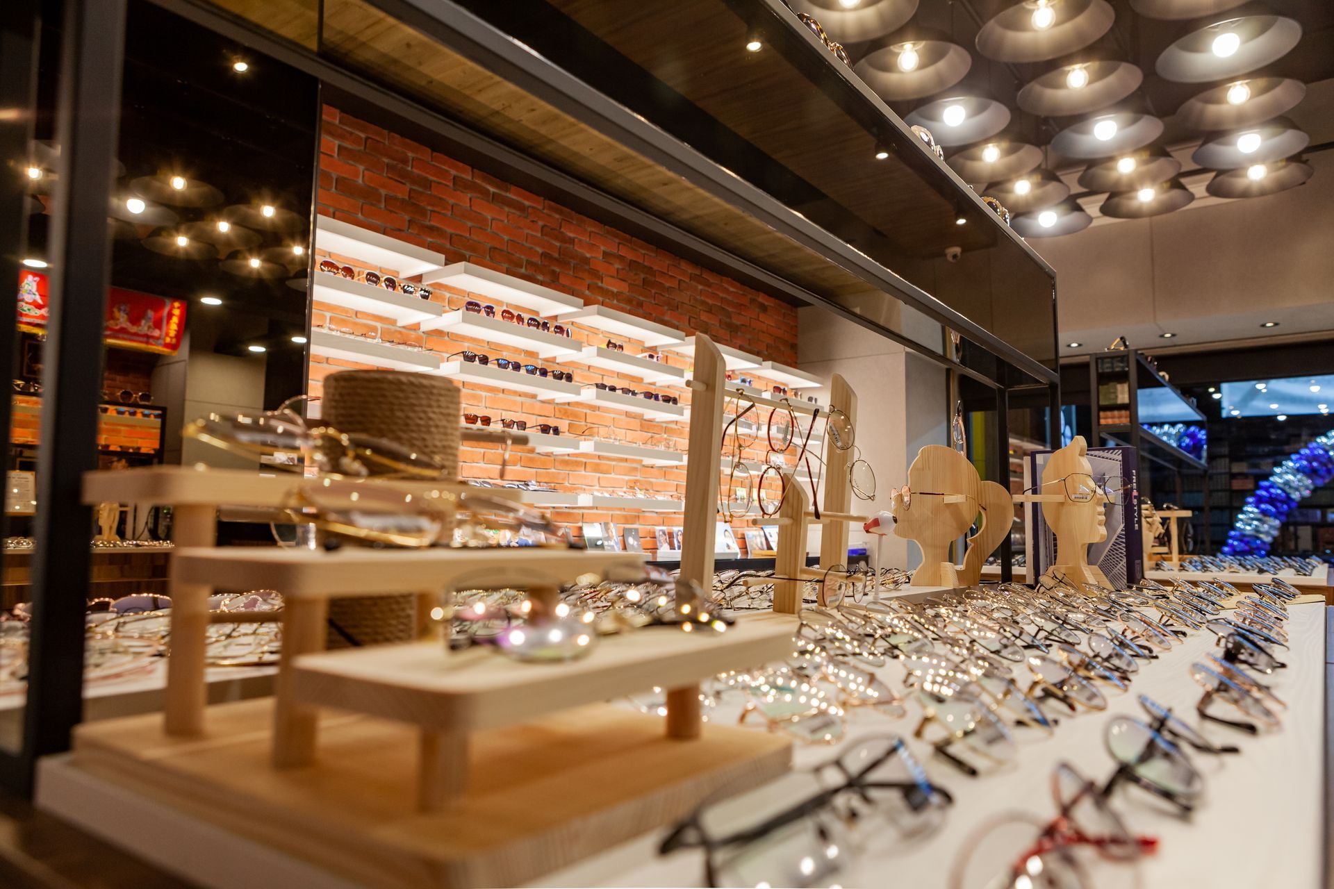 磚牆與植栽的巧妙點綴,則為整個空間增添了一抹現代感,同時也帶來了生活的氣息,使得整體設計在專業與親和之間取得了良好的平衡。這樣的整體設計不僅突顯了商品展示的完整性,更讓顧客在挑選眼鏡的過程中,能夠感受到一種舒適、放鬆且充滿美感的氛圍,提升了購物的愉悅感受。