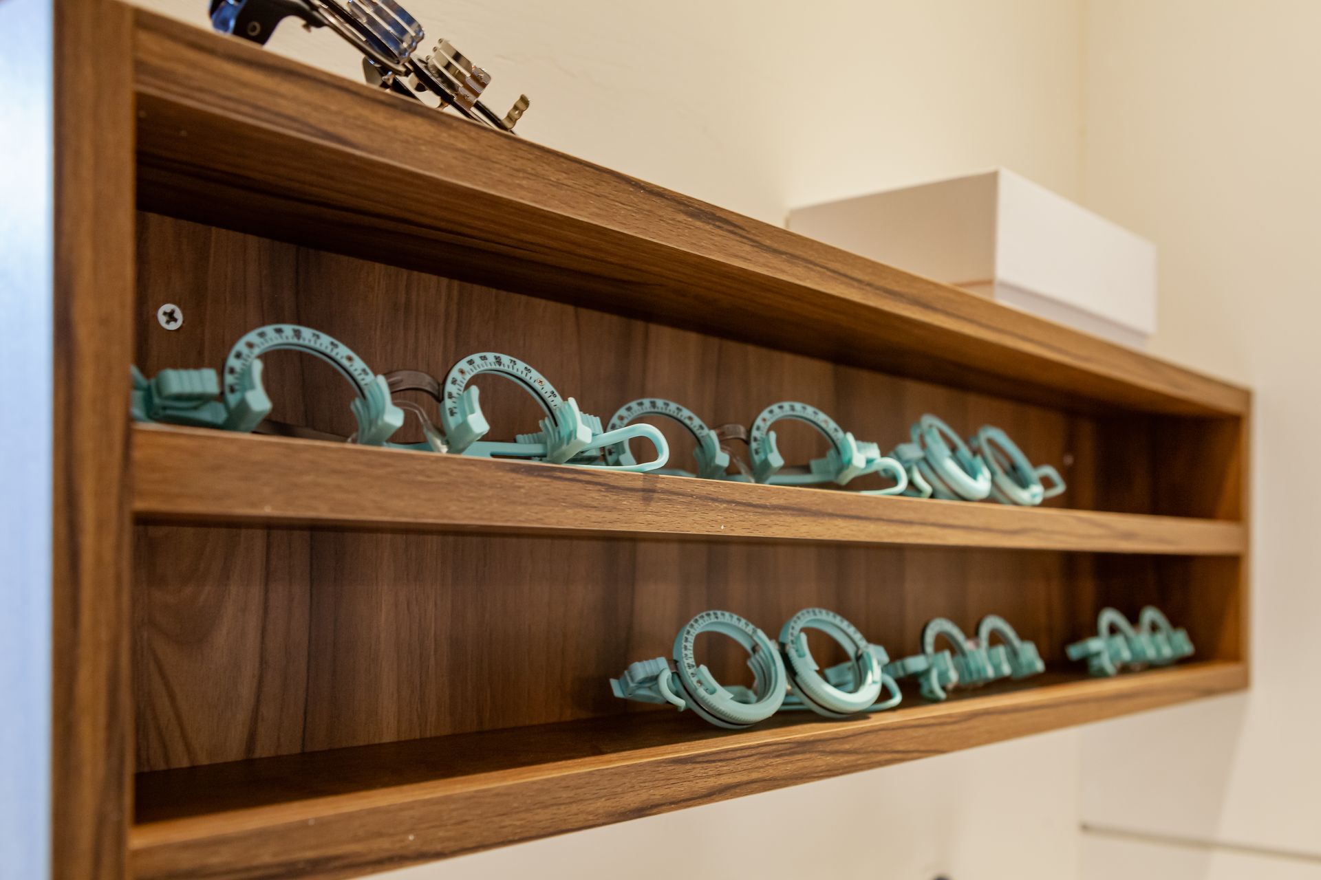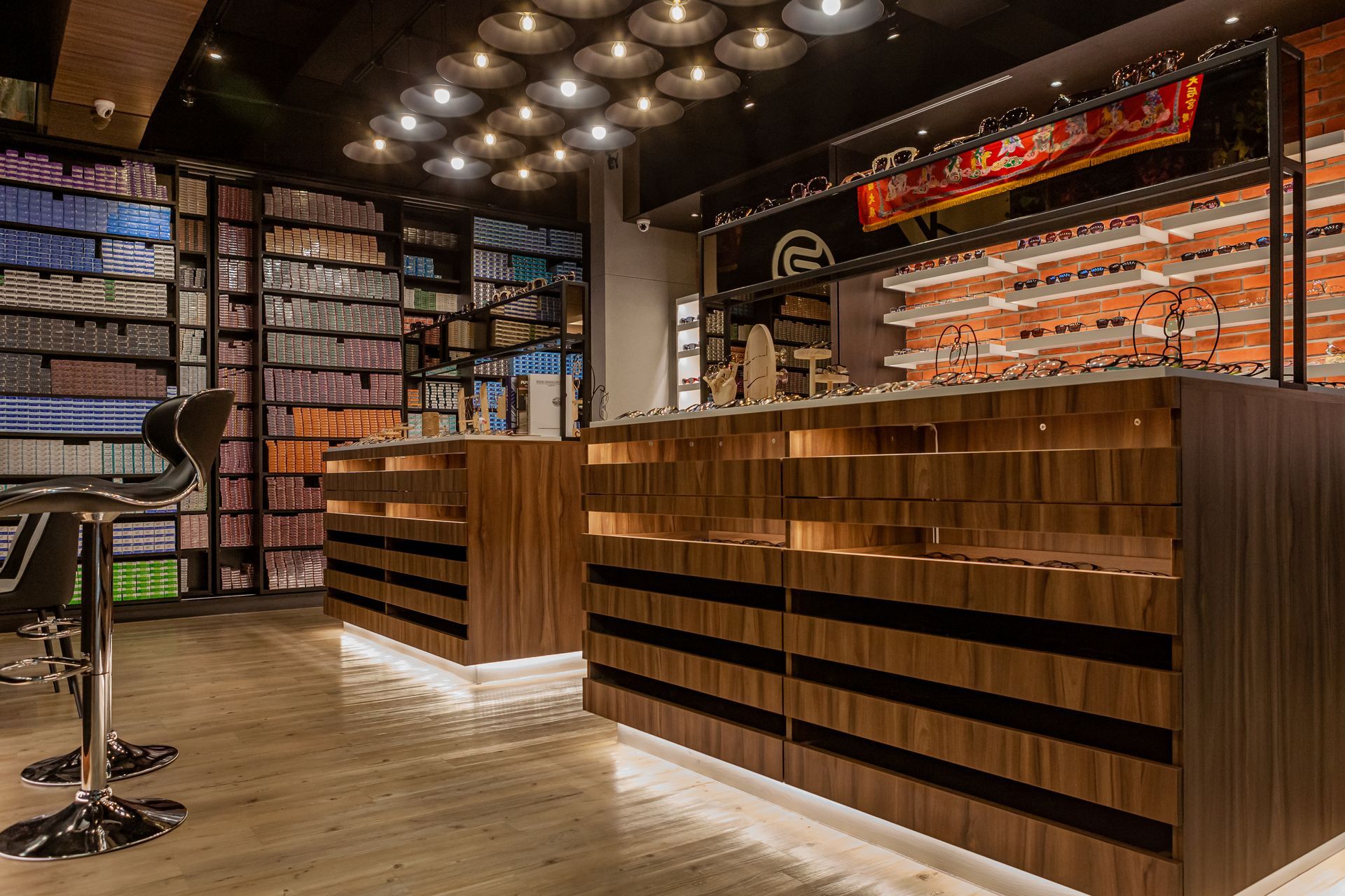 天花板上的燈具分布均勻,光線柔和而親切,既突顯了鏡框的質感,又營造了一個讓顧客感到舒適的購物環境。後方的牆面利用層架收納盒體的設計,增強了整體的秩序感,進一步強化了品牌的專業形象。