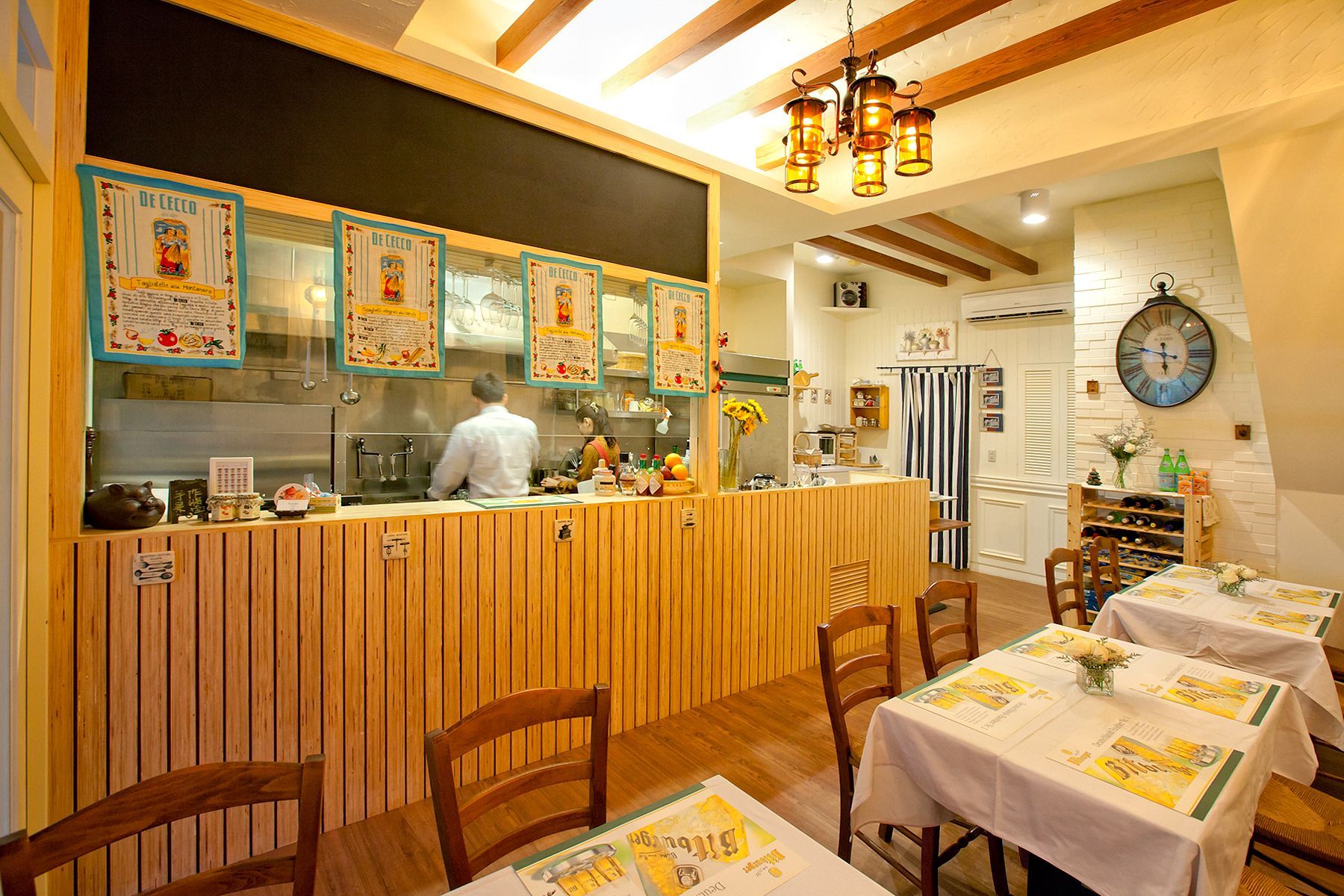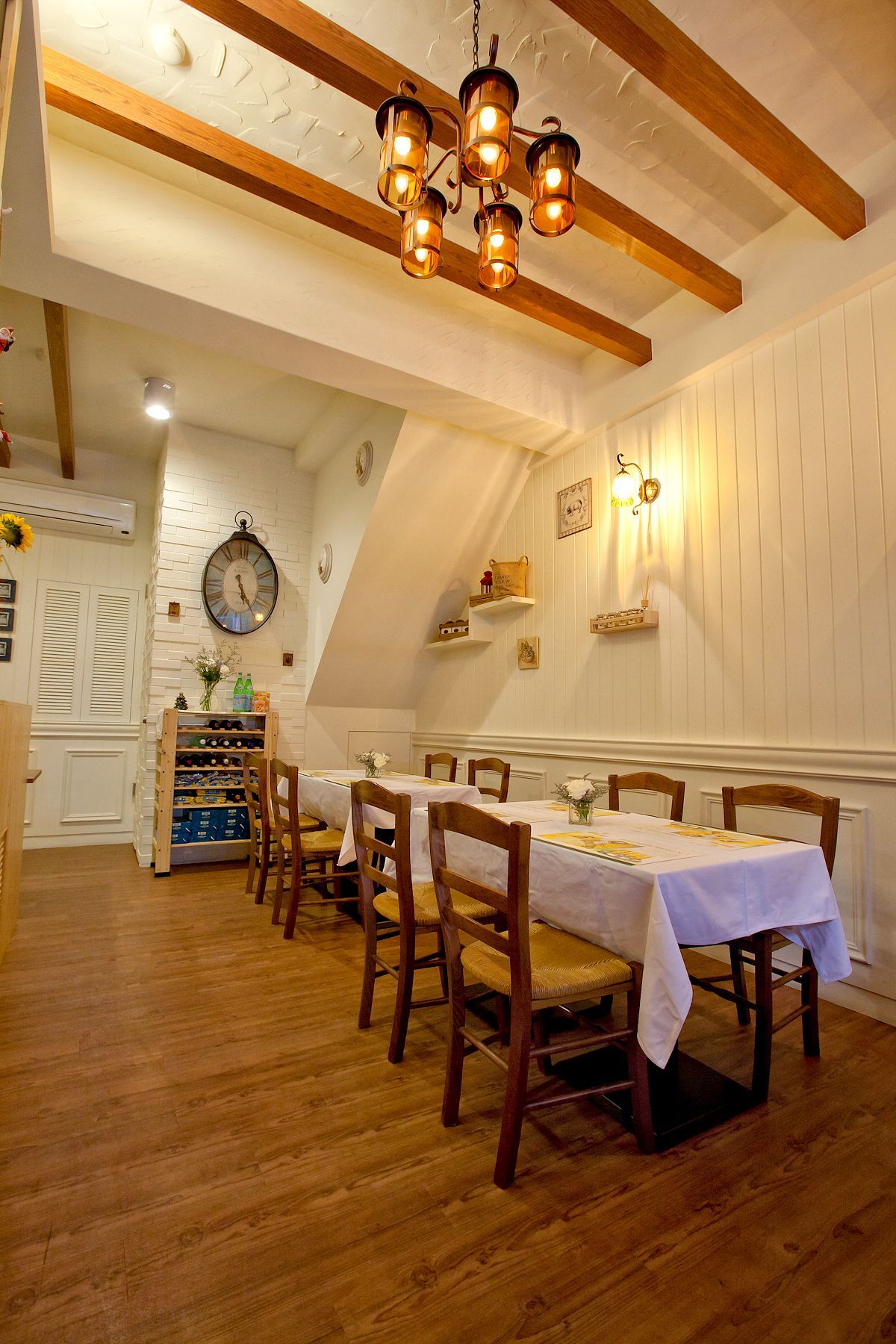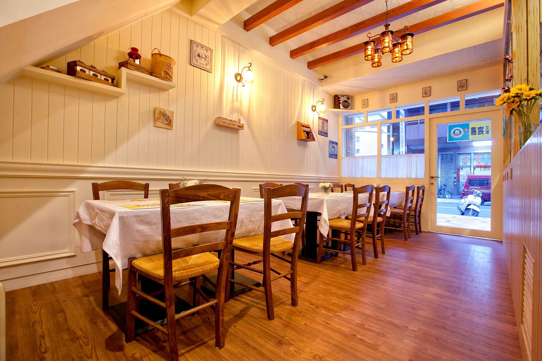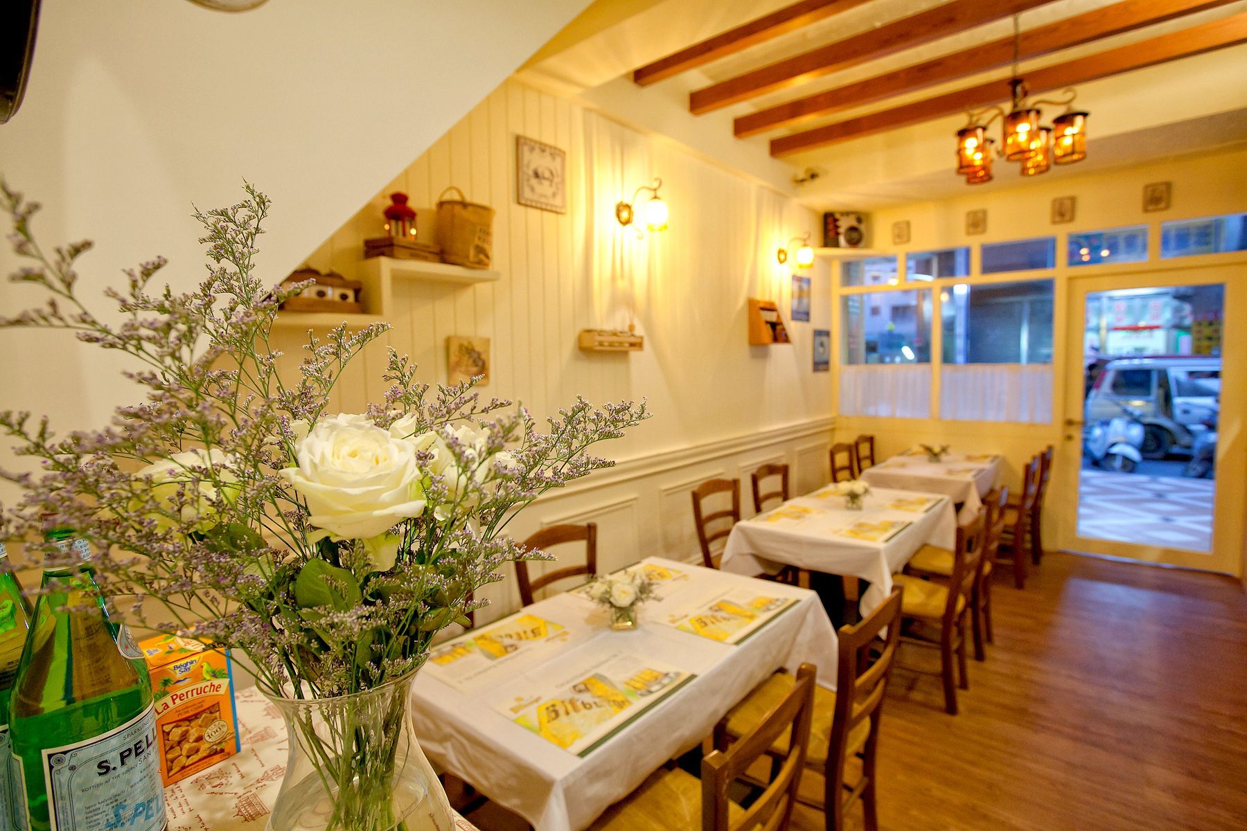 空間氛圍以木質元素與柔和燈光為主,整體設計讓人感受到自然的觸感與溫暖的懷抱。天花板的木樑與牆面裝飾,搭配黃光燈飾,營造出一種溫暖而親切的用餐環境,讓每位客人都能感受到賓至如歸的氛圍。桌面上鋪設的白色桌布上,生動的花卉點綴更是為整個餐廳增添了幾分鮮活與生機,細節中無不展現出對於精緻的款待感受,讓人倍感舒適與愉悅。