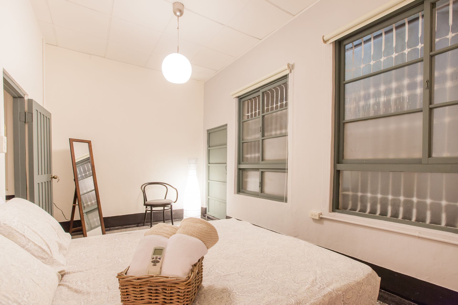 燈光設計以紙質立燈與自然光相互呼應,讓空間在白天與夜晚都能保持柔和的光感。家具如木椅、立鏡與衣架,皆以簡潔造型呈現,呼應整體的復古與現代融合。
