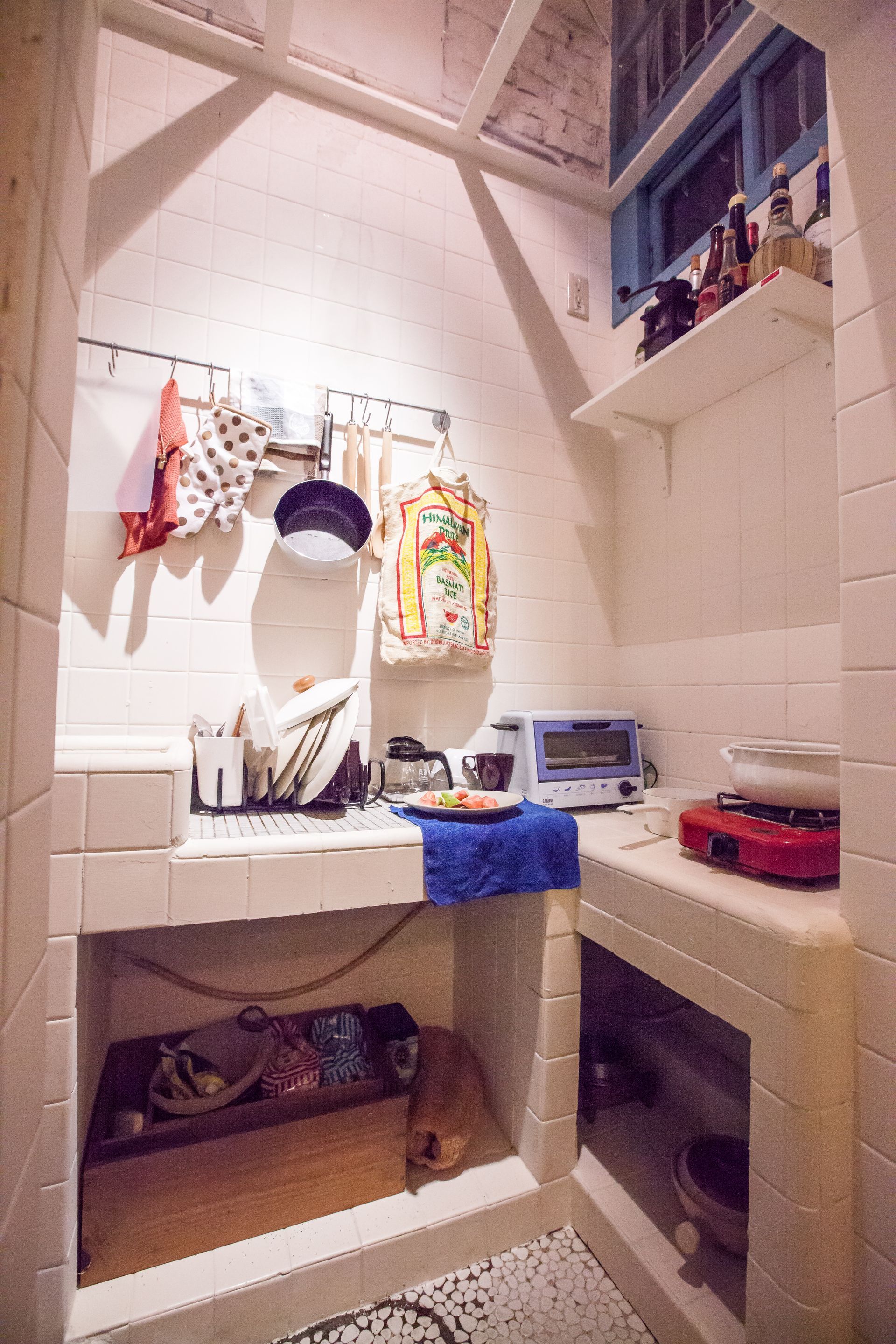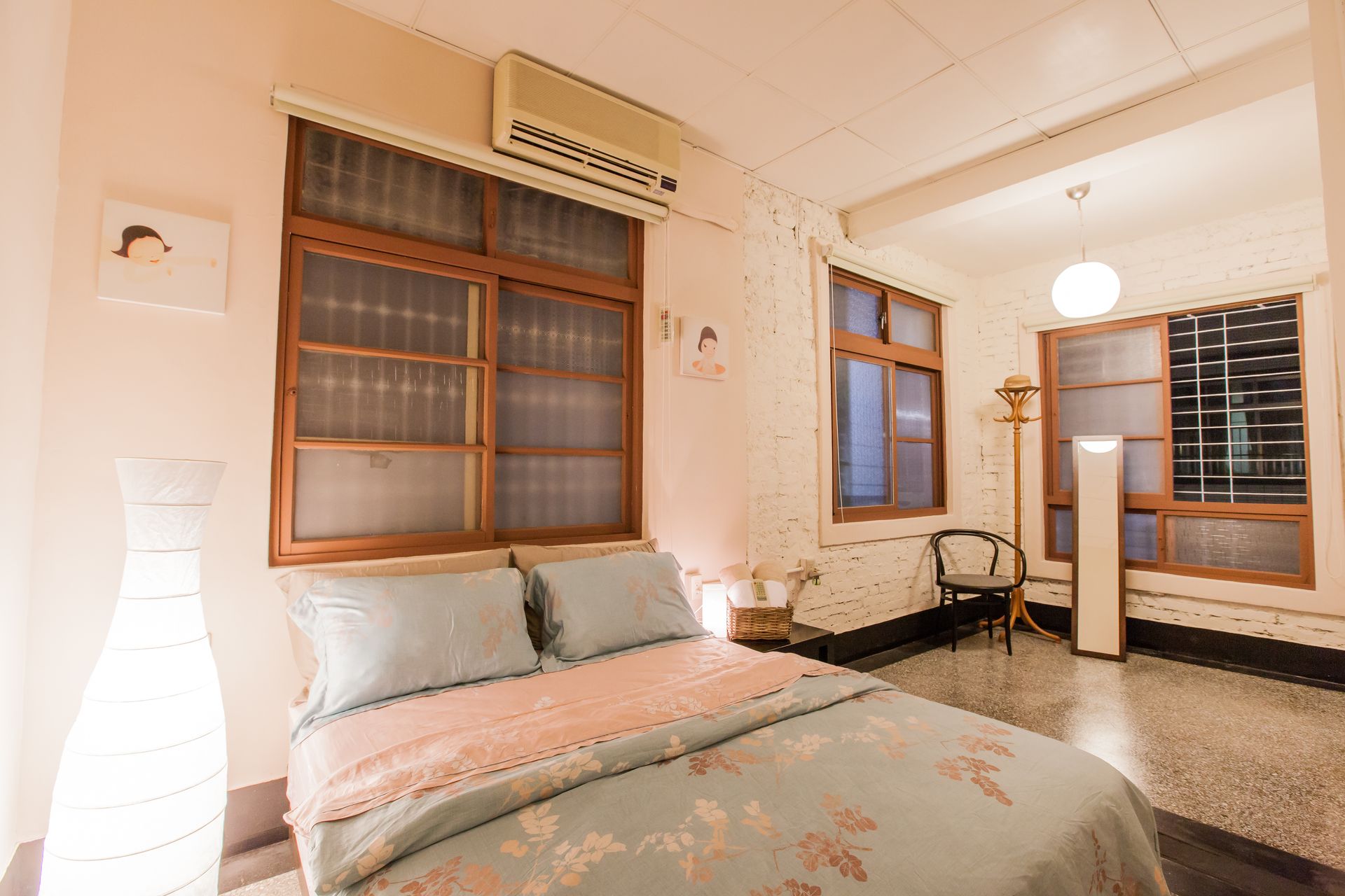 房間以木框窗與磨石子地板保留舊屋的特色,牆面結合白磚與平滑塗層,呈現出層次感。床鋪搭配柔和色系的寢具與花紋毯子,營造出親切而放鬆的氛圍。