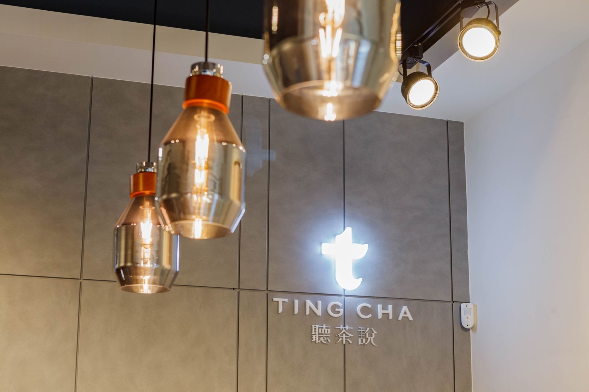本案以茶飲店的空間設計為主題,整體風格以灰色牆面與黑色大理石櫃檯為基調,搭配金色細節,營造出精緻而現代的氛圍。天花板懸掛的吊燈提供柔和光線,讓空間在冷調材質中仍保有溫潤感。