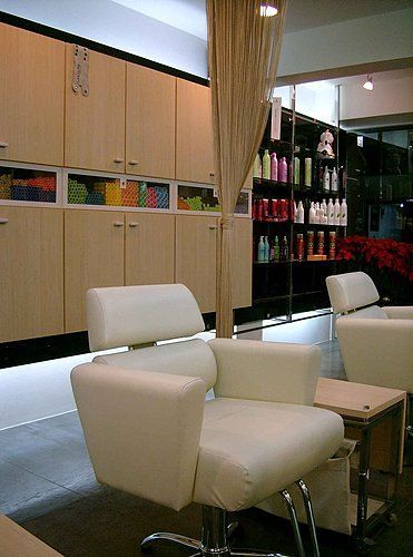 座位區以白色美髮椅整齊排列,面向鏡面,並配置小桌以便放置工具與用品,形成清晰有序的工作動線。牆面櫃體收納各式美髮產品,兼具展示與功能性。