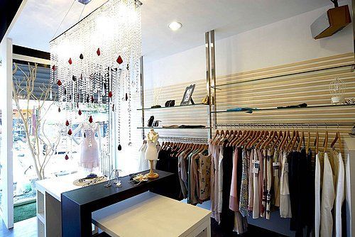 右側衣架以木質吊掛,服飾依照色系與款式整齊排列,展現出柔和的視覺效果。中央展示桌搭配模特兒,呈現完整穿搭與配件,提供顧客直觀的造型靈感。