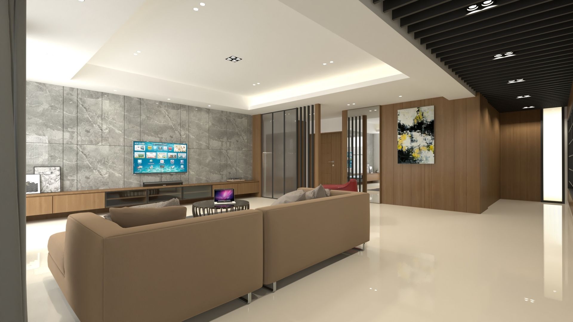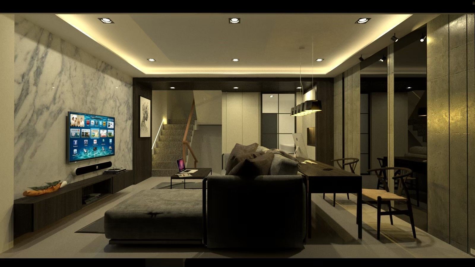 本案以「沉穩中的溫度」為核心,透過深淺木質、石材紋理與柔和光源,營造層次豐富卻不張揚的居住空間。公共空間以深色木作與石材電視主牆為視覺主軸,搭配線性間接照明與格柵分割語彙,展現穩重而富節奏感的現代風格,同時整合收納與機能,使空間更顯俐落完整。