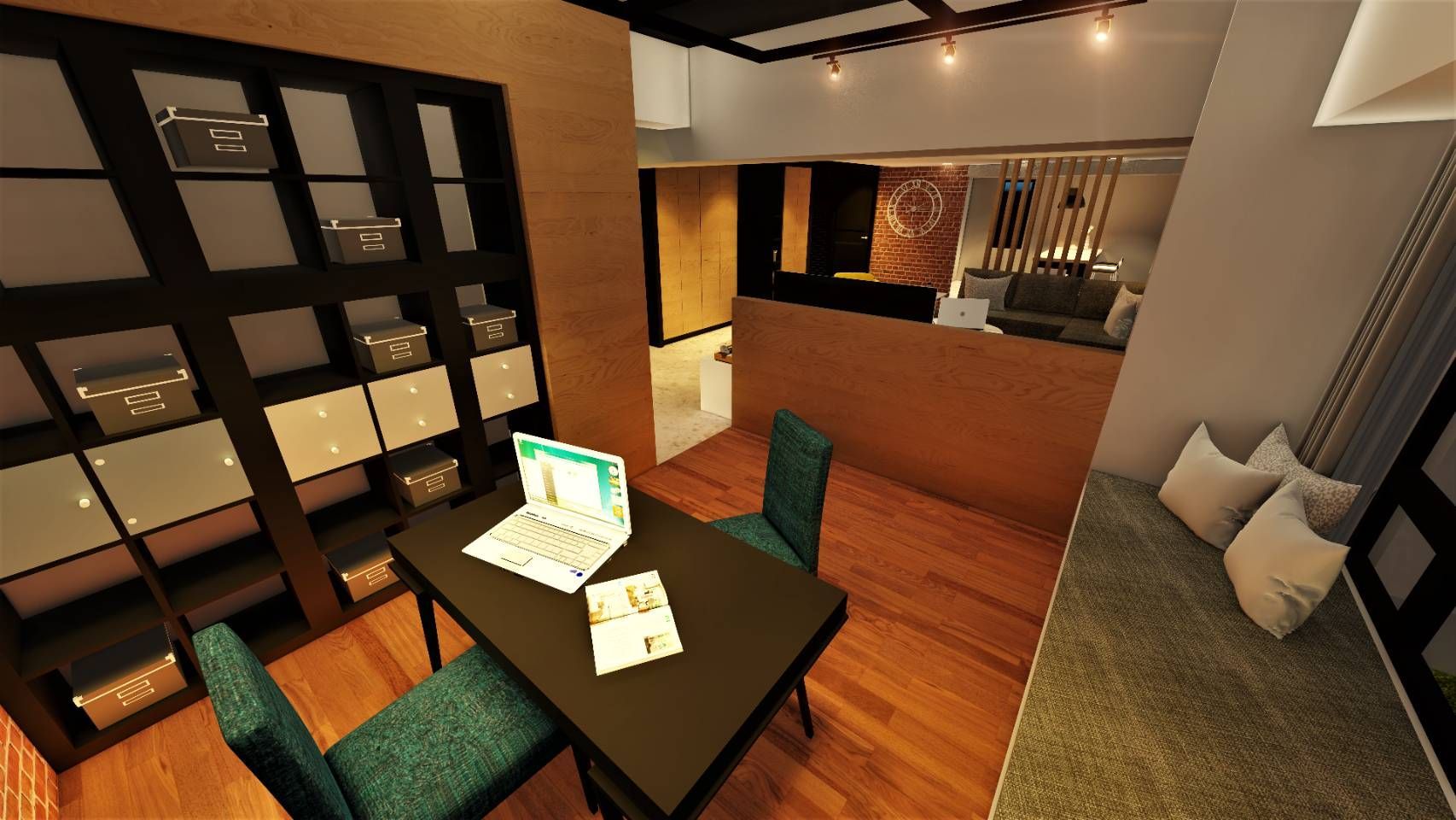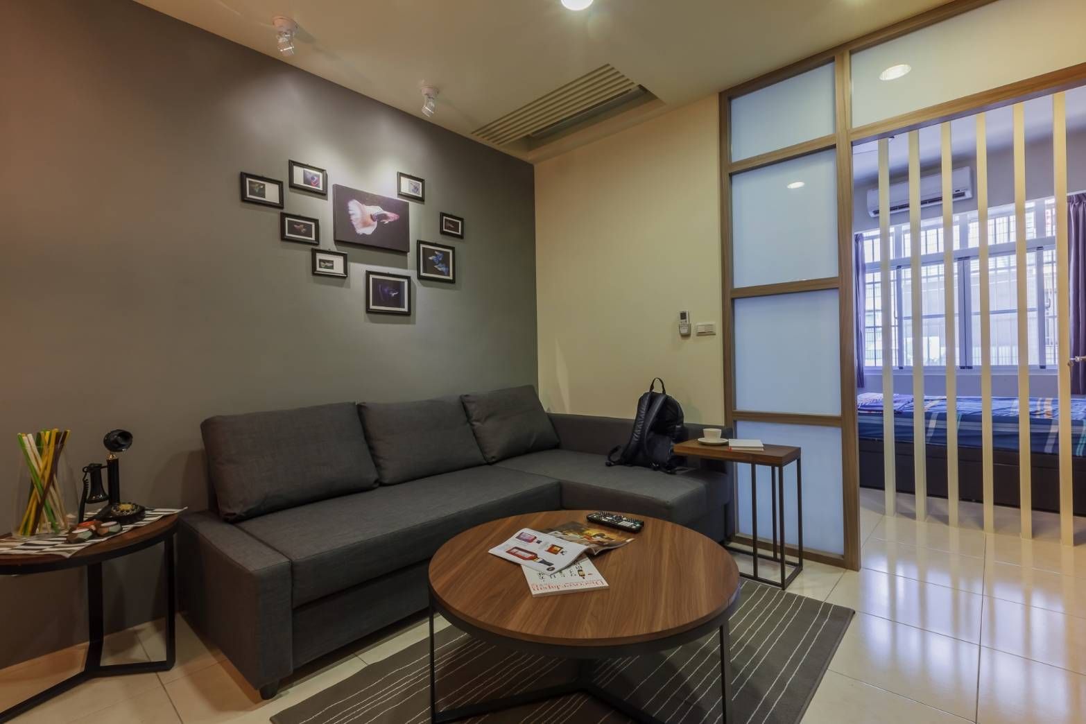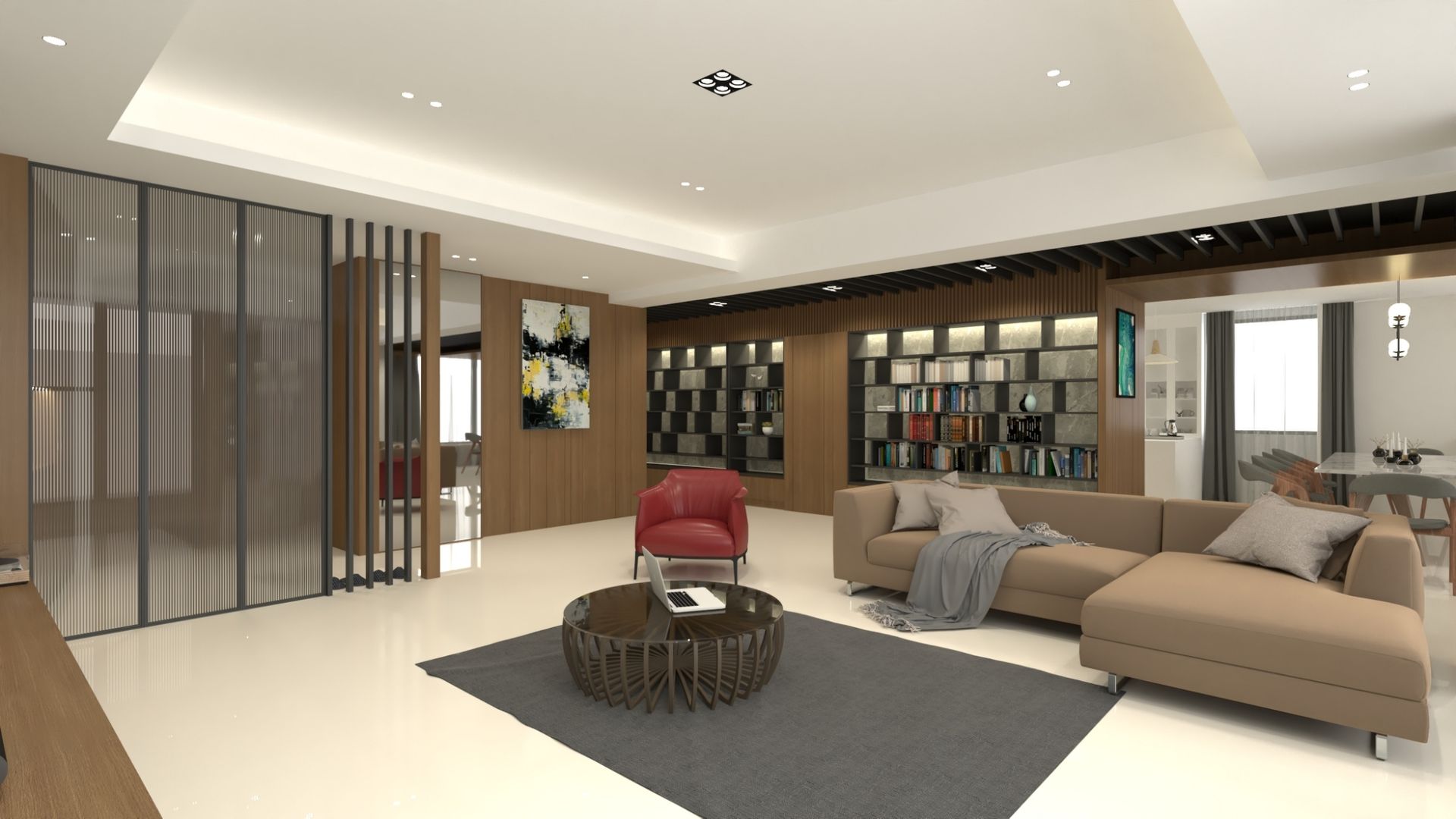 公共空間採開放式格局,透過木質格柵界定場域,兼顧通透與隱私。大面窗景引入充沛自然光,讓光影在木地板與磚牆間流動,營造豐富層次。家具配置以簡約線條為主,搭配跳色地毯與藝術掛畫,增添生活感與設計張力,打造兼具機能與美感的交流場域。
