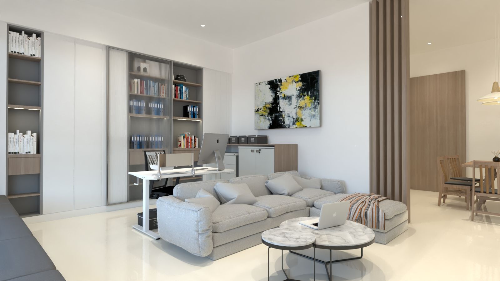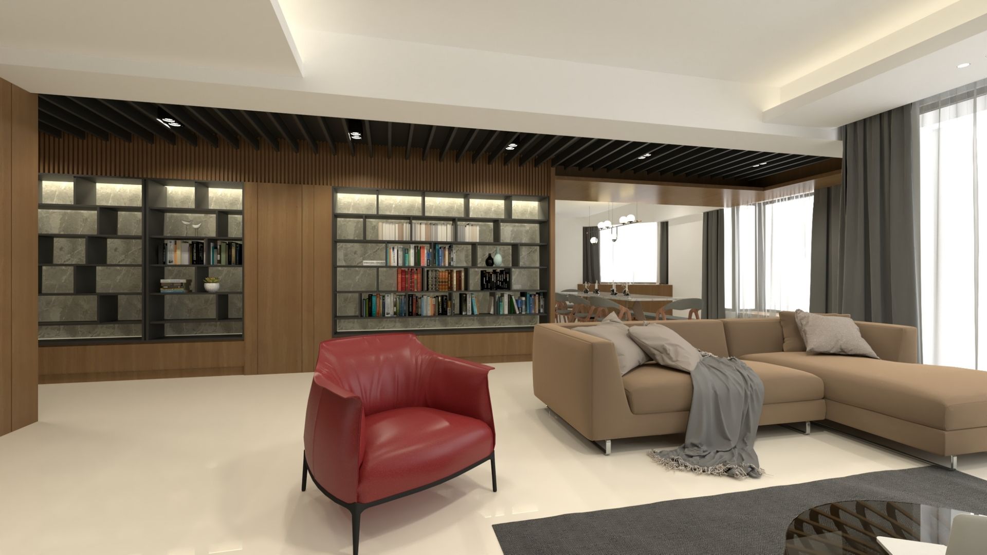 天花板以間接照明勾勒空間輪廓,中央吊燈如藝術品般點綴其中,提升整體格調。電視主牆透過異材質拼接設計,增加層次變化與空間深度。客廳與書房之間以格柵與半開放式設計界定場域,使光線自然流動,同時保有場域獨立性,形塑流暢而優雅的生活動線。
