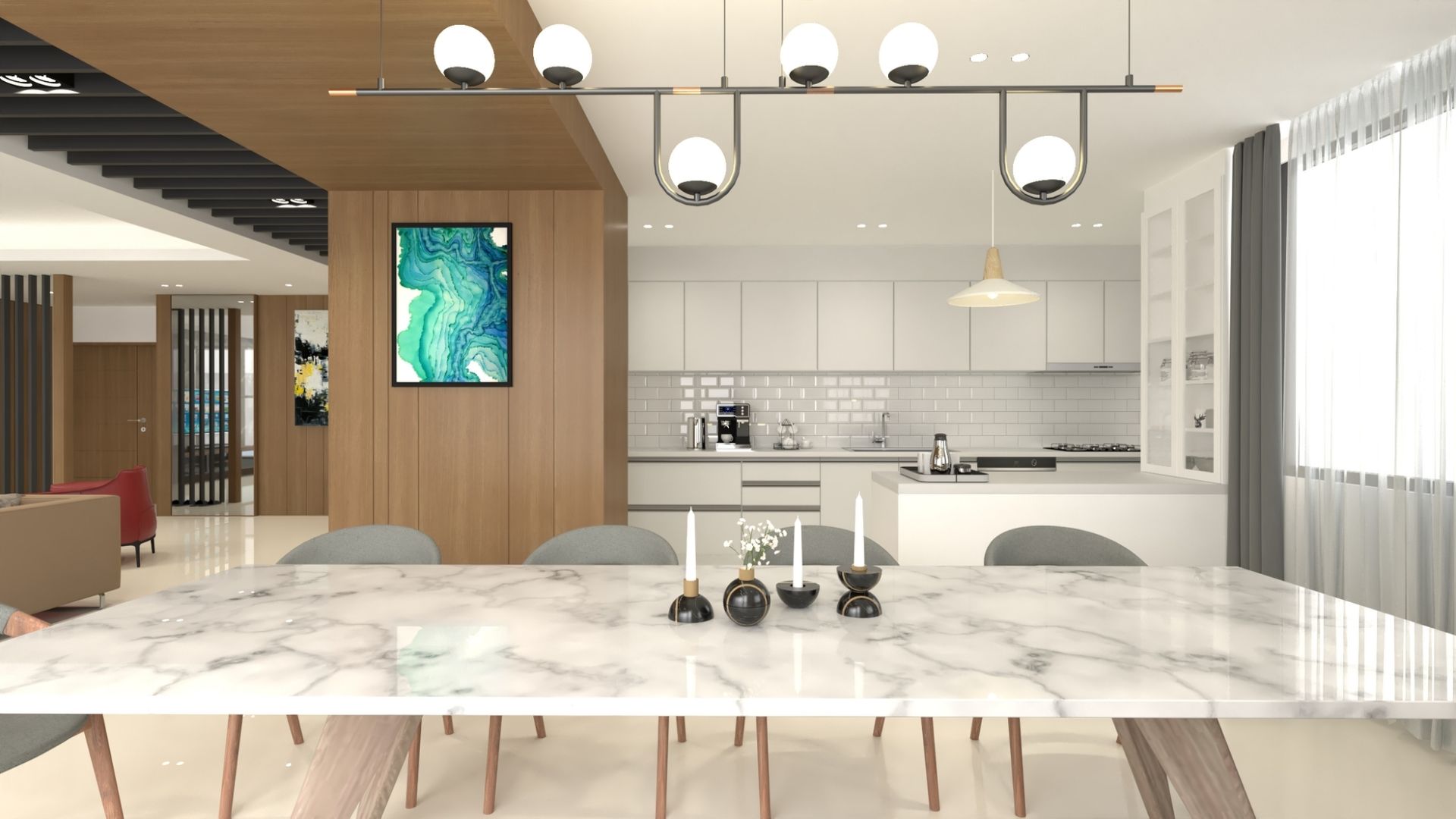 本案以人文雅致為核心主題,透過開放式格局串聯客廳、餐廳與廚房,形塑流暢而通透的生活動線。大面積木質牆面與格柵天花相互呼應,搭配石材紋理與金屬燈飾細節,營造溫潤中帶有層次的空間表情。局部以跳色單椅點綴,為沉穩基調注入視覺亮點,使公共場域兼具質感與活力。