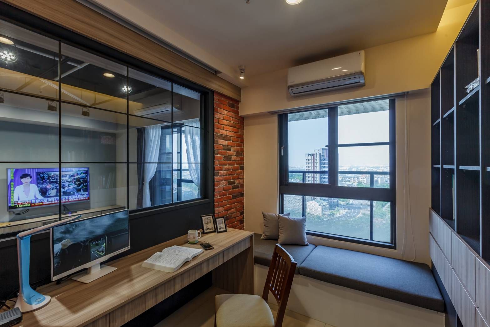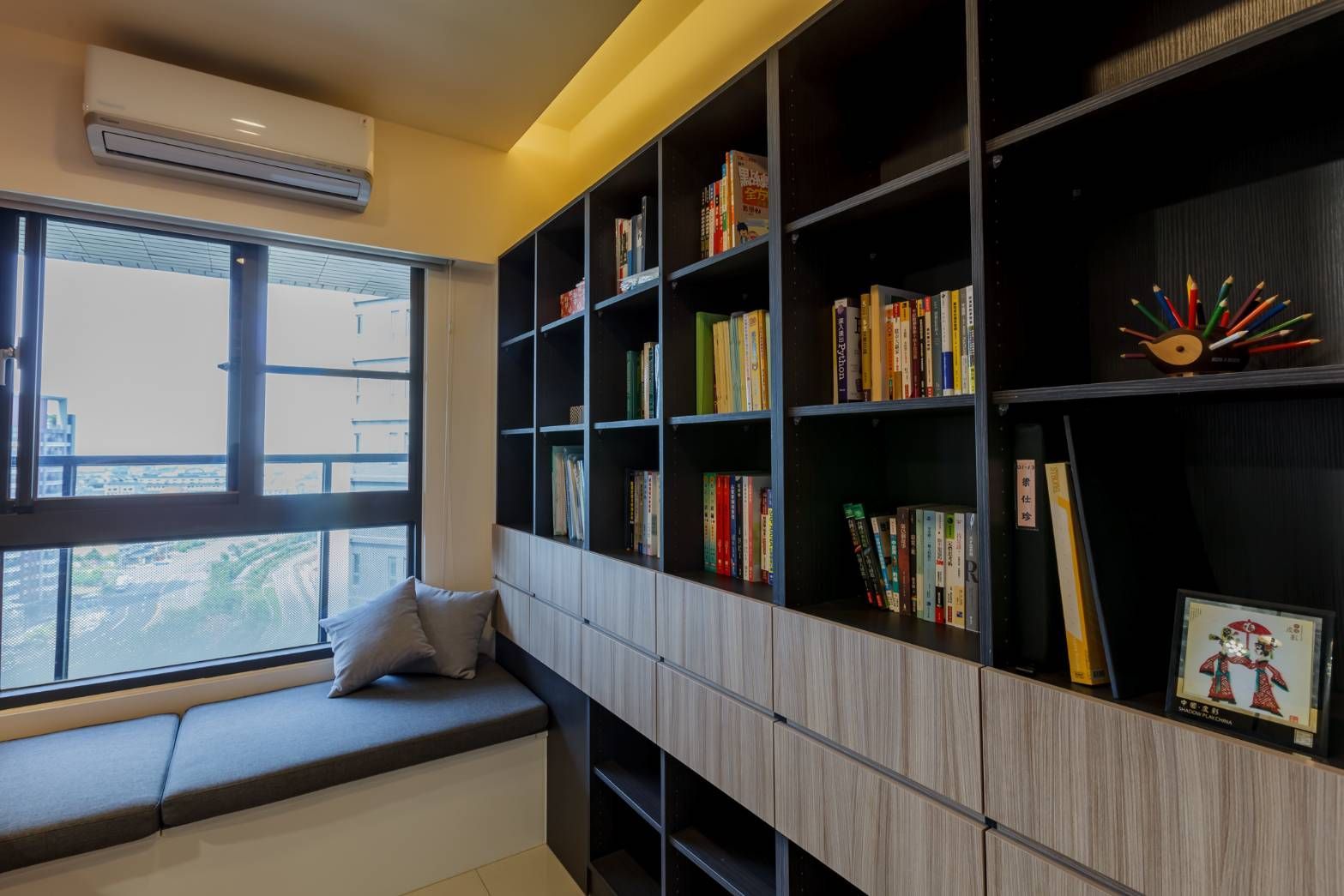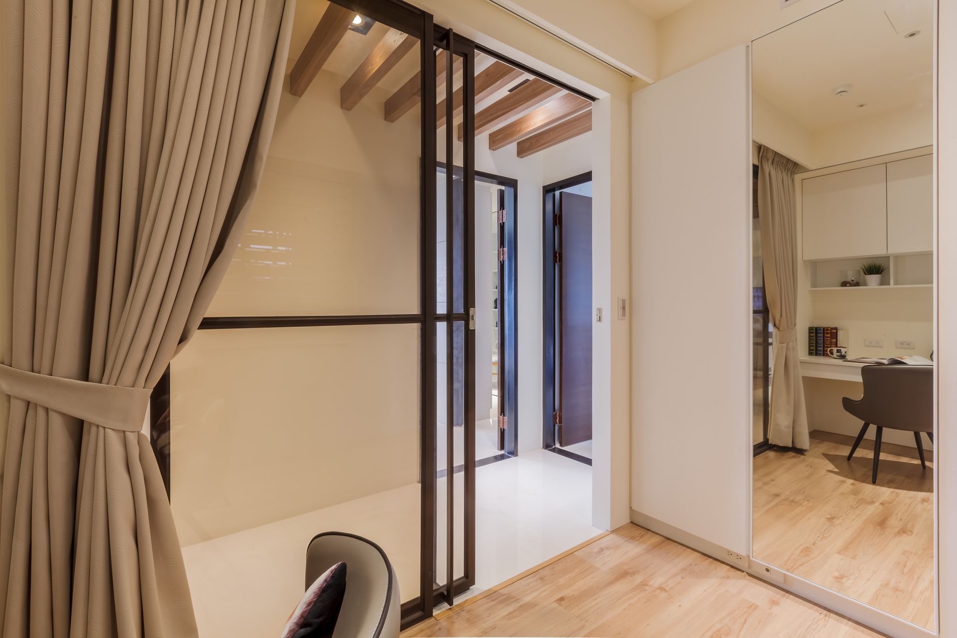 書房以黑框玻璃拉門區隔場域,兼顧獨立與開放機能,窗邊臥榻提升使用彈性。全室透過整合式櫃體強化收納機能與立面一致性,打造兼具風格與實用性的理想居所。