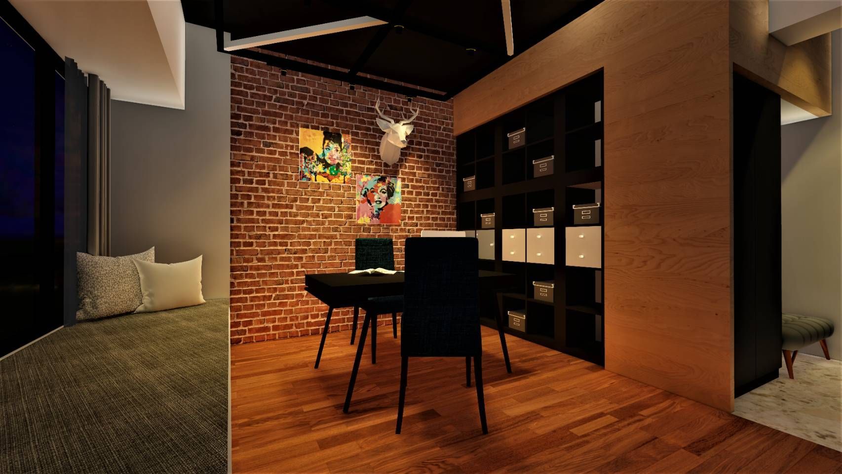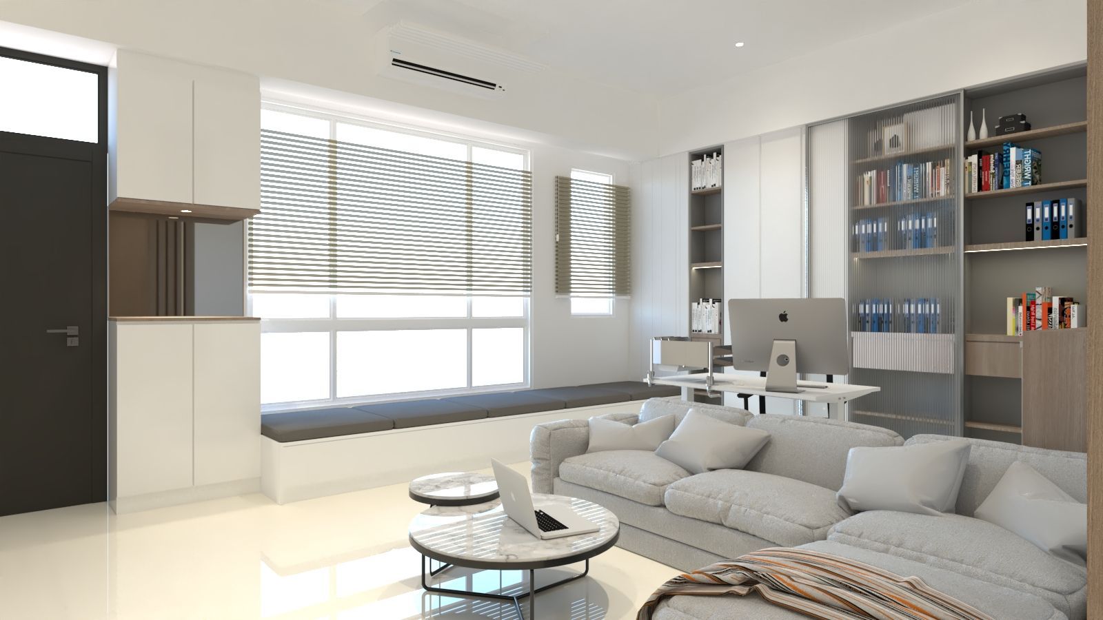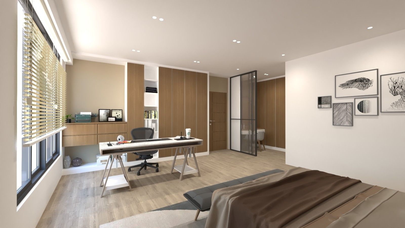 書房以黑框玻璃拉門區隔場域,兼顧獨立與開放機能,窗邊臥榻提升使用彈性。全室透過整合式櫃體強化收納機能與立面一致性,打造兼具風格與實用性的理想居所。