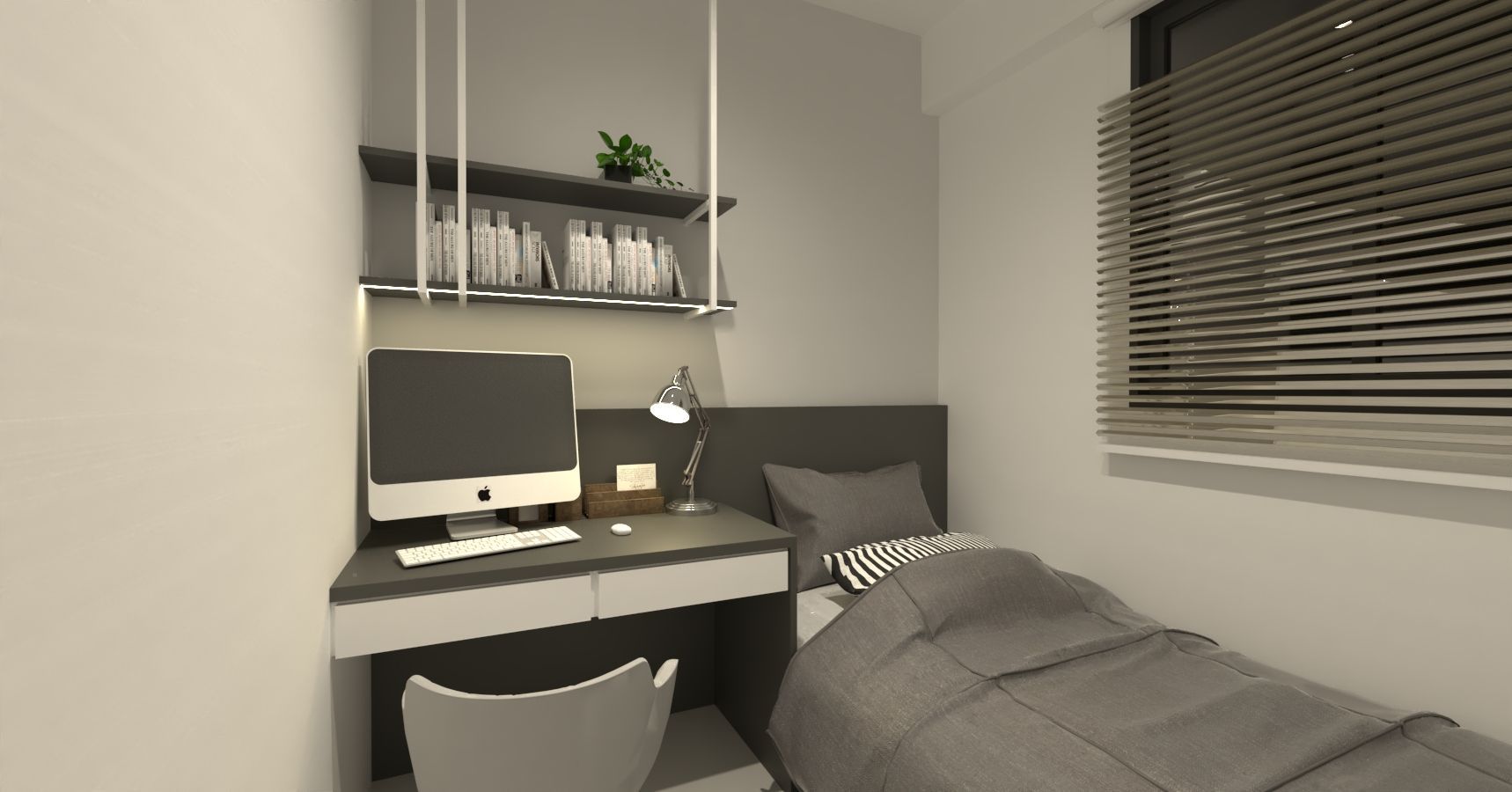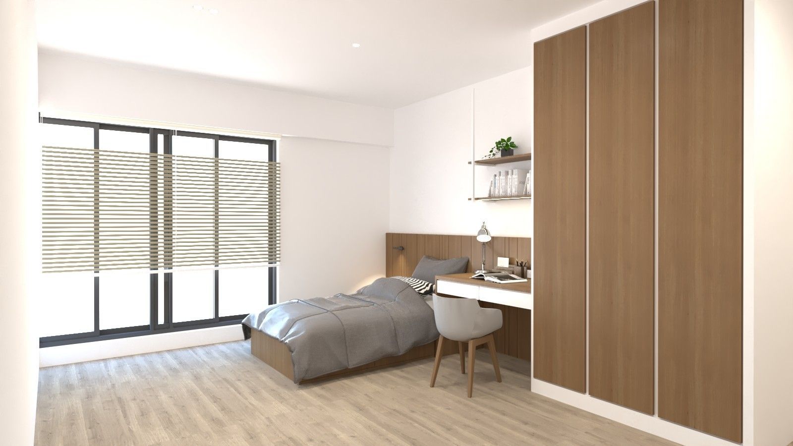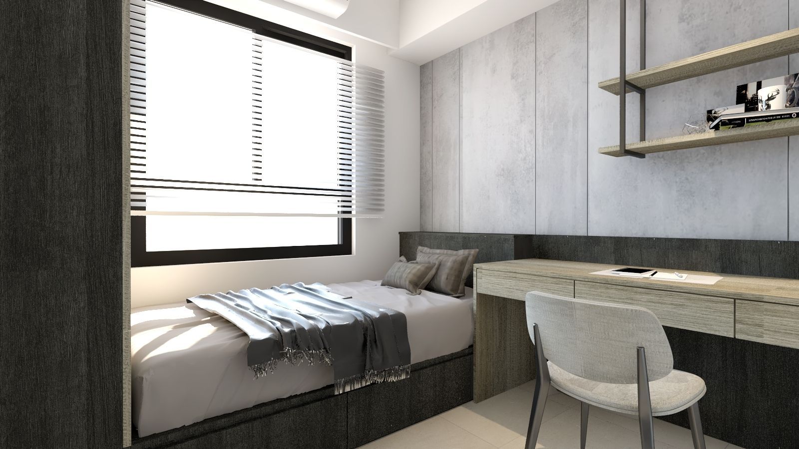 臥室延續整體色系,以灰調立面與深色床頭背板勾勒沉靜氣息。床側整合書桌與抽屜收納,上方層板提供展示與置物功能,打造兼具休憩與工作的複合場域。整體設計在材質、比例與光線間取得平衡,讓有限空間發揮最大效益,實現機能與美感並存的理想居所。