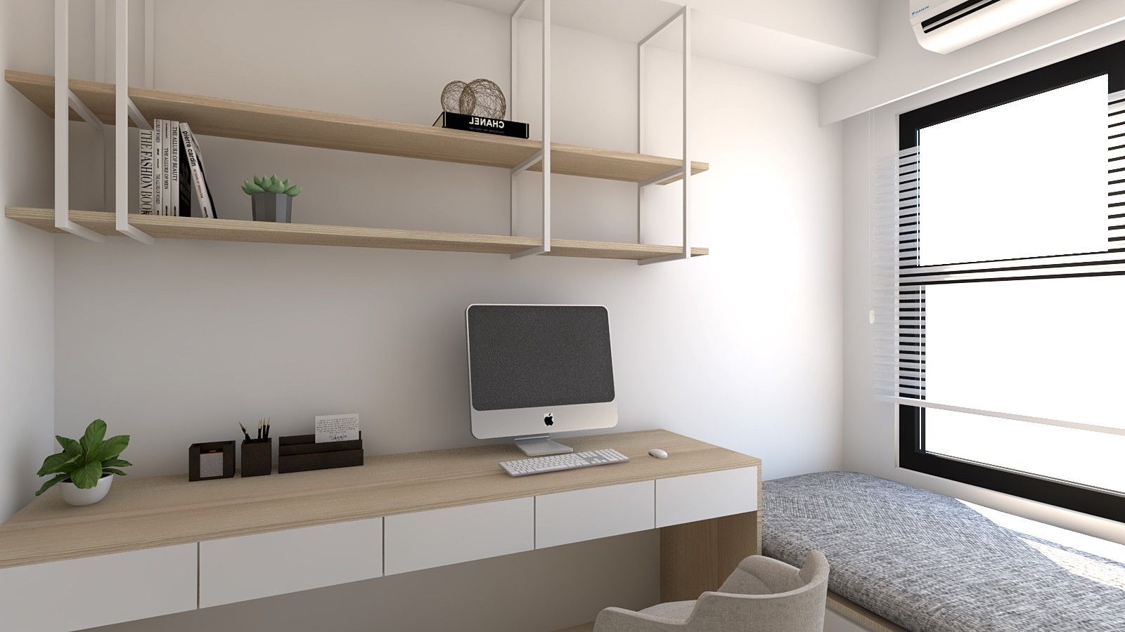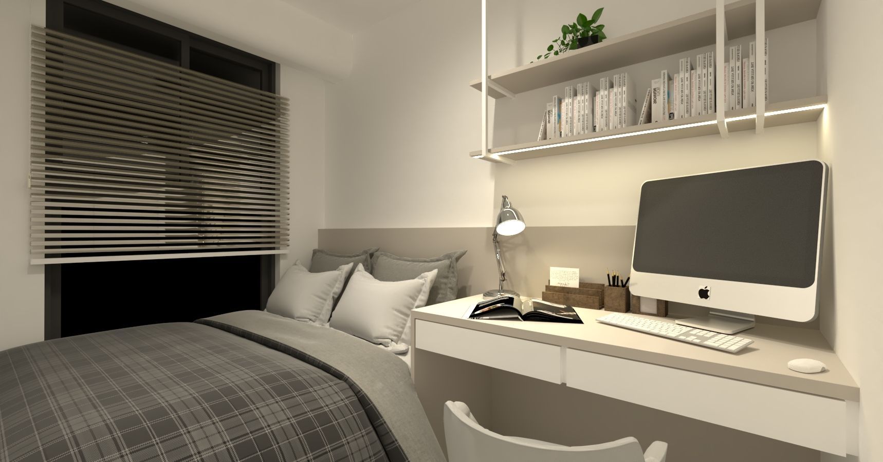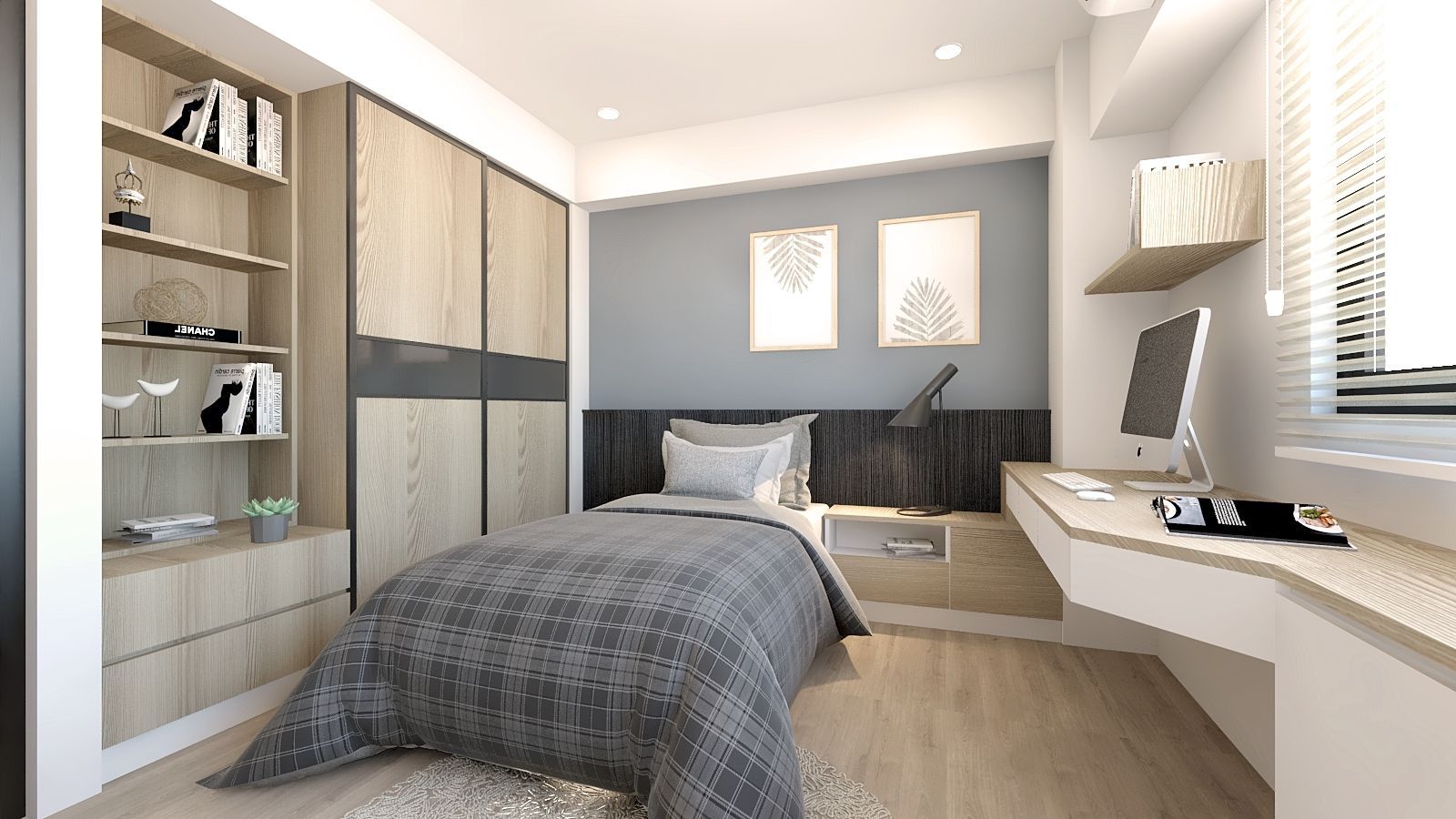 臥室延續整體色系,以灰調立面與深色床頭背板勾勒沉靜氣息。床側整合書桌與抽屜收納,上方層板提供展示與置物功能,打造兼具休憩與工作的複合場域。整體設計在材質、比例與光線間取得平衡,讓有限空間發揮最大效益,實現機能與美感並存的理想居所。