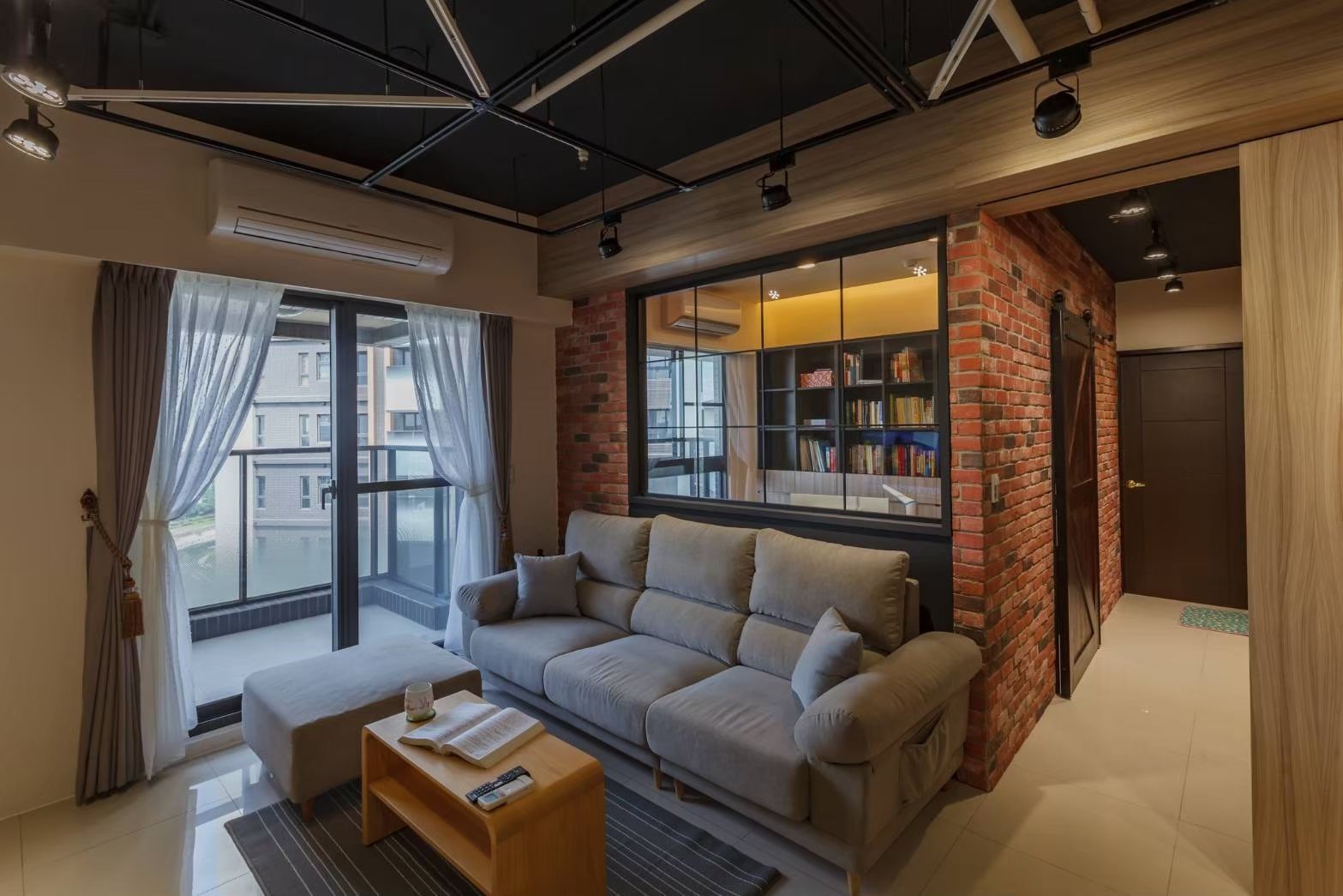 本案以溫潤工業風為設計主軸,揉合紅磚牆面、黑鐵件與木質元素,在剛硬與柔和之間取得平衡。開放式客餐廳串聯公共空間,搭配軌道燈與結構線條,形塑俐落有層次的視覺表情,同時保有明亮通透的採光優勢。