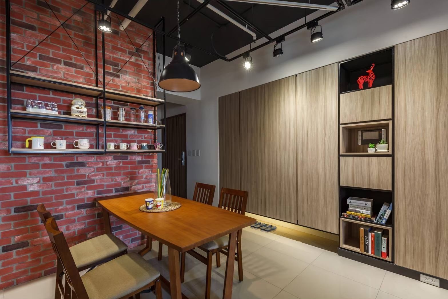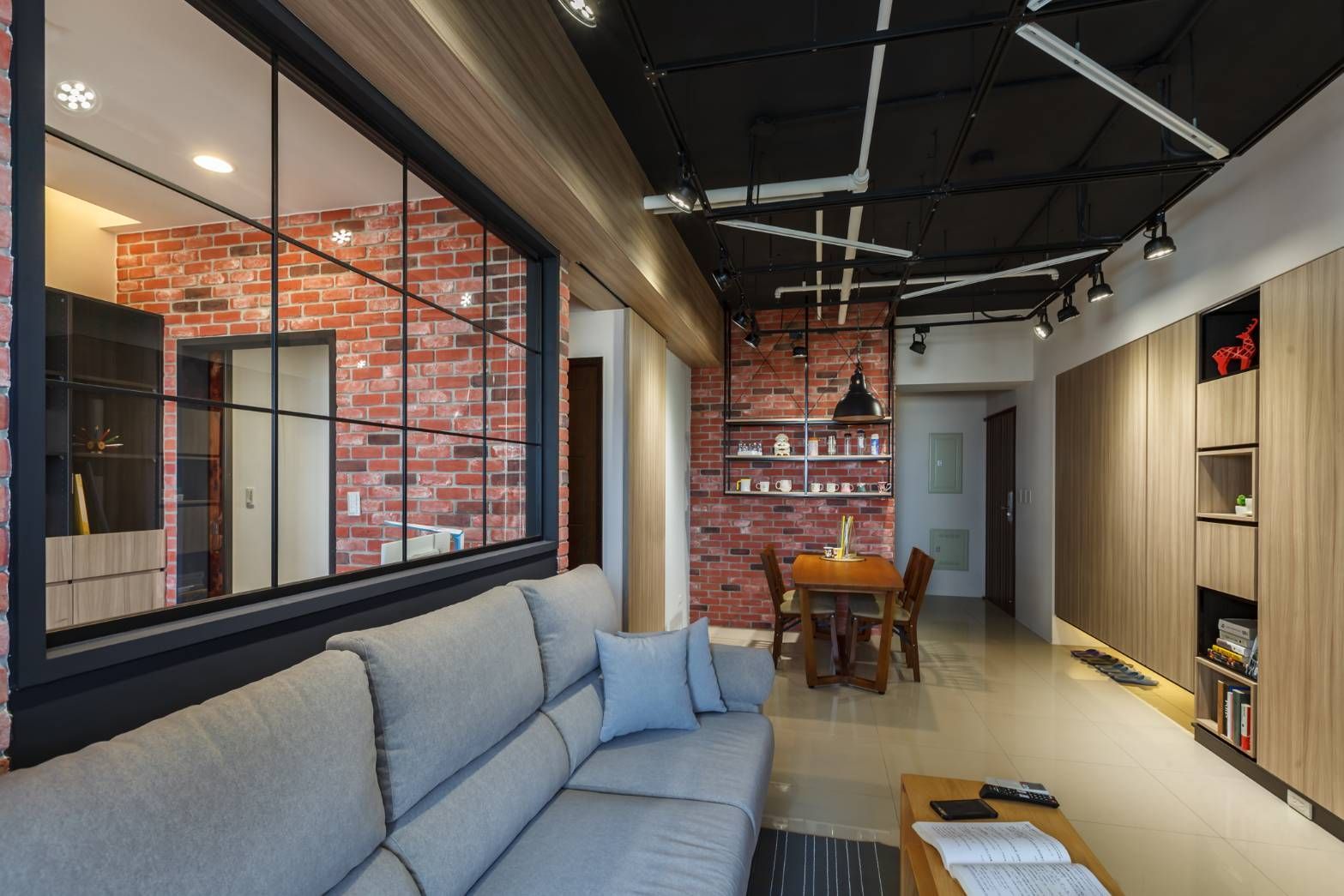 客廳以灰階沙發與溫潤木質家具中和紅磚的粗獷質感,大片窗景引光入室,讓日常生活更顯自在從容。餐廳牆面結合鐵件層架與展示收納,營造富有個性的端景,也讓生活物件成為空間風景的一部分。