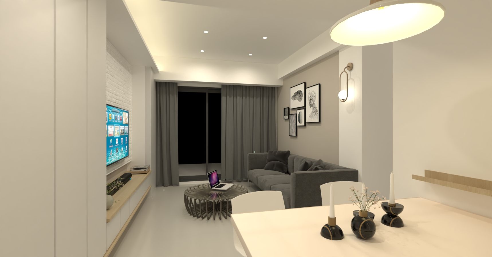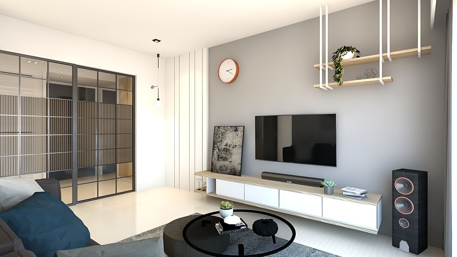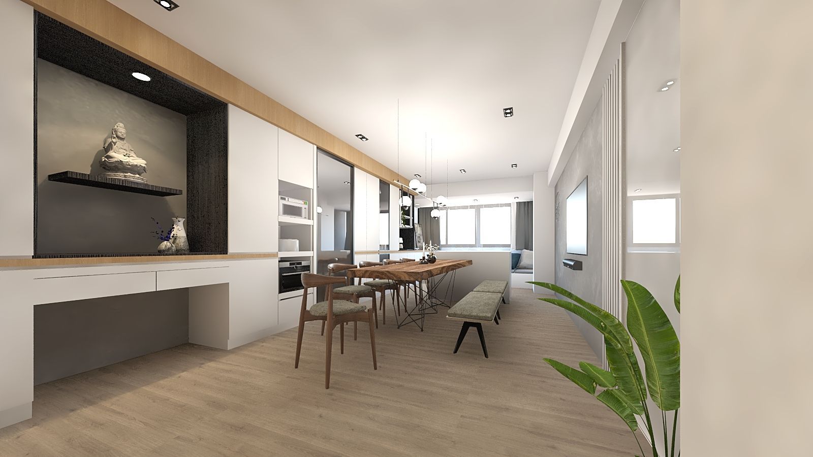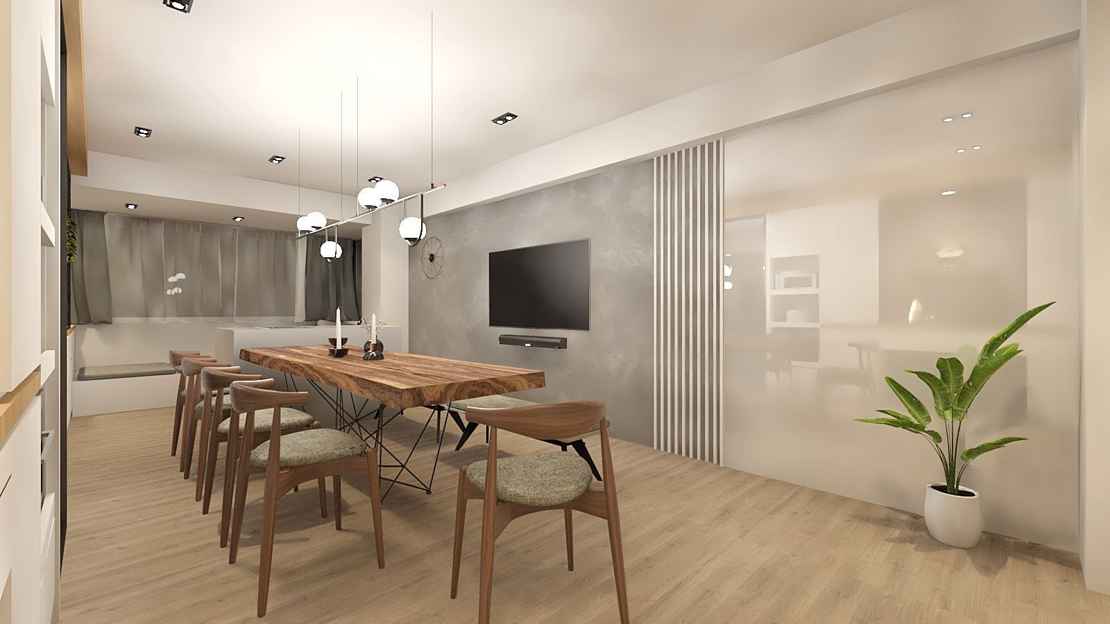 本案以現代簡約風為核心,透過溫潤木質與柔和灰白色調,營造明亮舒適的居家氛圍。客廳以電視主牆為視覺焦點,結合懸浮式收納櫃與層板設計,線條俐落且富有層次;大面玻璃拉門引入自然光線,搭配細節燈飾與植栽點綴,展現清新而不失質感的生活風格。