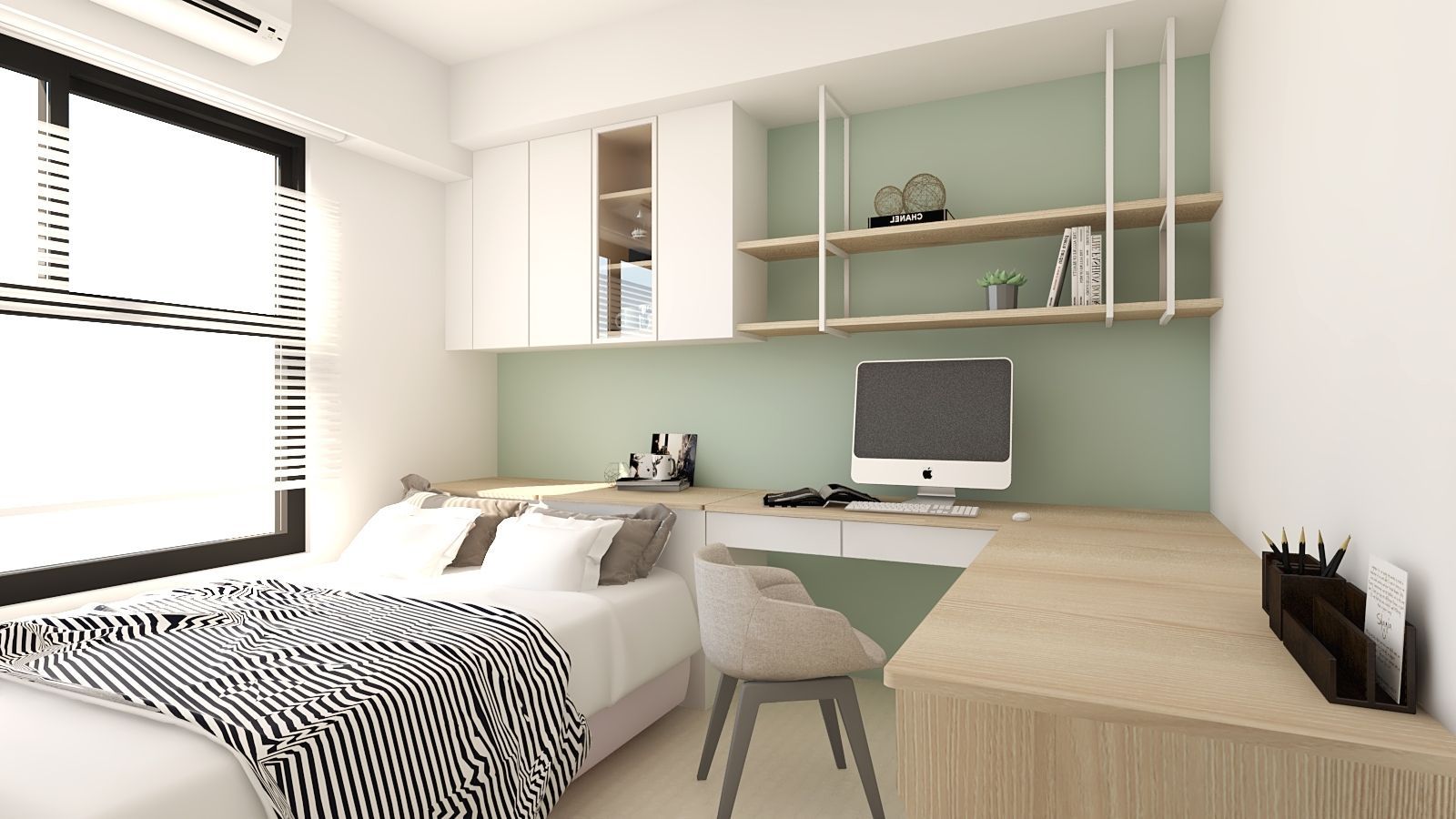 臥室延續自然木紋與柔和色彩,搭配淺綠主牆與簡約掛畫,營造靜謐放鬆的睡眠環境。床頭整合照明與收納機能,書桌與展示櫃一體成形,讓空間運用更為流暢。整體設計在美感與機能之間取得平衡,為屋主勾勒出溫馨且富有品味的理想居所。