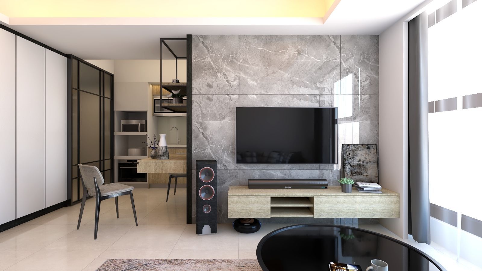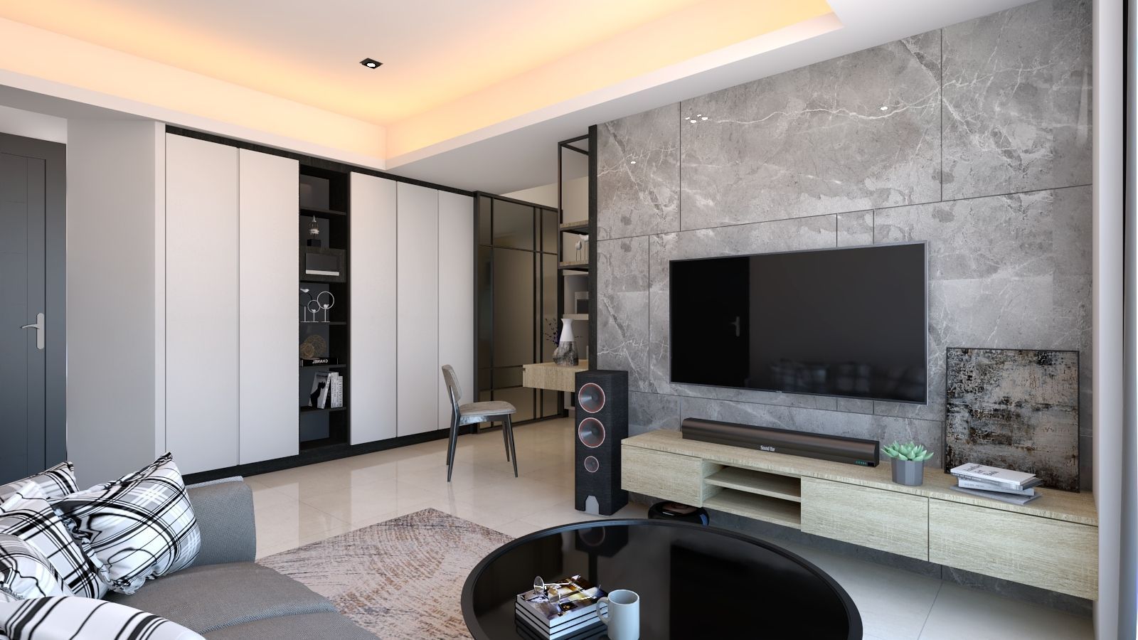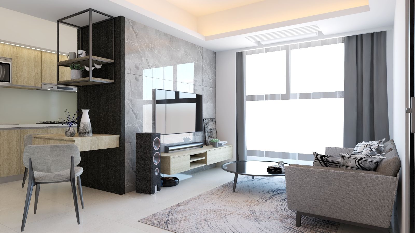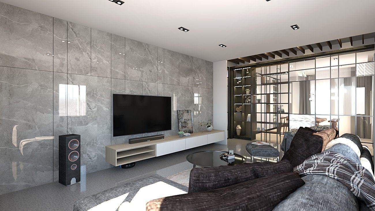 本案以現代簡約為核心,透過灰階石紋牆面與淺木質調的溫潤對比,形塑沉穩而不失溫度的生活場景。客廳電視主牆以大面石材紋理鋪陳,搭配懸浮式收納櫃與俐落線條,延伸空間視覺寬度。開放式層架結合鐵件與木質元素,成為客餐廳之間的輕隔間,兼具展示與收納機能,讓空間在通透中保有層次。