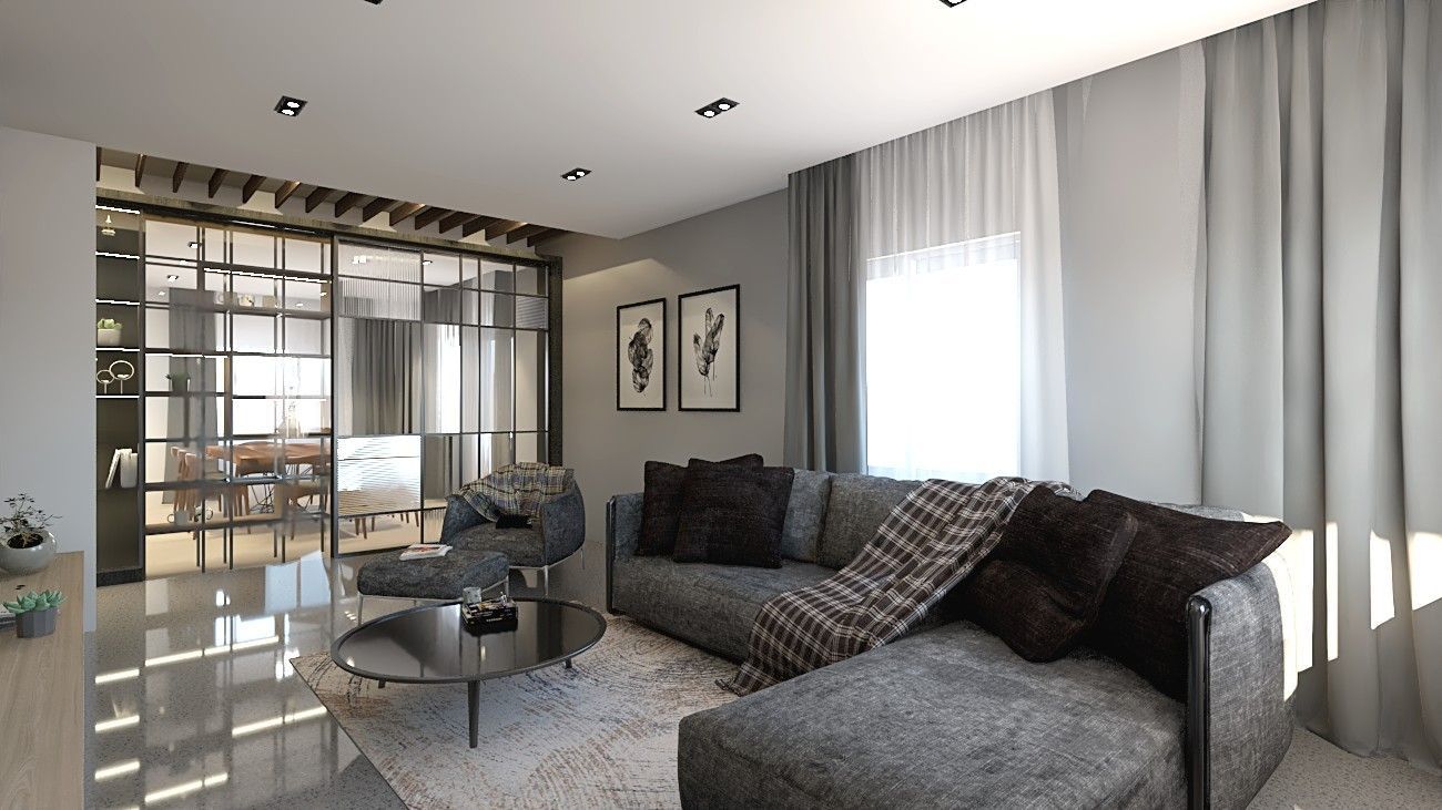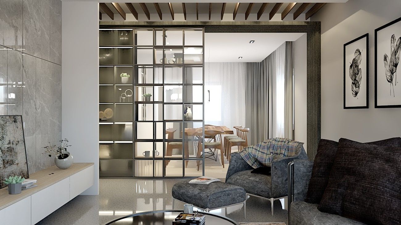 本案以沉穩內斂的語彙鋪陳生活場景,透過木質肌理、鐵件格柵與玻璃屏風的交織,形塑出富有層次的空間表情。客廳選用深灰布質沙發搭配低彩度織品,襯以溫潤木地板與柔霧光源,營造安定而放鬆的氛圍。半穿透的鐵件拉門串聯客餐廳,既保有通透視野,也界定場域機能,使公共空間在開闊與私密之間取得平衡。
