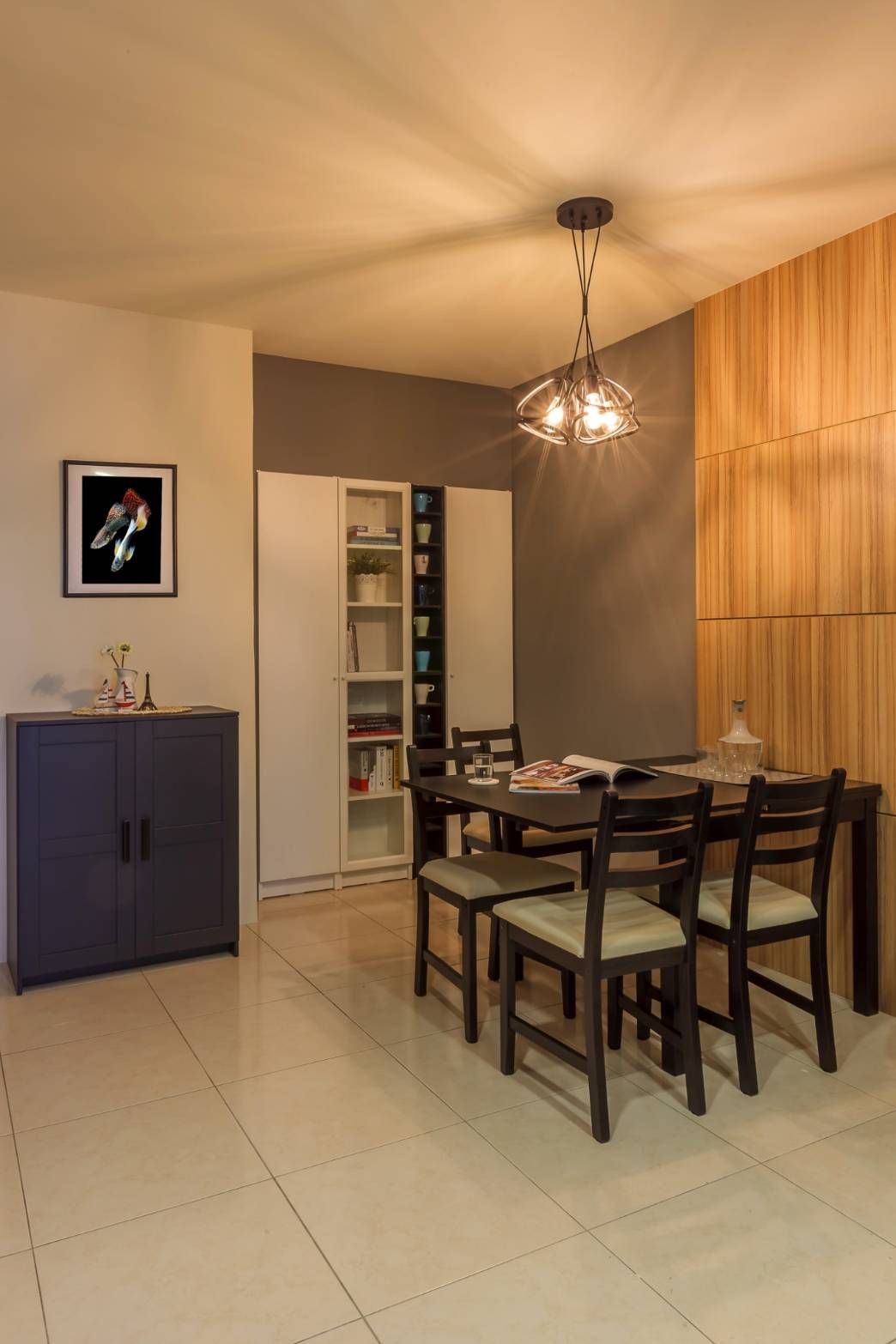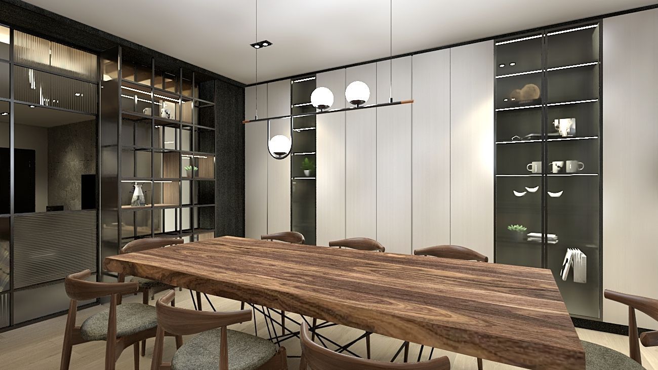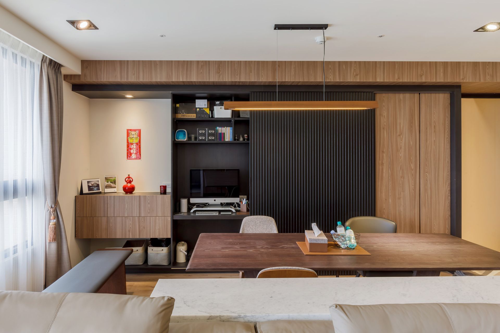 餐廳以厚實木質餐桌為核心,結合中島機能與展示收納櫃體,兼顧實用與美感。懸吊燈飾強化空間垂直層次,與書牆、滑門設計相互呼應,形塑有秩序的生活動線。細節處透過軟裝織品、金屬配件與綠意植栽點綴,使空間在沉穩基調中增添生活溫度。