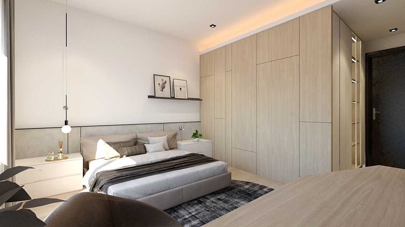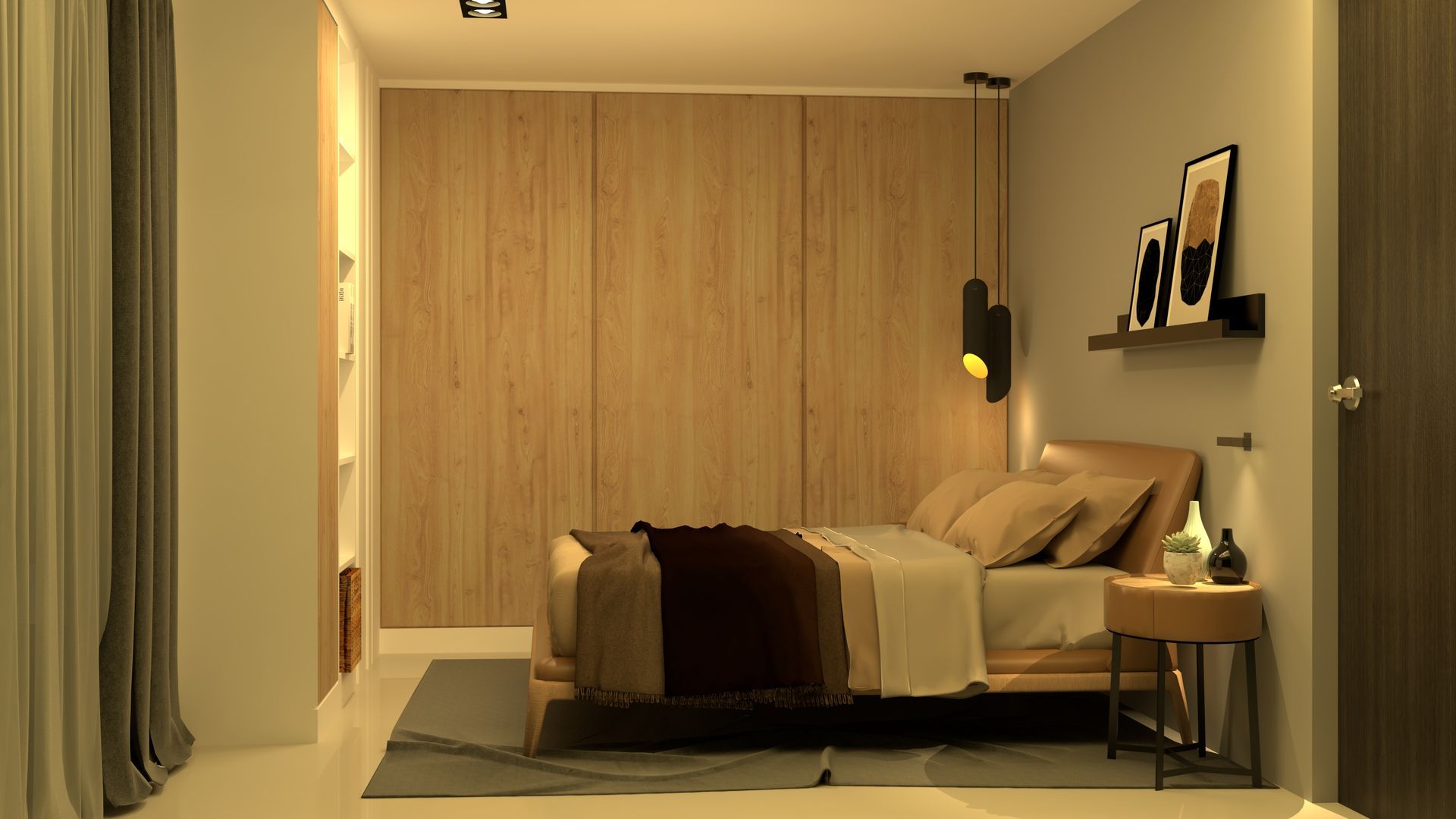 私領域延續整體語彙,以淺木紋櫃體圍塑沉靜氣息,搭配間接照明與織品層次,打造舒適宜人的休憩空間。床頭牆以簡潔線條與柔和色調鋪陳,結合隱藏式收納,讓視覺更顯純粹。透過材質比例與光影安排的細膩拿捏,使居所不僅回應日常機能,更承載生活的溫度與質感。