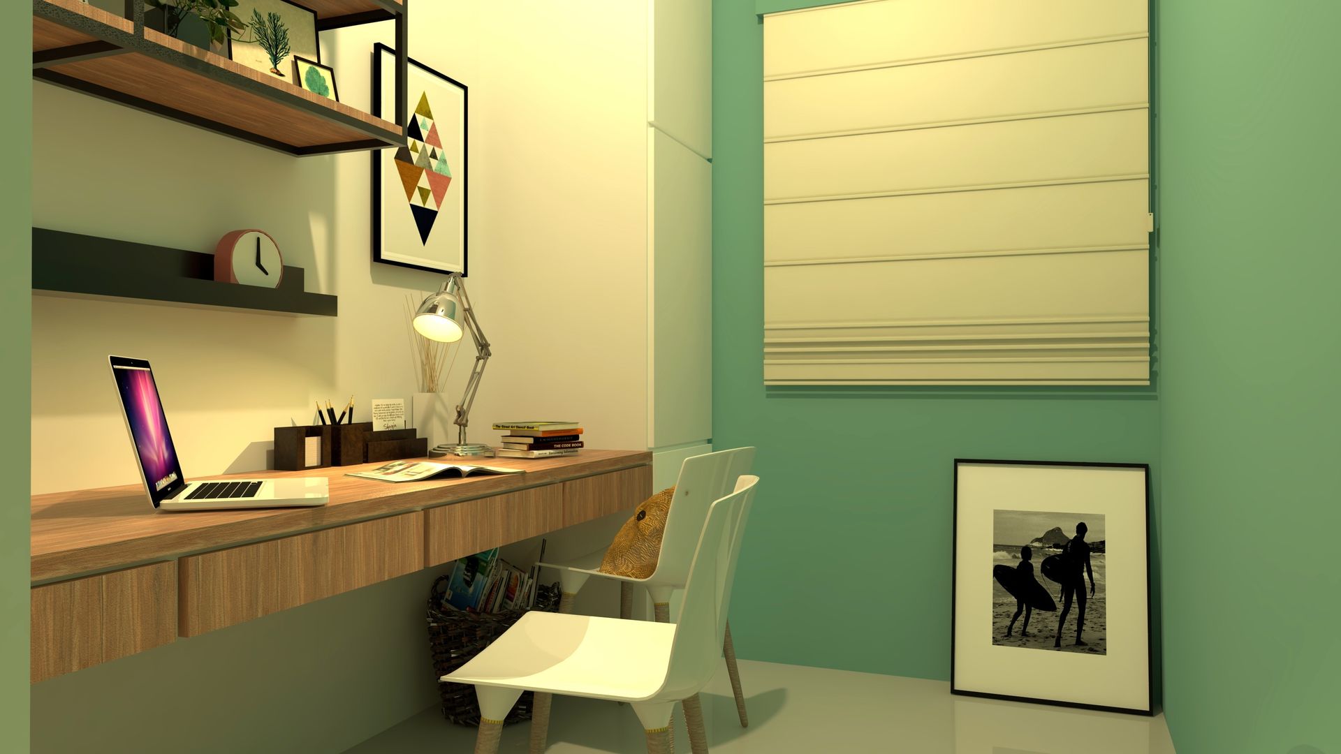 書房與收納空間強調機能整合,利用開放式格櫃與隱藏式櫥櫃交錯配置,兼顧美感與實用性。窗邊臥榻設計提供閱讀與休憩角落,綠色跳色櫃體增添空間活力,使整體在簡潔基調中更顯層次變化,打造高效率且舒適的生活場域。