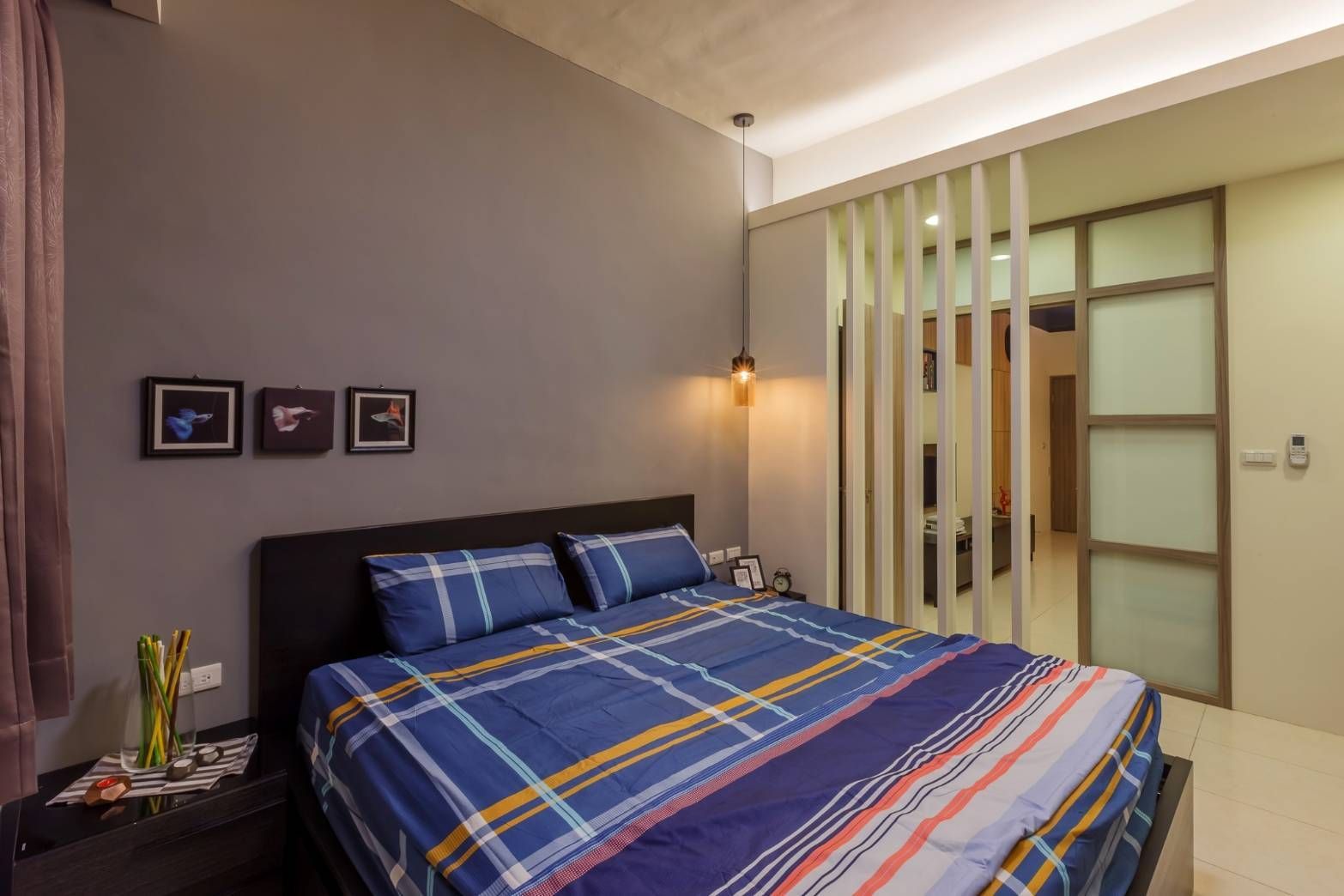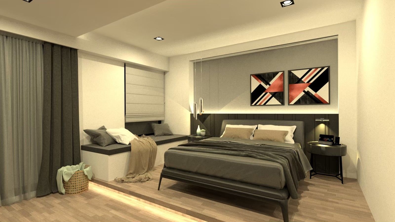 臥室延續沉靜基調,選用暖灰色牆面與柔軟織品,搭配懸吊燈光營造溫暖光暈,創造放鬆舒眠的私密場域。窗簾與床組色彩彼此呼應,細節中展現設計巧思;床頭櫃與層架機能完善,使空間在美感之外兼具實用價值。