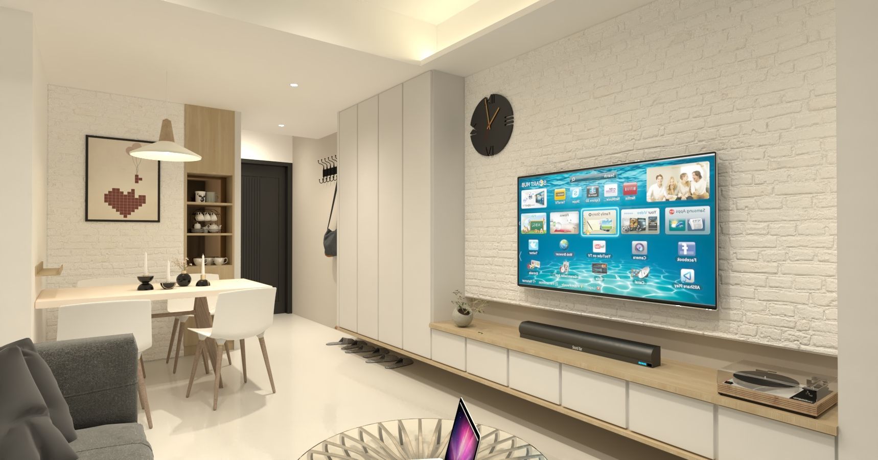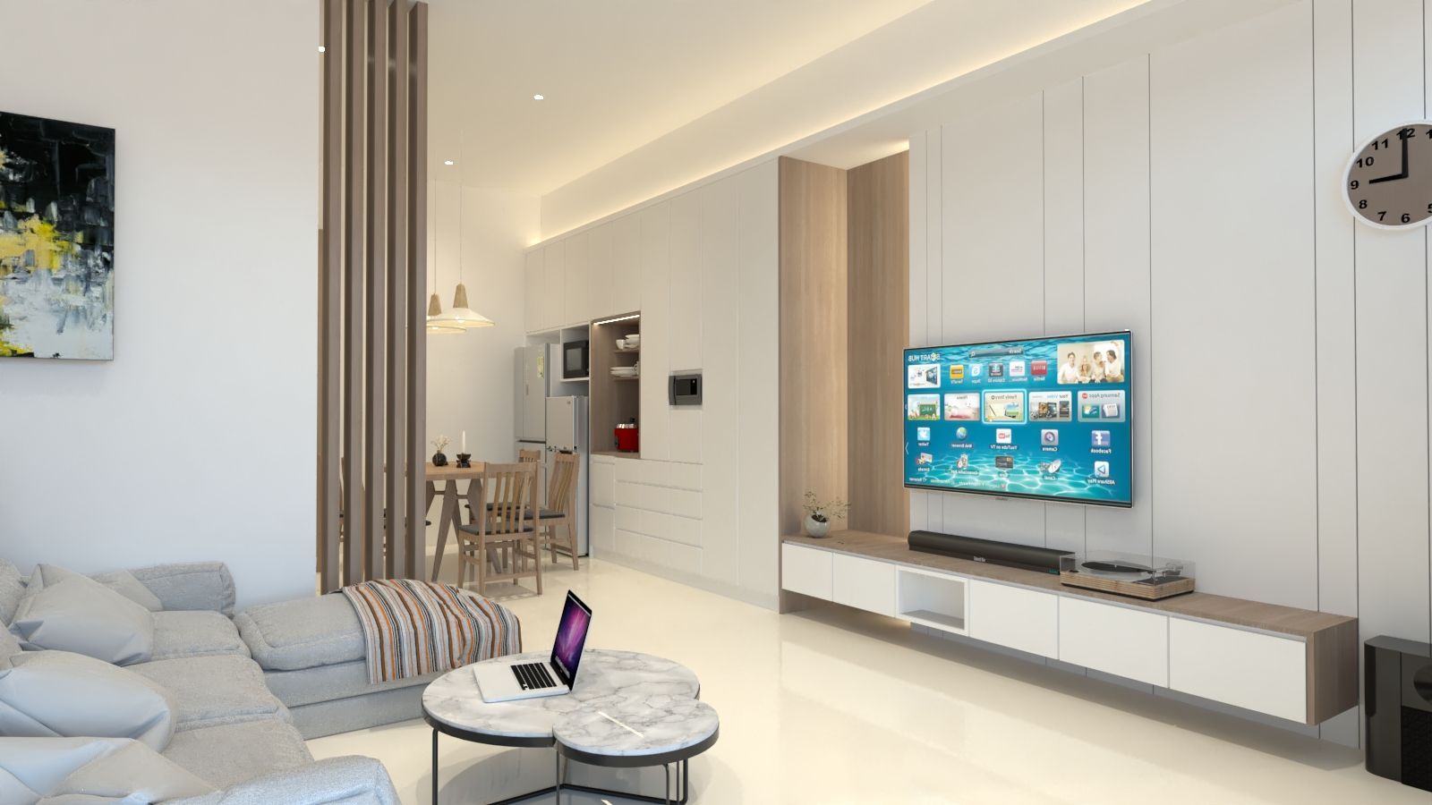 公共空間採開放式配置,客廳與餐廳自然銜接,透過動線整合提升空間使用效率。電視牆選用白色文化石材質,增添細緻紋理,搭配懸浮式木質收納櫃,使視覺更加輕盈;餐廳區則以溫潤木作與簡潔吊燈,形塑日常聚餐的溫馨場景。