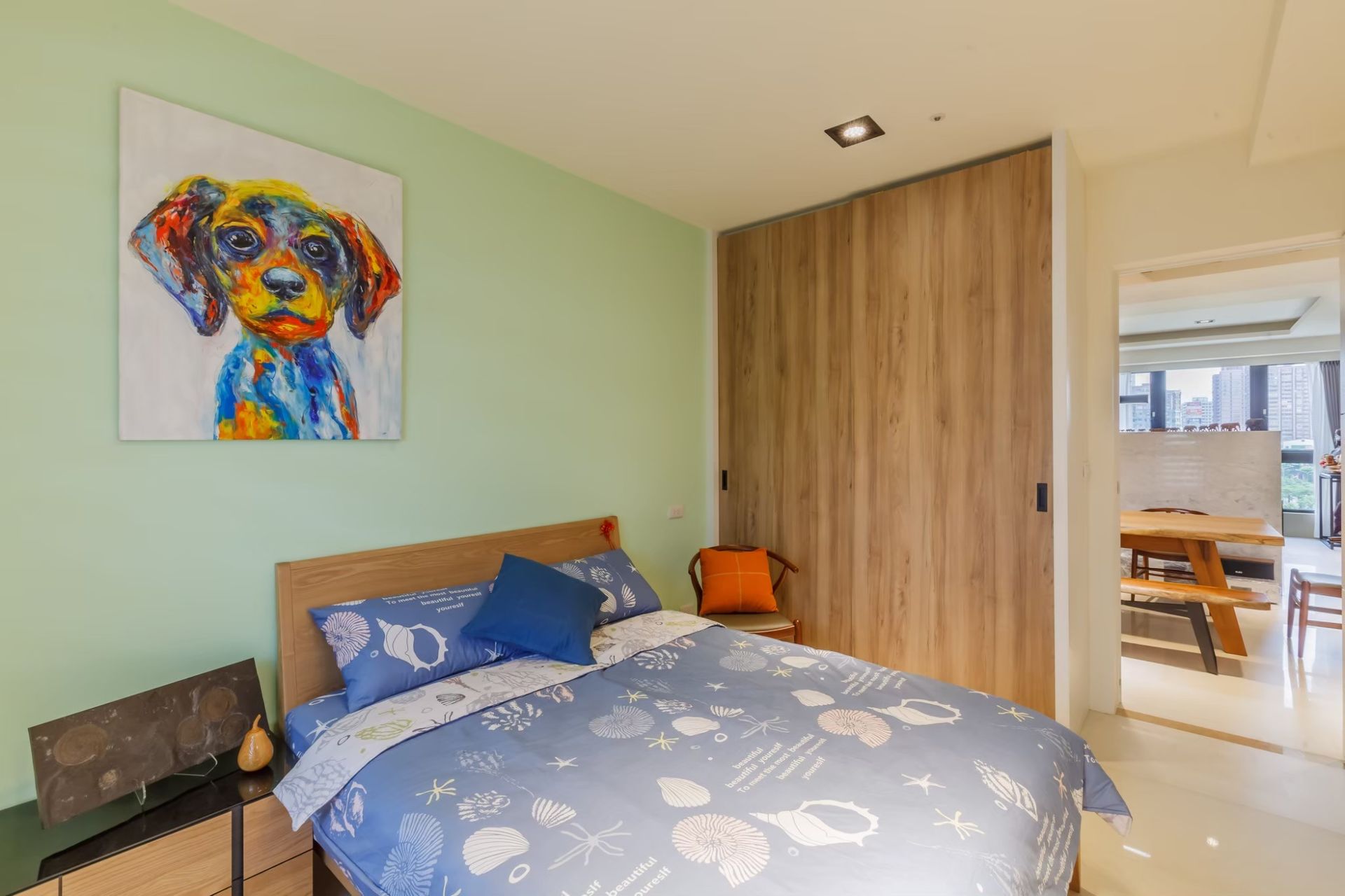 私領域則轉為柔和色調,以淺木與清新的綠色牆面鋪陳寧靜氛圍,搭配溫潤光源與藝術畫作點綴,讓臥室成為放鬆與沉澱的場域。整體設計在理性結構與感性細節之間取得平衡,讓空間既展現成熟質感,也保有日常生活的溫度與自在。