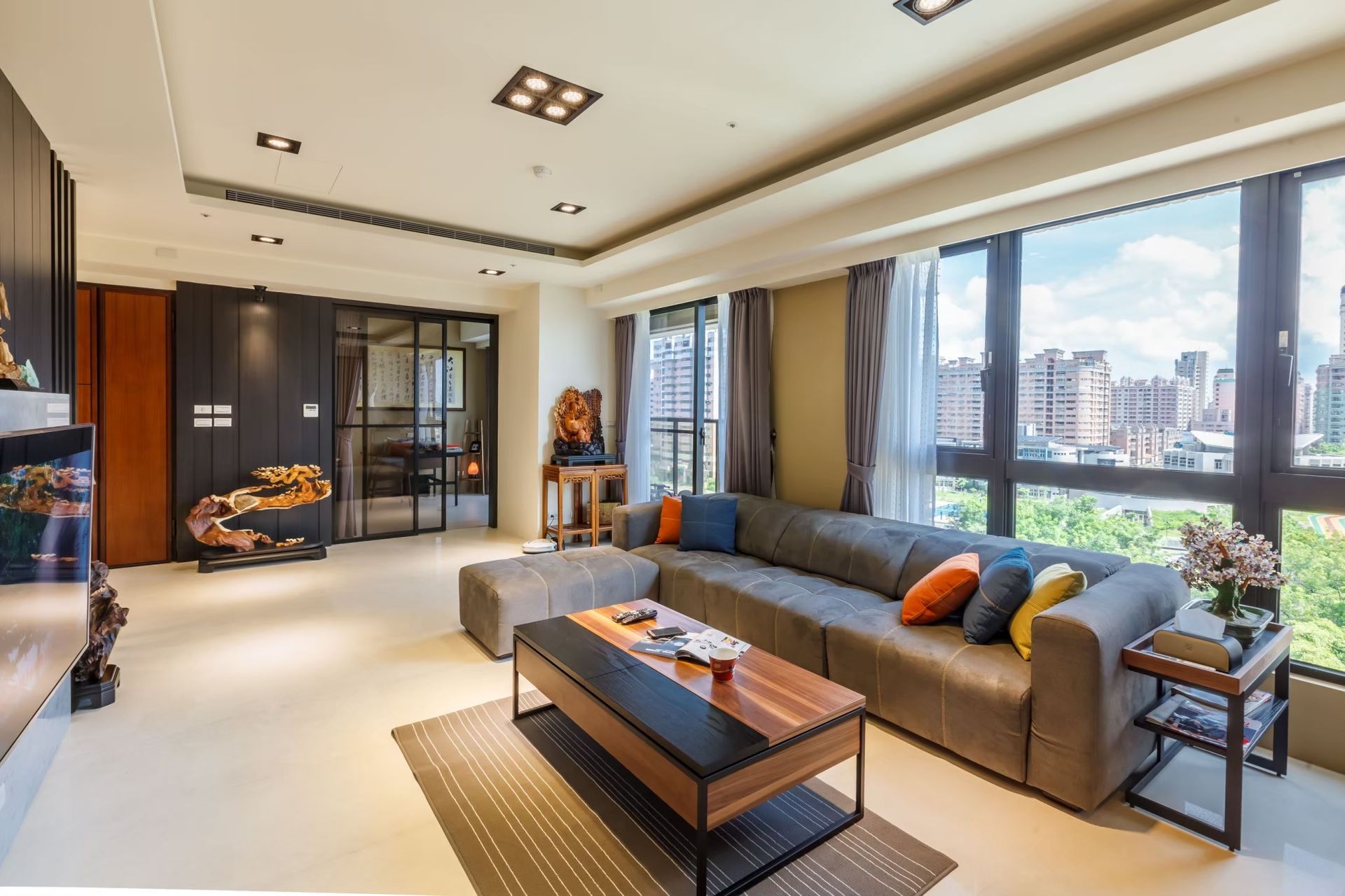 書房引入大面採光,讓城市綠景成為生活的一部分,結合書法作品與木質家具,傳遞內斂而具文化底蘊的生活態度。