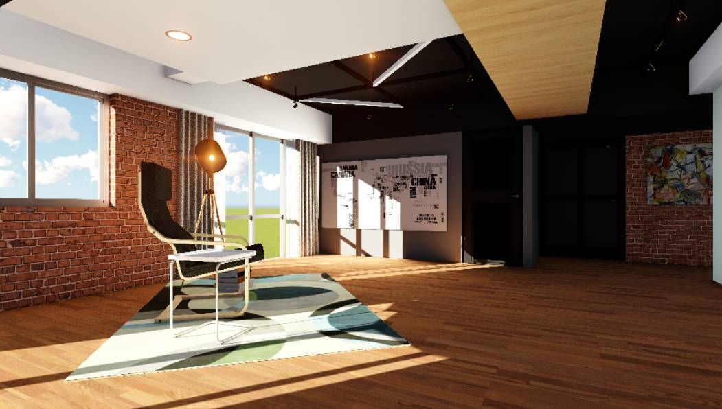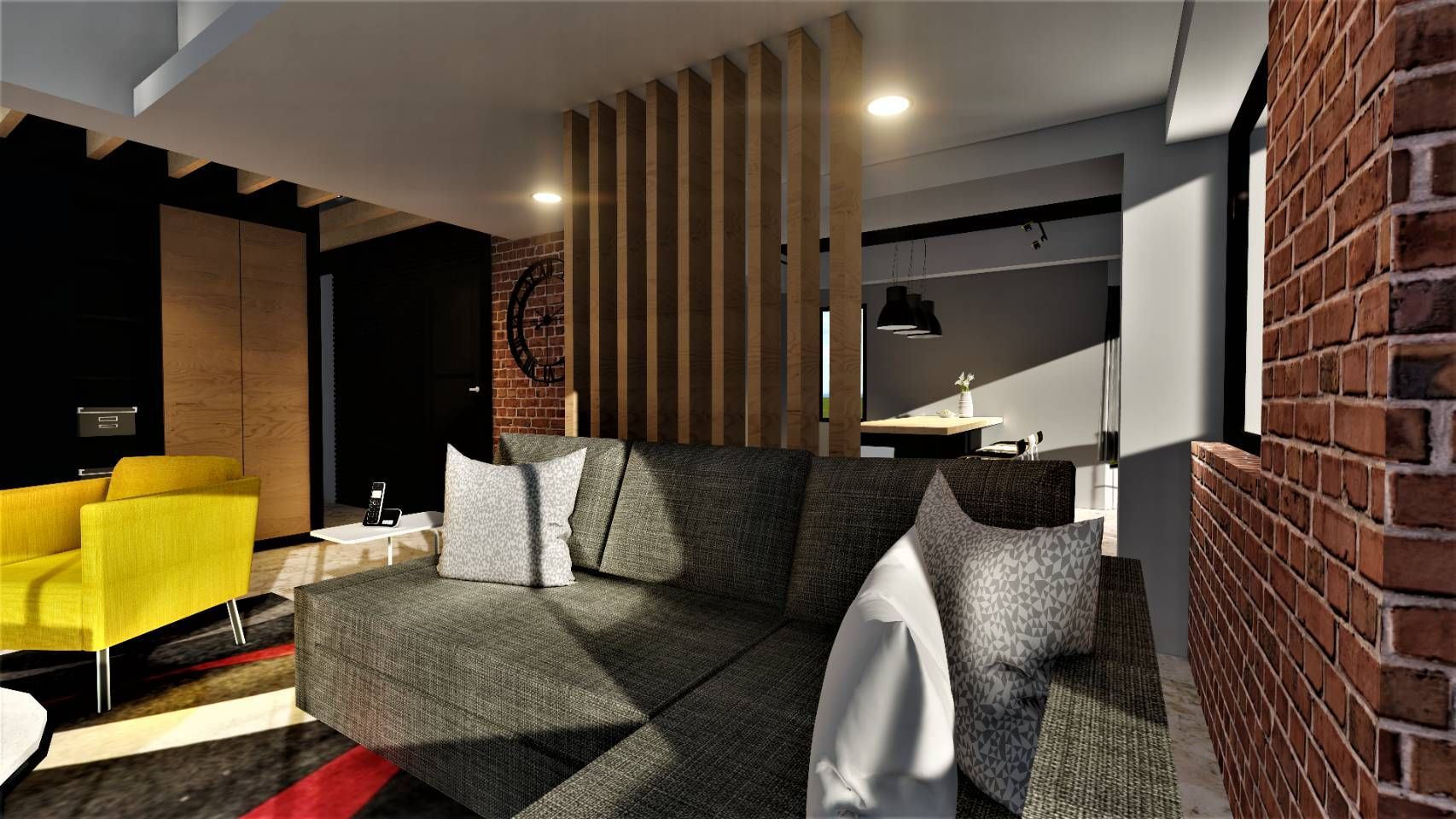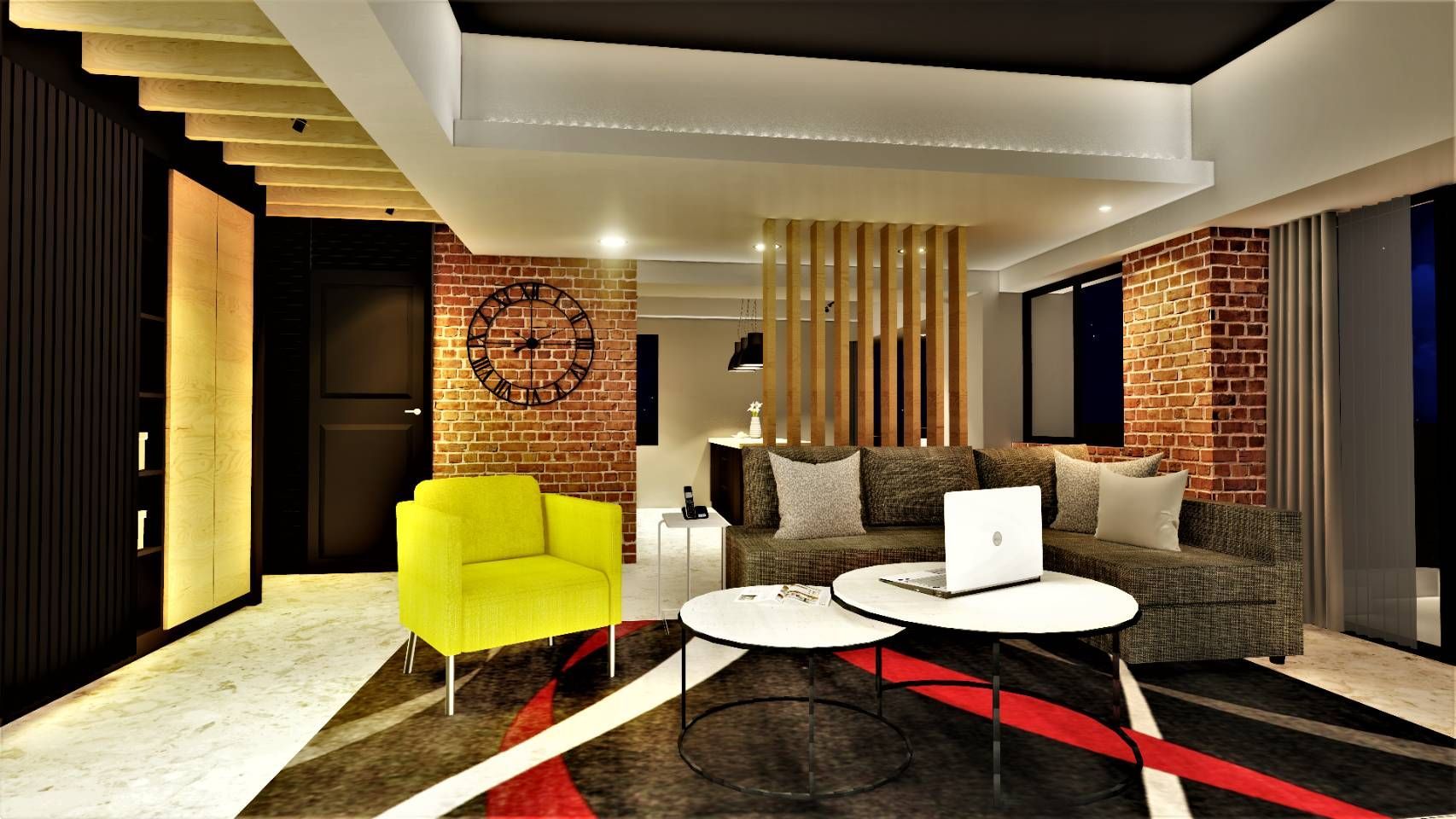 本案以現代工業風為主軸,融合溫潤木質與紅磚元素,形塑率性卻不失溫度的居家氛圍。客廳運用裸露紅磚牆與黑色鐵件語彙,搭配線性燈光與層次天花設計,勾勒俐落輪廓。亮黃色單椅成為空間視覺焦點,為沉穩色調注入活力,展現屋主鮮明個性與品味。